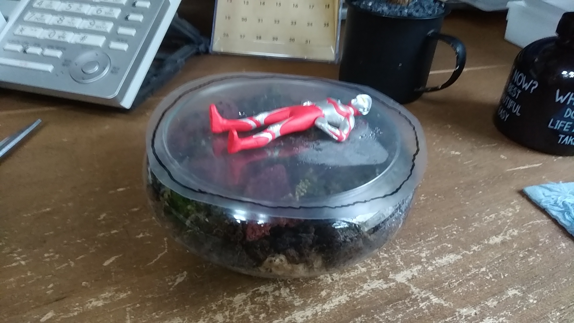 その後のコケリウム ウルトラマン編 ゴールデンウィ-クにちょっぴりはまったコケ しばらく ファイルを切って蓋に たまに霧吹きして今はこの状態 うっすら新芽がでて増えてきたような気が結構 奥が深いコケ とういうのは(*^^*)また報告しますコケリウムリストひがしぐち たかし