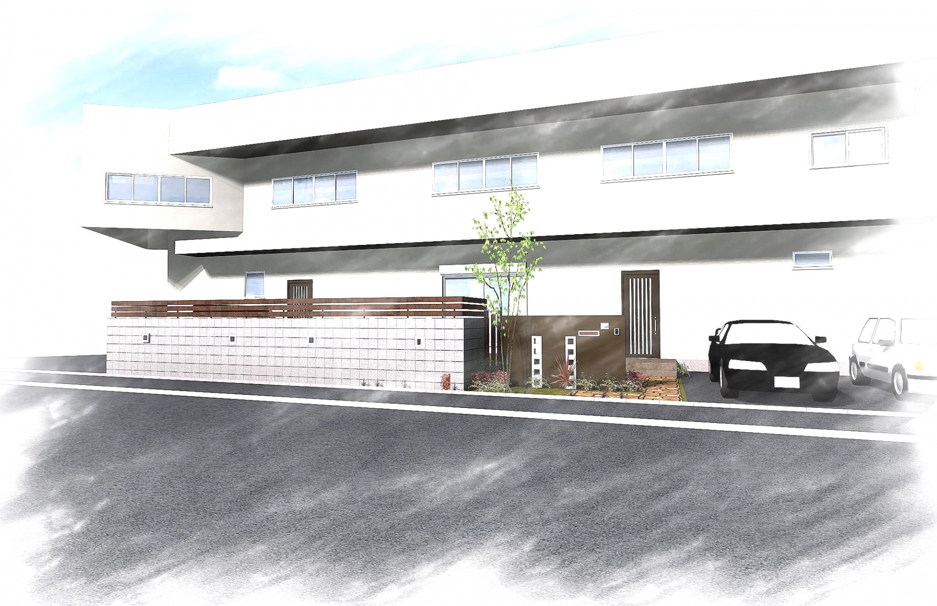 ホワイトカラーの建物にブラウン系のウッドフェンスを併用した