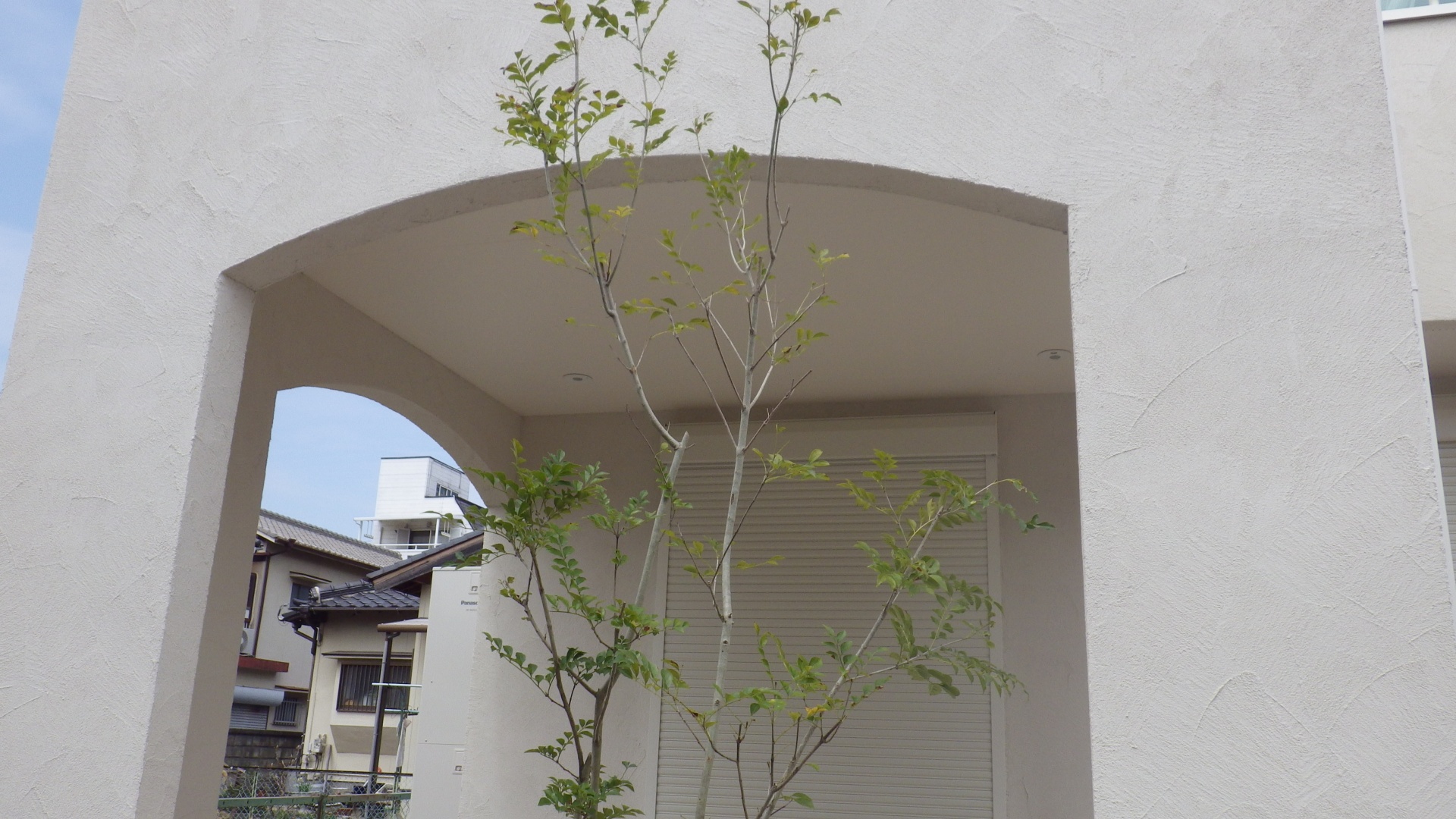 広いタイルテラススペース前に植栽の植え込みも完了し、まずは一期工事完了です。