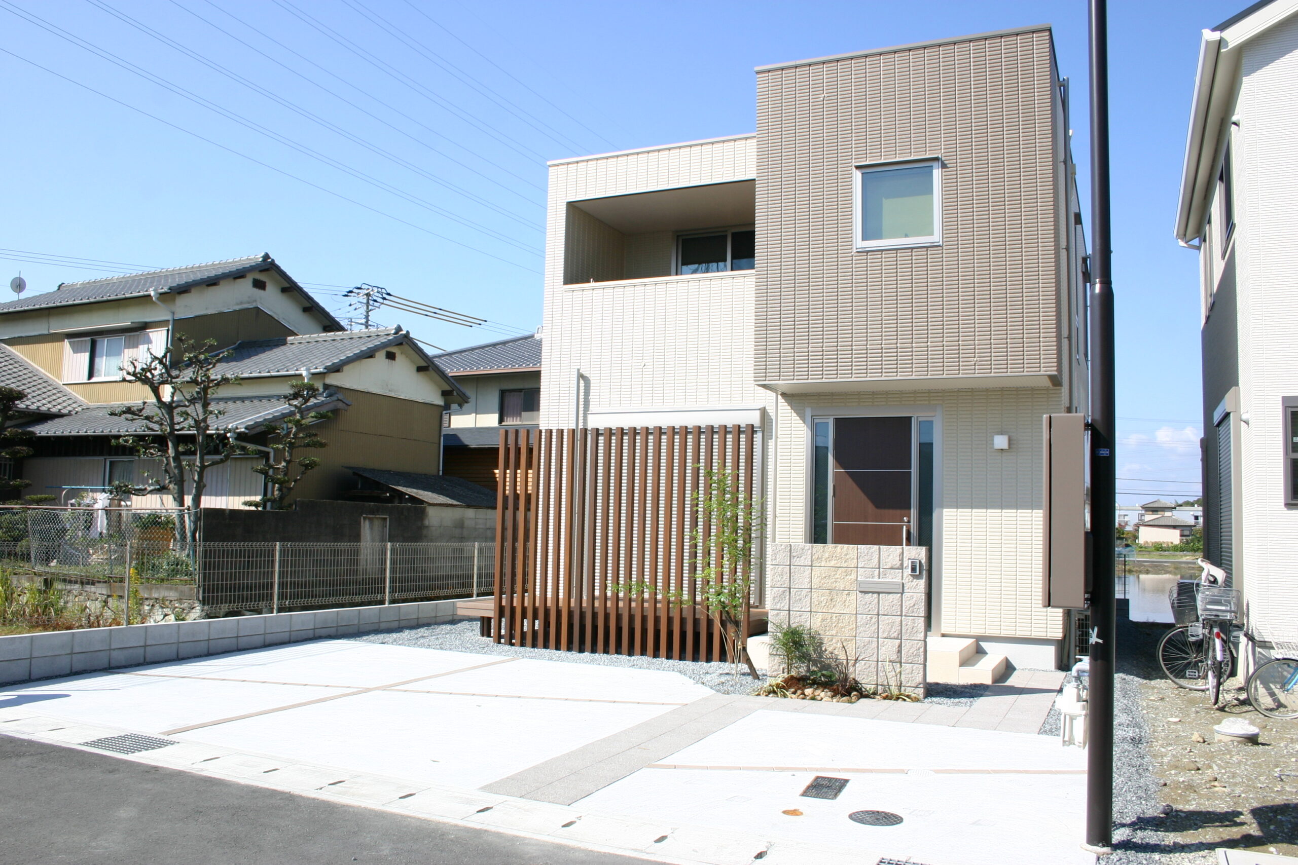 ウッド 縦 スリット フェンス 目隠し 姫路 エクステリア屋さん 木製のウッド角柱を スリット状にに立ててみました 角度により適度な目隠しの効果が得られますウッドデッキ 目隠し工事は 姫路・太子のエクステージまでひがしぐち
