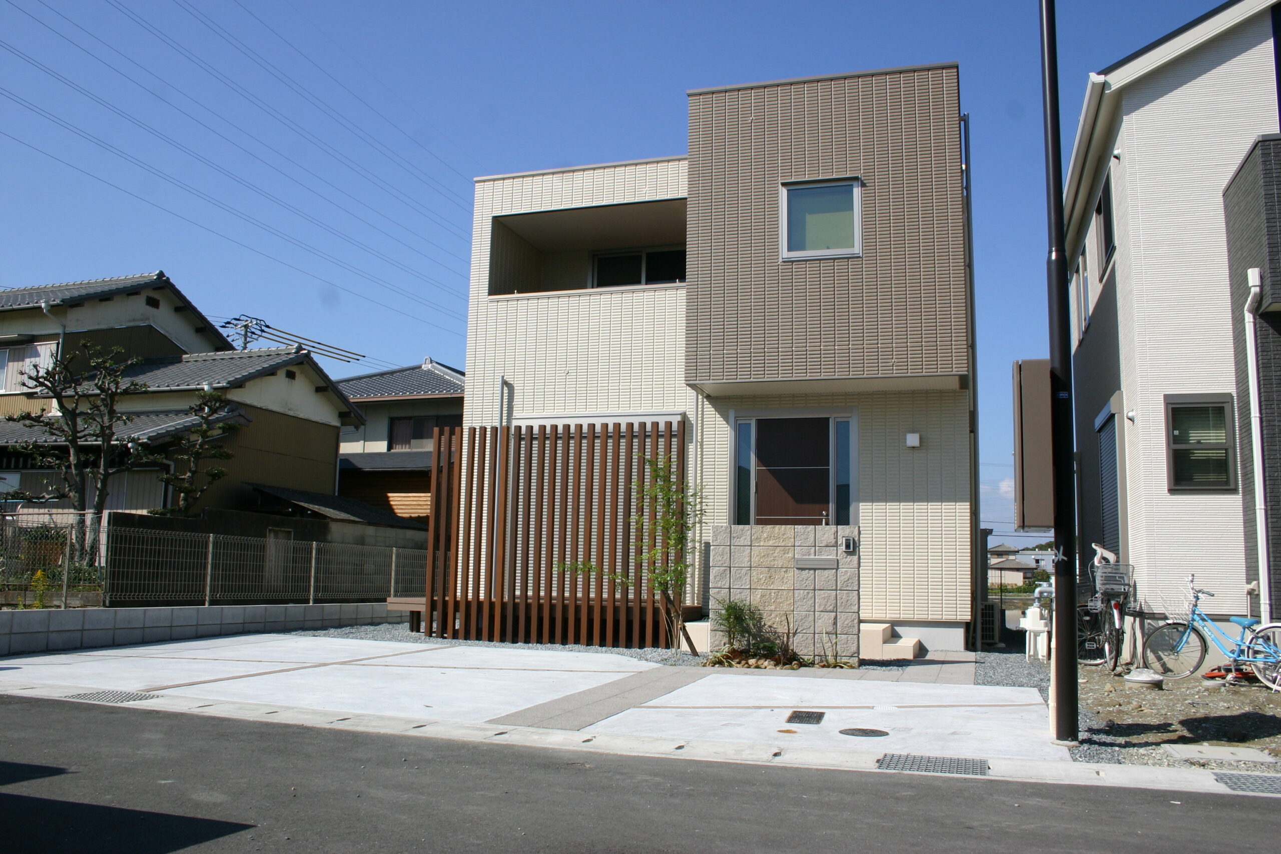 姫路市 ウッド角柱によるスリットフェンス リビング前の目隠しフェンスデザイン 木製のウッド角材を連続配置 角度による目隠しの効果が得られます シンボルツリーのグリーンがウッドのブラウンのコラボで美しいです 姫路市のエクステリア工事は各種1級施工管理技士の現場監理する太子のエクステージにお任せくださいひがしぐち
