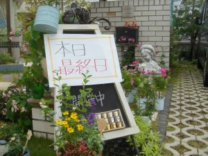 イベント情報 Exstage サンクスフェア2009 2009年秋エクステージでは、ガーデニング季節に合わせてお庭好きにはたまらないイベントを開催いたしました。お陰さまで大盛況で終わりましたサンクスフェア長いようで短かった4日間をダイジェストにてまとめました。多数のご来店ありがとうございました。いよいよ始まります 嵐の前の静けさ・・ 種類豊富な花苗 看板娘ののぞみちゃんも見守ってくれてます 花苗を買われていざ第二ステージへ こちらも大盛況 お母さんも安心して植え込み出来ます みなさん思い通りに出来たかな? すばらしい! 愛人発覚!?(笑) 高いぞ~ 仲良し姉妹 長かったイベントも・・・ついに 最後のお客様 イベントの熱気で・・・ 花が咲きました♪ 「オツカレサマデシタ」