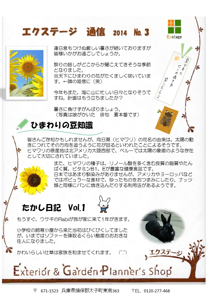 イベント情報 エクステージ通信 2014 No.3 今回でVol.3となりました エクステージ通信この度は夏色で発信させていただいております花の豆知識が 恒例となっており「ひまわり向日葵」を取り上げていますお時間があるときに気軽にお読みいただけたらと思います次回は イベント/感謝祭についての話題が出てきそうです