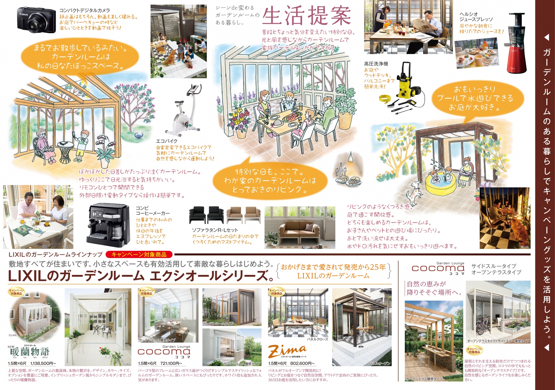 イベント情報 秋のガーデンルームde暮らしUPキャンペーン2013 期間:2013年10月1日(火)~12月16日(月) 対象商品をお買い上げの方に 「シーンで選べる暮らしUPグッズ」または3万円キャッシュバック! または「ガーデンファニチャー」プレゼント