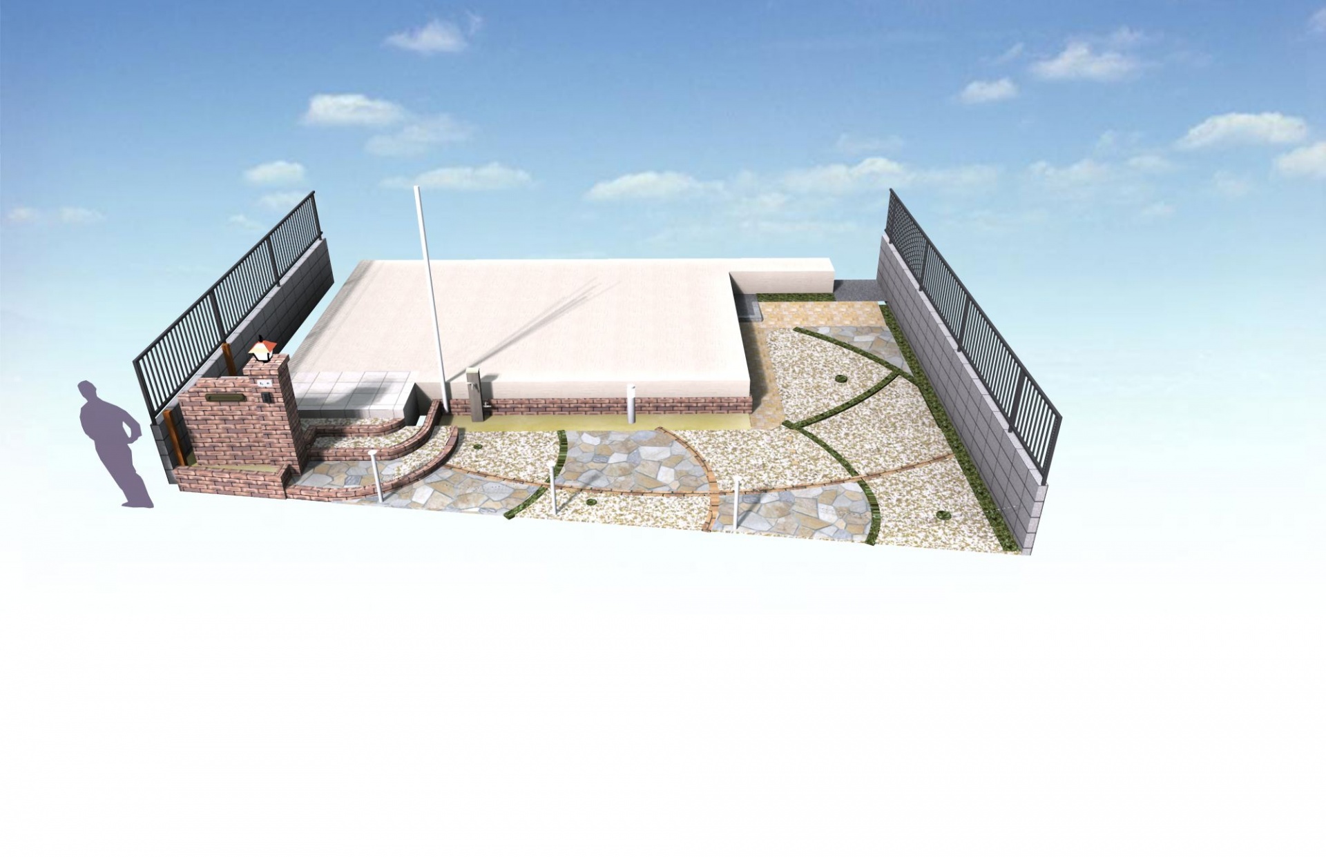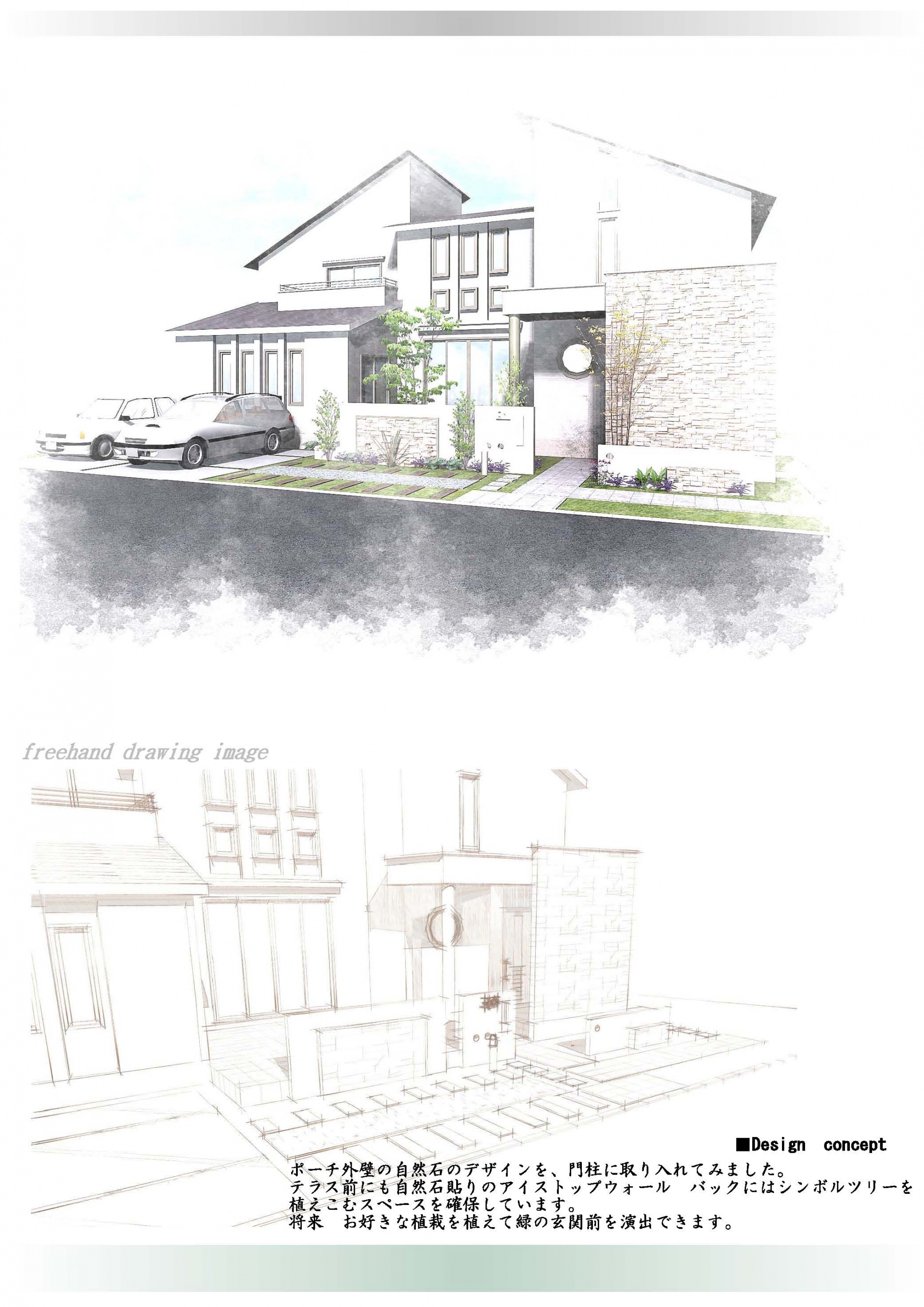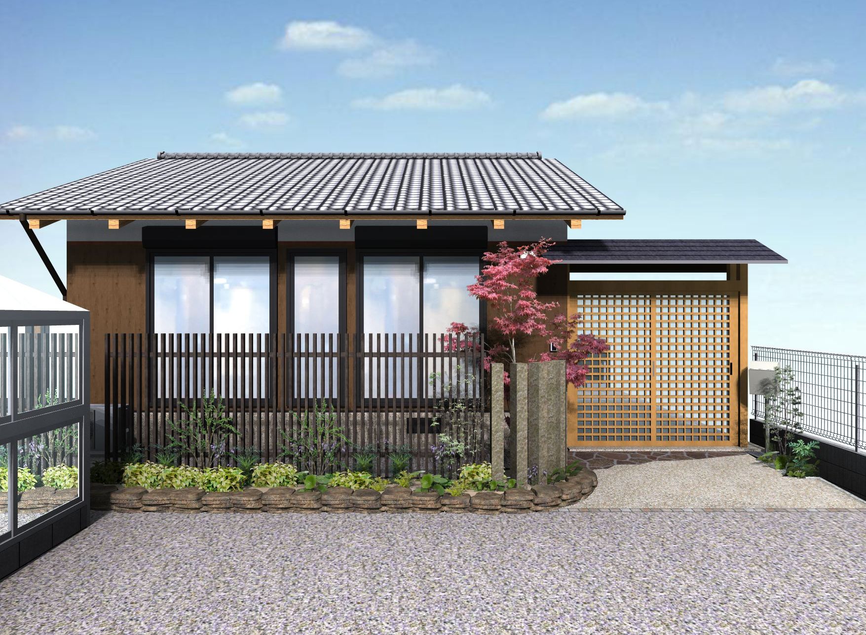 デザインパース集 モダン和風なファサード 平屋の建物を隠し過ぎず、程良く視線を隠せる様にと考えたプランです。 石のコバ積みなど足元はどっしりと構え、格子フェンスや石柱などすき間を取り入れる事で軽くなります。 紅一点、モミジがこのプランの主役です!