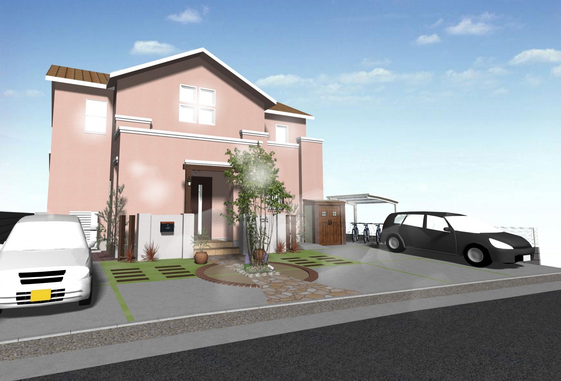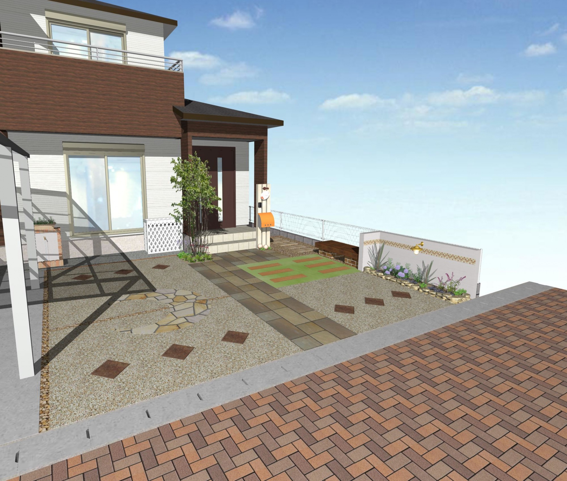 庭要素のある来客用駐車スペースとアプローチ周りをご提案しました。 境界際に塀、ガーデンライトで夜の表情も楽しんでいただけます。