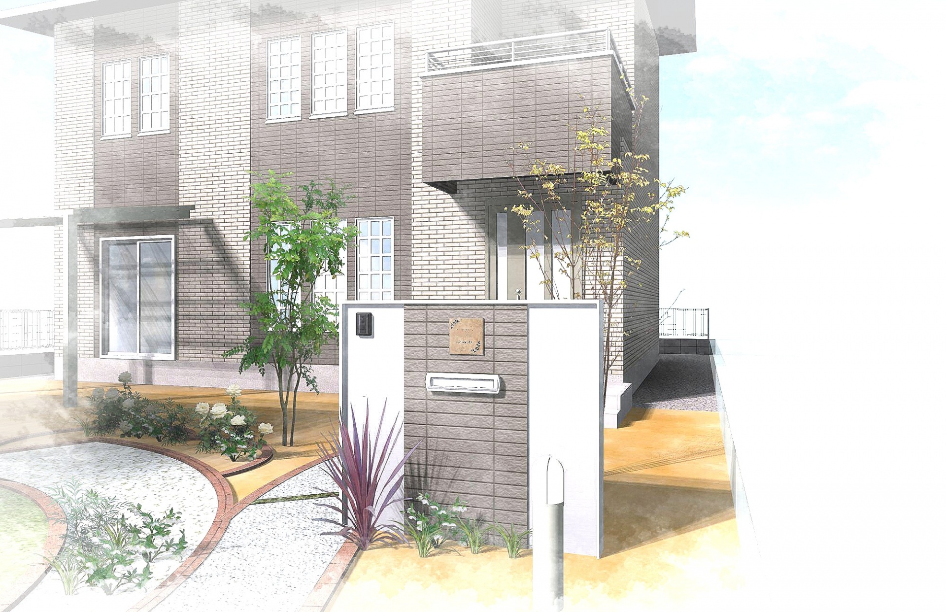 デザインパース集 ブラウンとホワイトのツートンエクステリア ホワイトとブラウンのタイル貼のデザインパース。 門柱デザインに建物のツートンカラーを取り入れたハイセンスなエクステリアデザインです。リクシルのアーキデュオのフラットカーポートが建物の屋根ともリンクしています。 こちらの施工写真はこちら ステンカラーの門柱ボーダーデザイン。建物同色のタイルがポイントです。