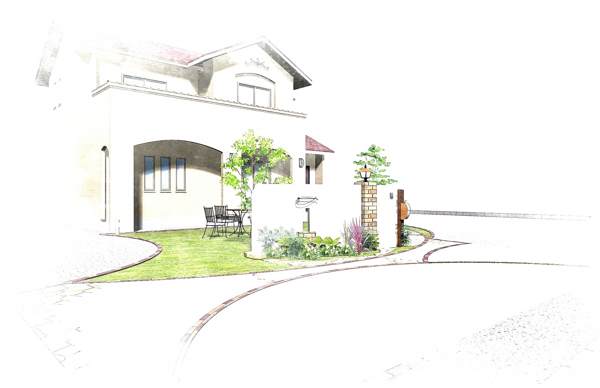 デザインパース集 曲線ウォールのエレガントエクステリア ツインのアーチウォールがポイントのスパニッシュデザイン。 レンガの角柱をポイントにしました。 施工写真はこちら リビング前の広々としたグリーンスペースを門柱にてアイストップデザインに。