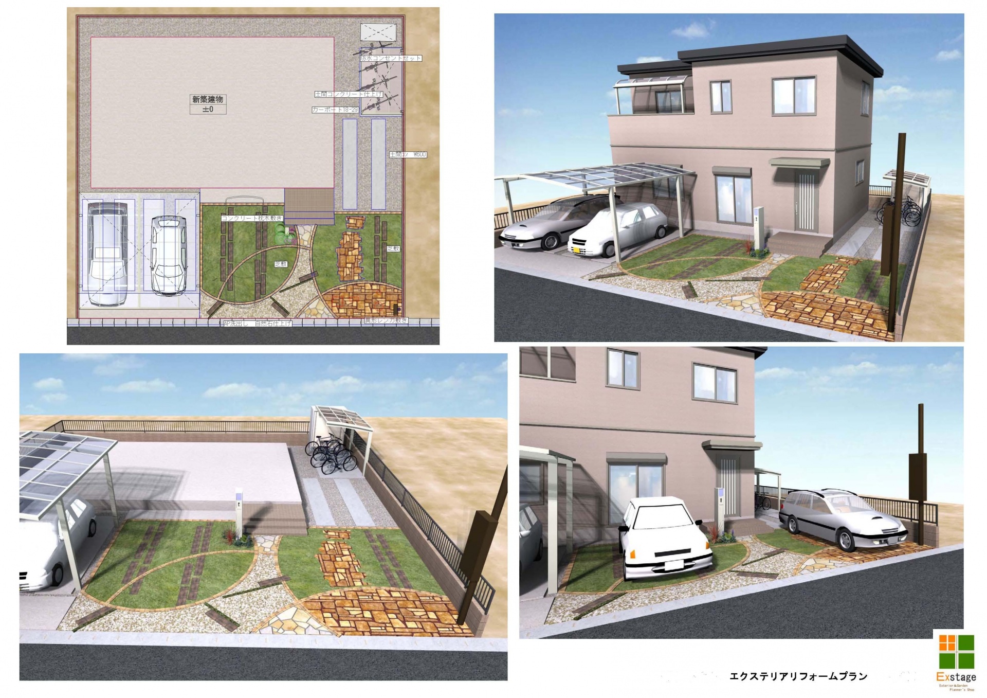 デザインパース集 建物を引き立たせるアメリカンなお庭 道路に面した建物の顔でもある南側を引き立たせるイメージで仕切りのレンガ塀とアメリカンフェンスは低めで設定しました 建物中心より少しずらした位置にシンボルツリーのオリーブを配置することで三角屋根がよりインパクトがでます