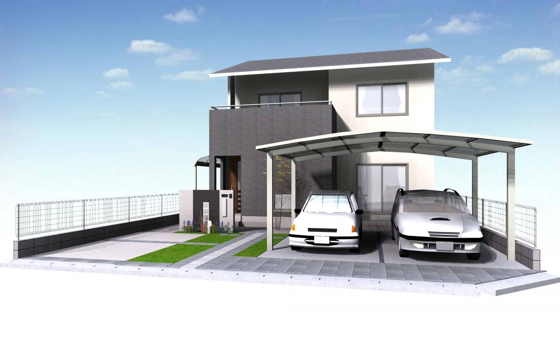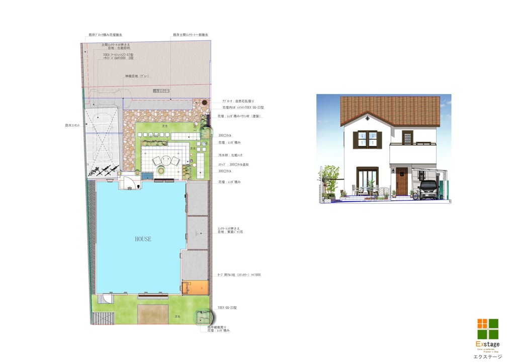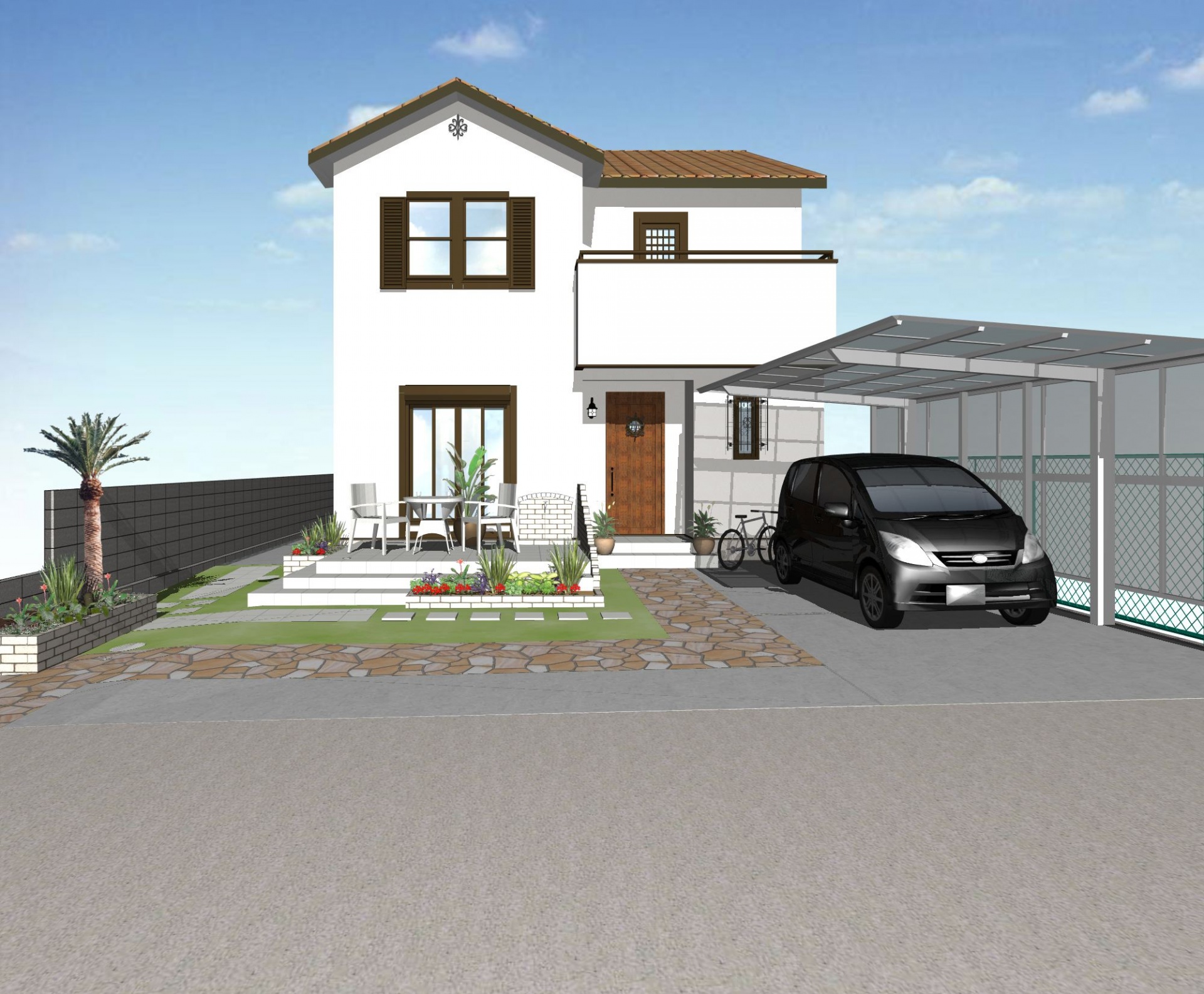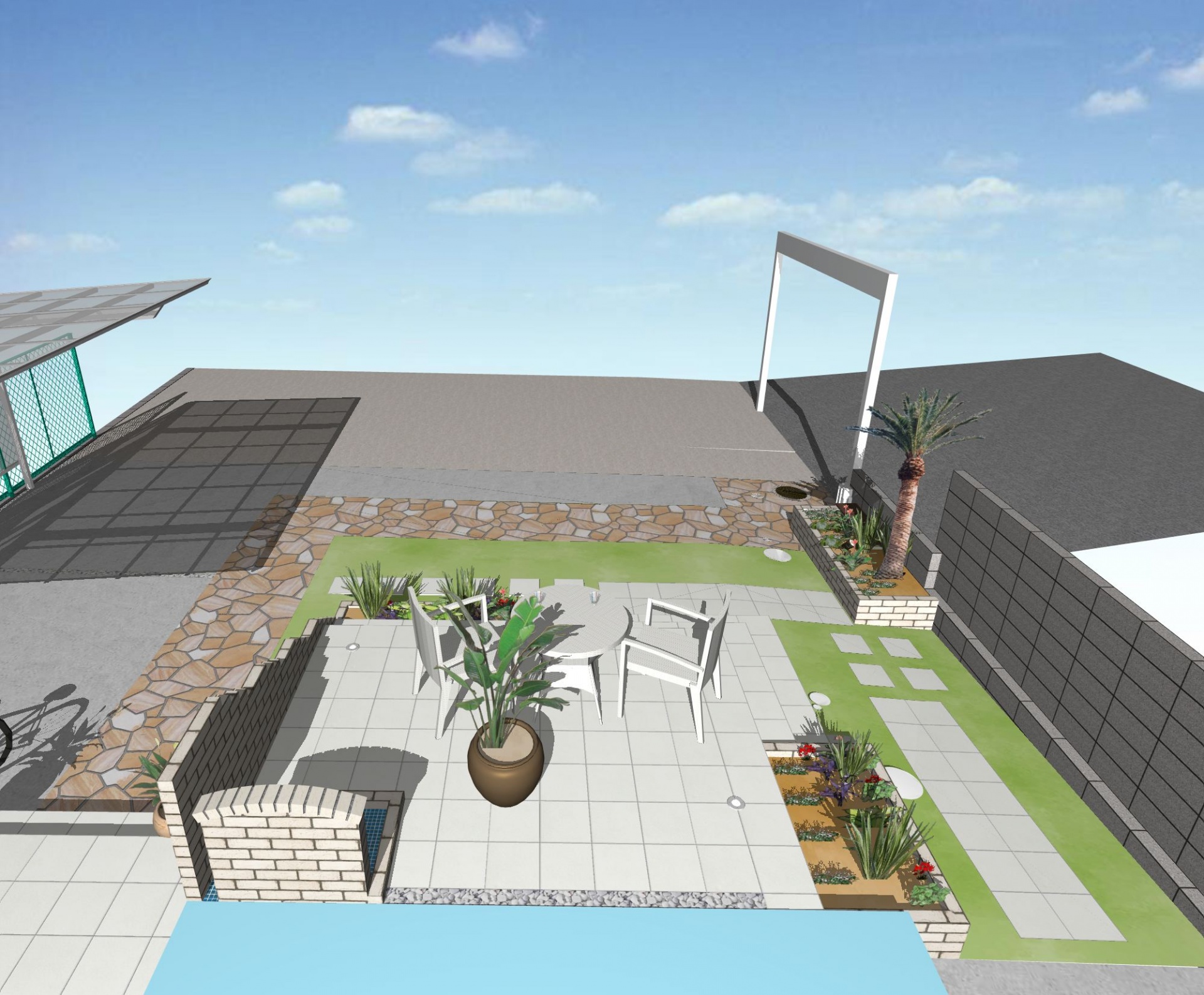 デザインパース集 南国リゾートをイメージしたお庭 南国好きで、海外で色々な景色をご覧になり、自分の庭にもそのイメージを反映したいというお客様のガーデンプランです。 白と緑で統一された中に、ひと際目を引くピンクの自然石乱張りアプローチ。 花壇の植栽もヤシなどを取り入れた、元気の出る花達がにぎやかに咲き誇るイメージでご提案しました。