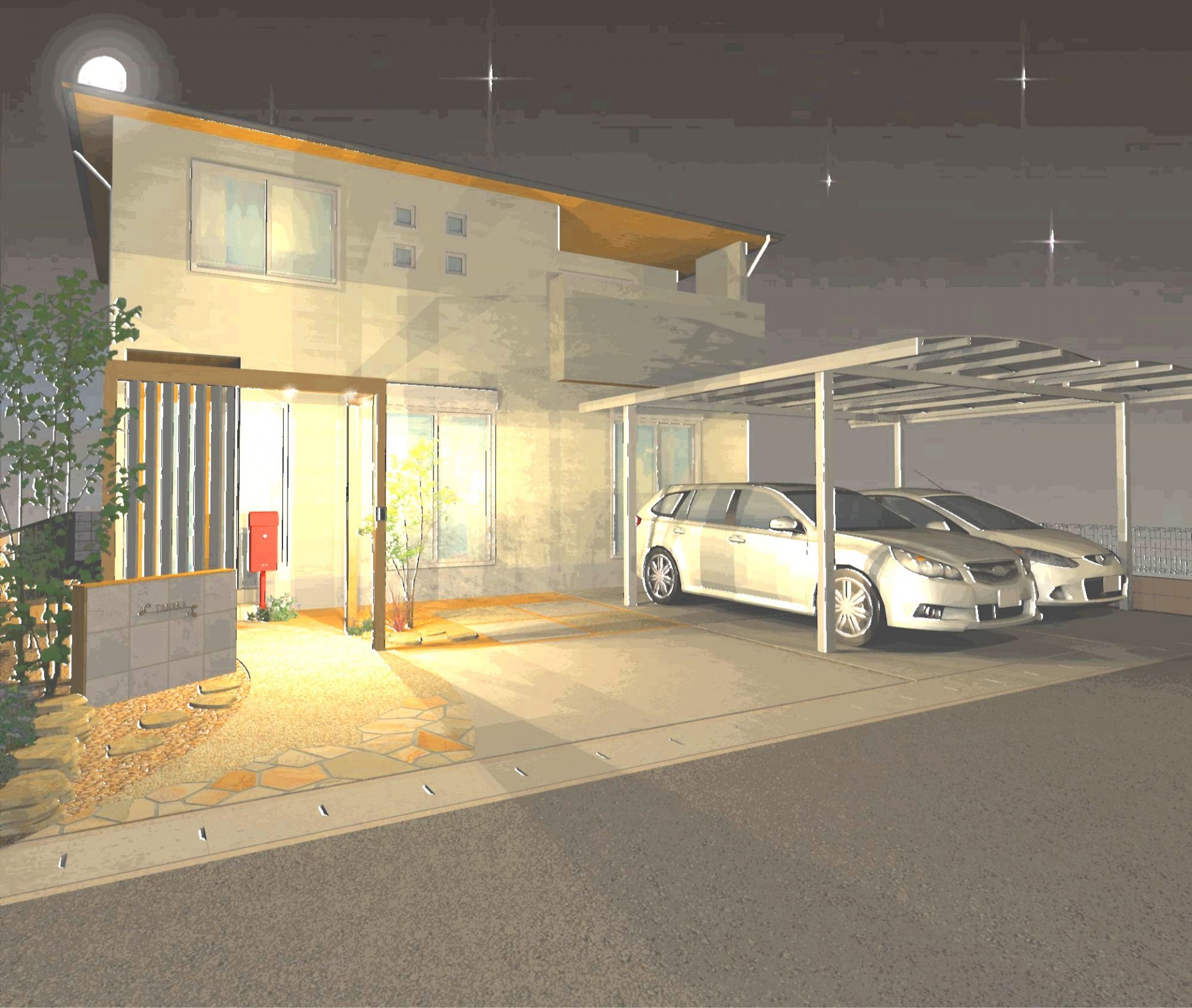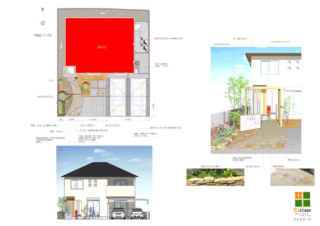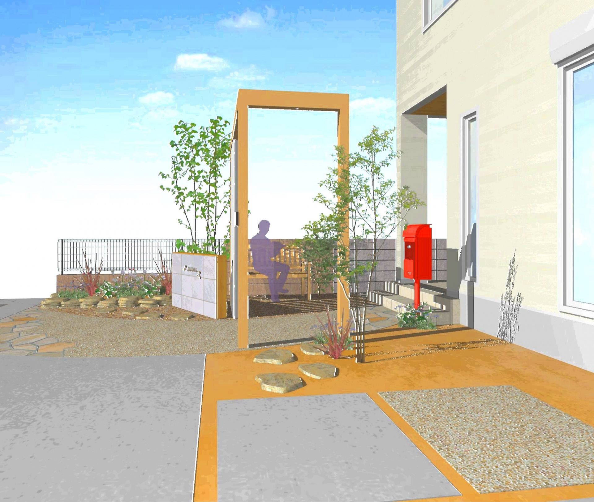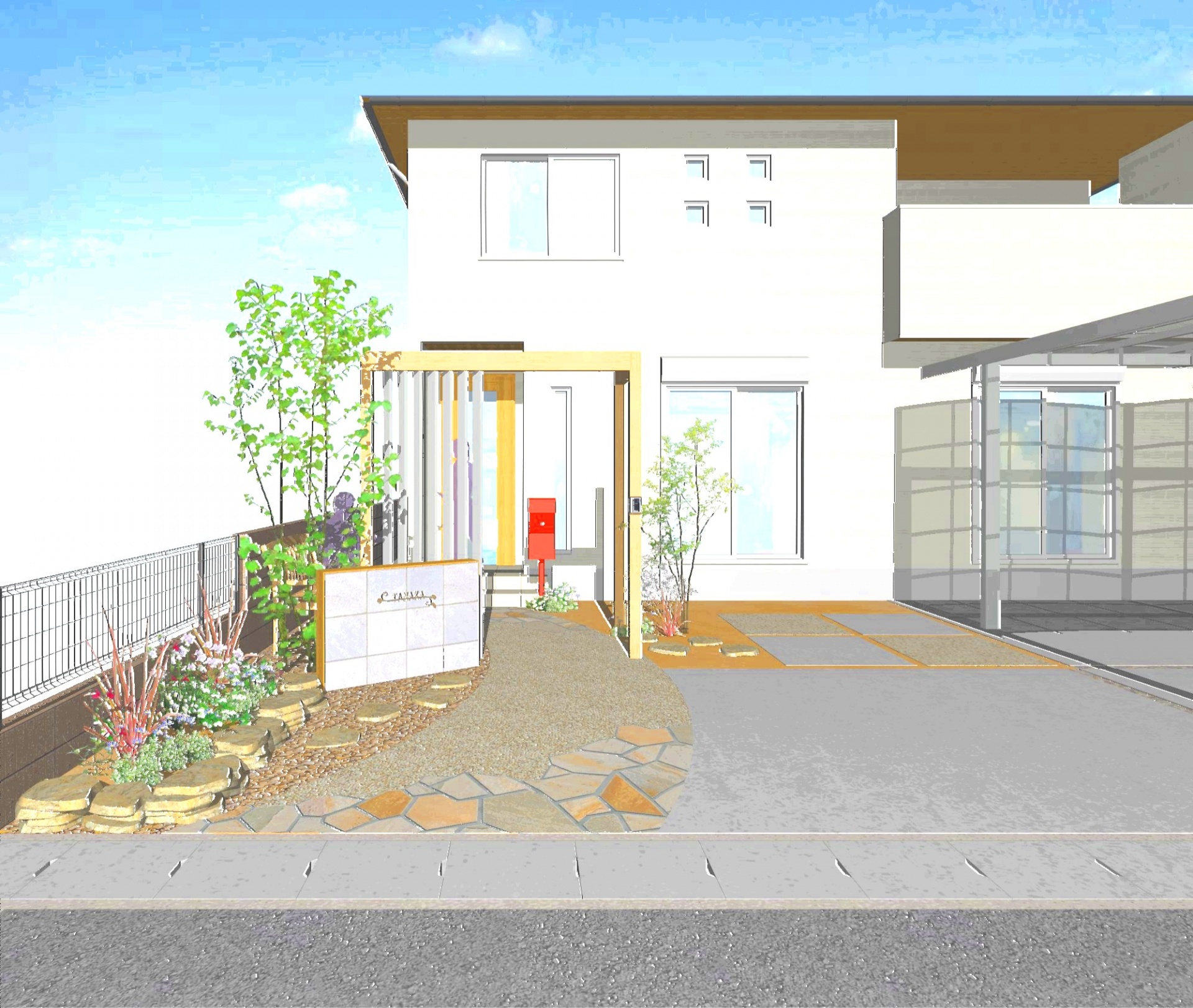 デザインパース集 プラスGでおしゃれに玄関前を目隠し 玄関を開けた時に道路面が丸見えなので、ちょっとした目隠しをご希望されていましたお客様のプランです。 敷地の開口幅、車庫のカーポートにボリュームがあるため、門周りには目隠し効果のあるプラスGで空間をデザインしています。 門柱のみ45°の角度を付け、後ろのシンボルツリーと共に存在感のある門周りになっています。 プラスGも平面的に間取るのではなく、立体的にすることより奥行き感がでています。
