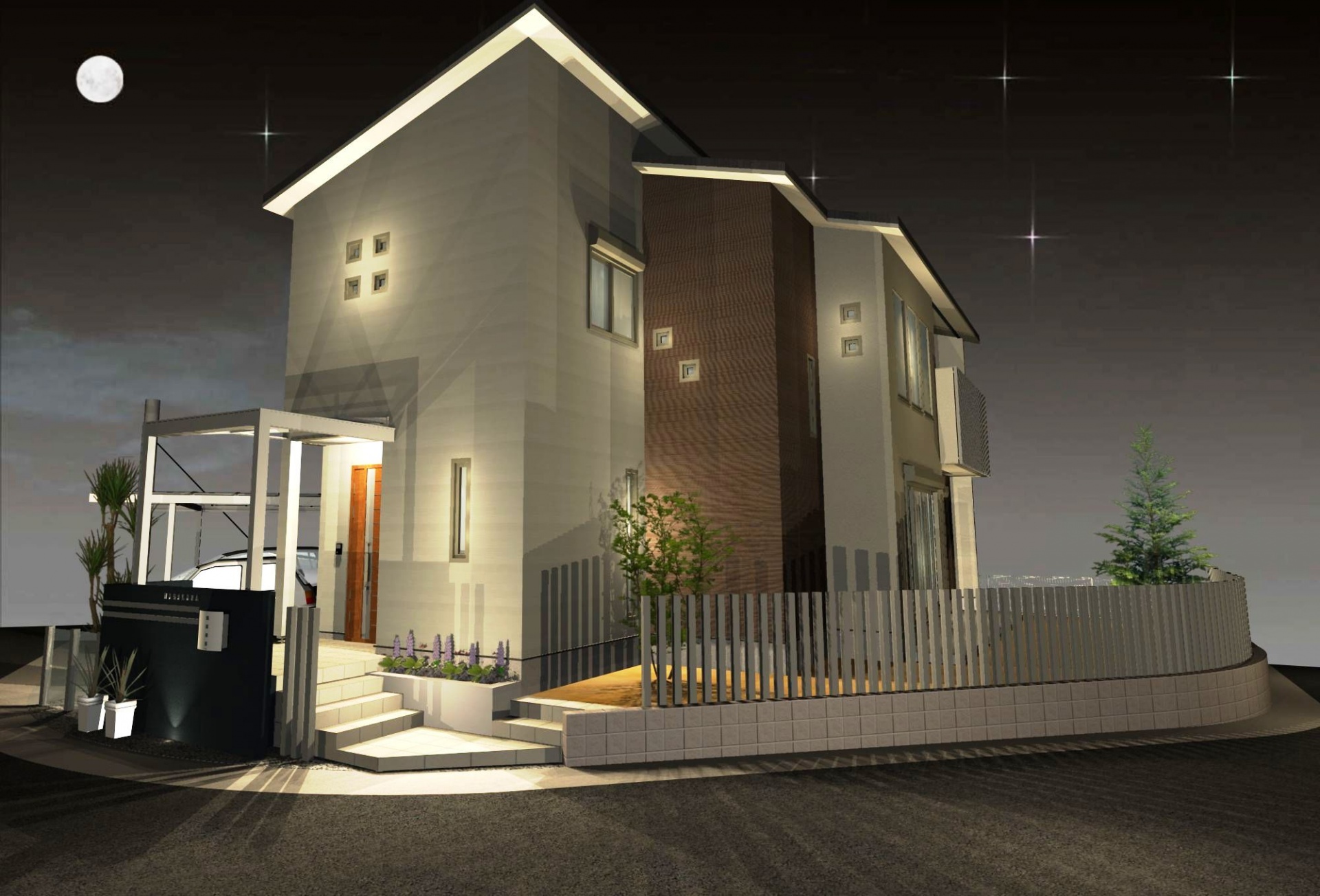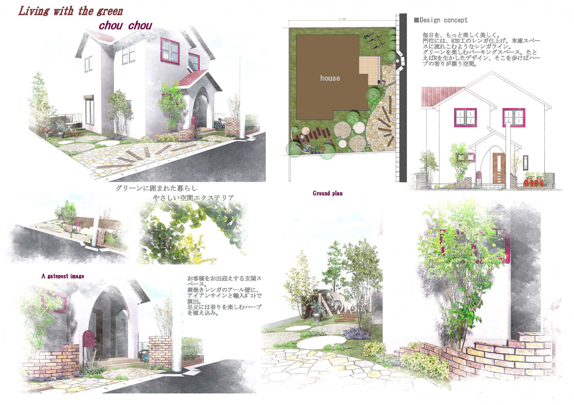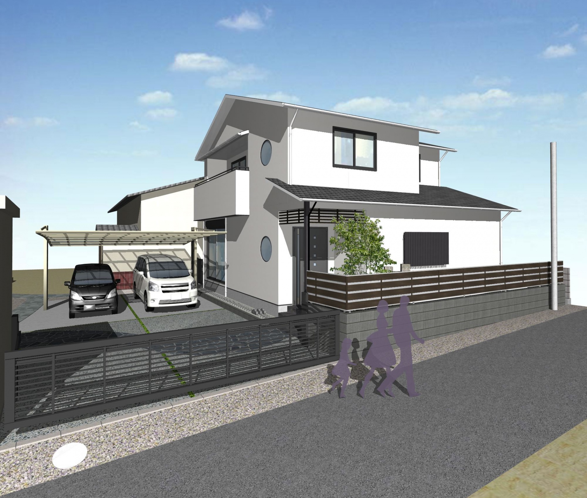 デザインパース集 プラスGでおしゃれに玄関前を目隠し 玄関を開けた時に道路面が丸見えなので、ちょっとした目隠しをご希望されていましたお客様のプランです。 敷地の開口幅、車庫のカーポートにボリュームがあるため、門周りには目隠し効果のあるプラスGで空間をデザインしています。 門柱のみ45°の角度を付け、後ろのシンボルツリーと共に存在感のある門周りになっています。 プラスGも平面的に間取るのではなく、立体的にすることより奥行き感がでています。