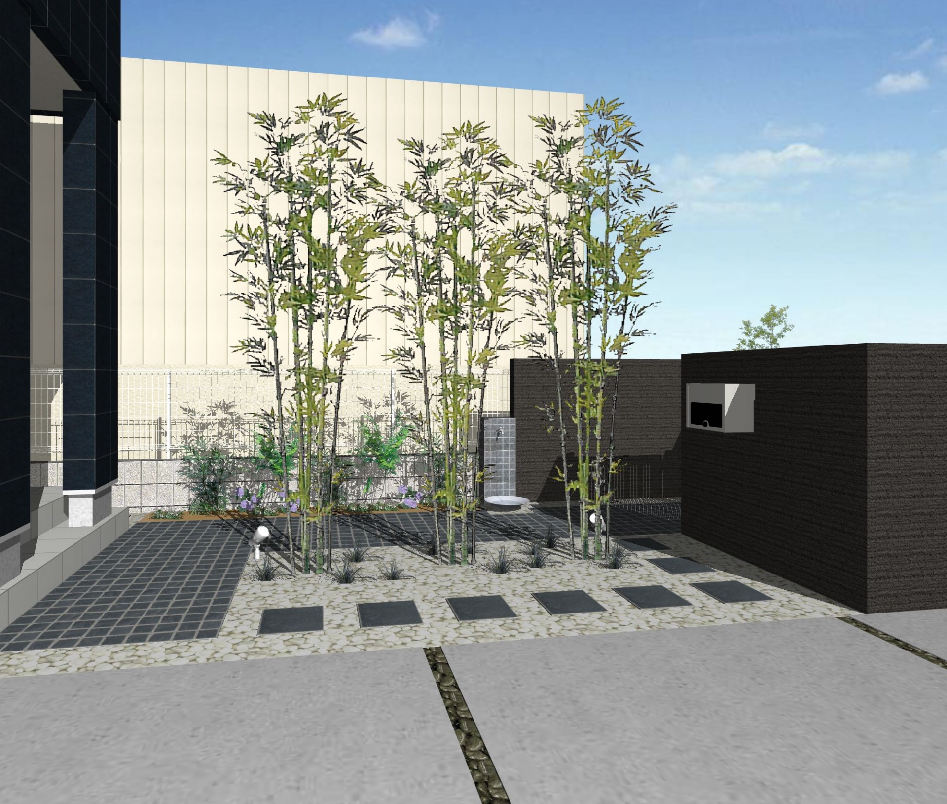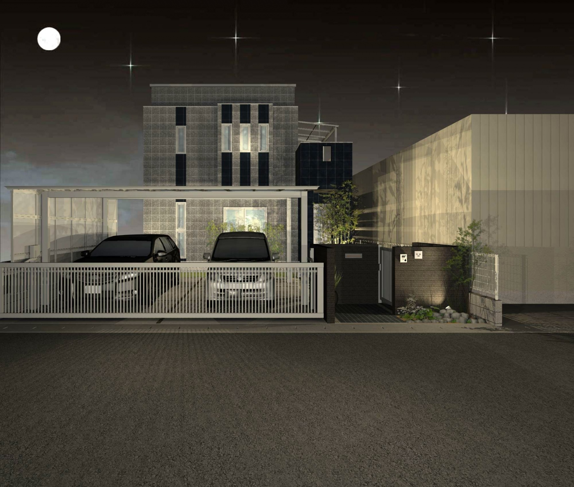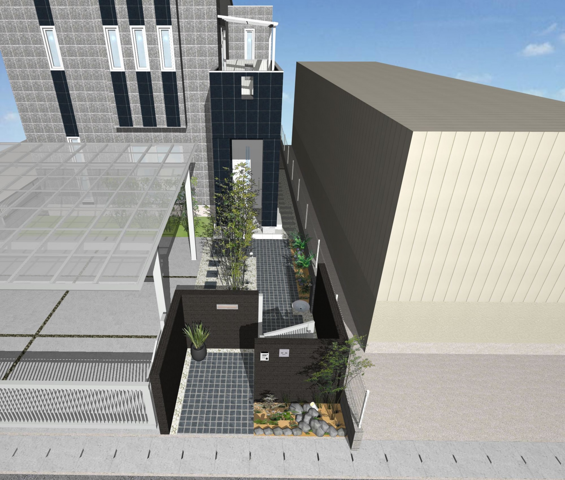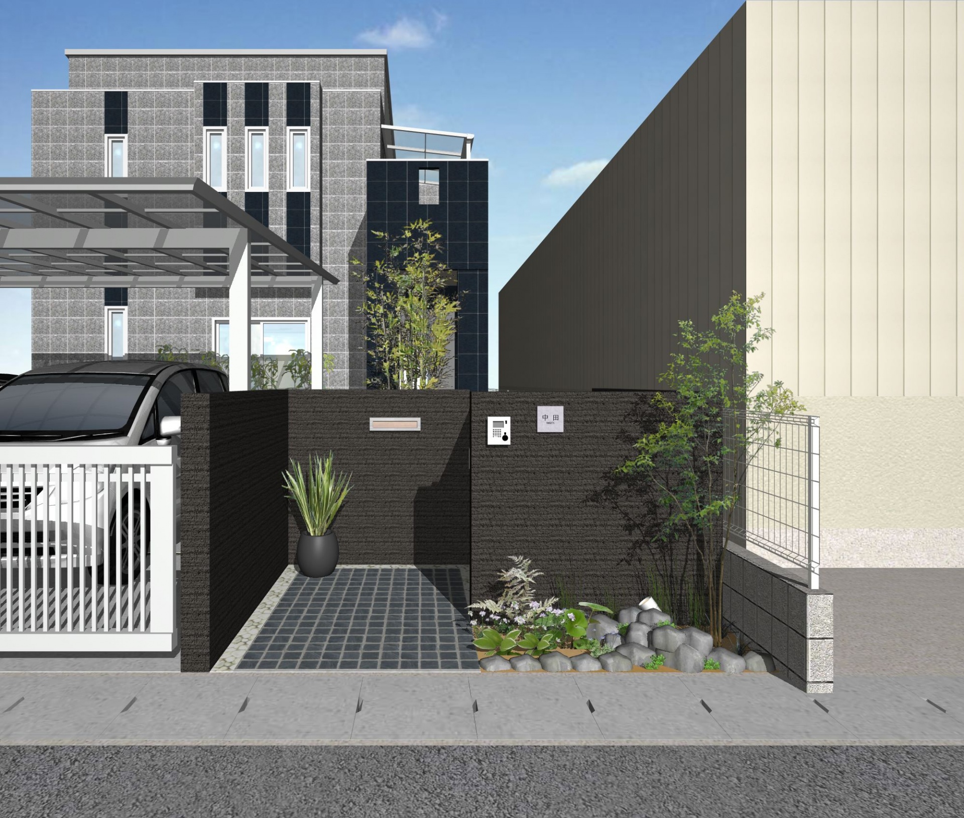デザインパース集 和を感じさせるモダンエクステリア クローズ外構のプランです。 車2台分のカーポート・オーバードア。門周りはシンプルに黒の壁を設けています。 門扉は横に設け正面から見るとあまり見えてこない仕様となっています。 お客様が中から見て落ち着く様にと、和心のある植栽・素材を使ってアプローチ周りは仕上げています。 すっきりとシンプルな門周り。門扉を開けると植栽に癒されながら、色々な発見があるお庭になっています。 中からの眺めは、見て落ち着く和モダン風に 平面・立面計画図