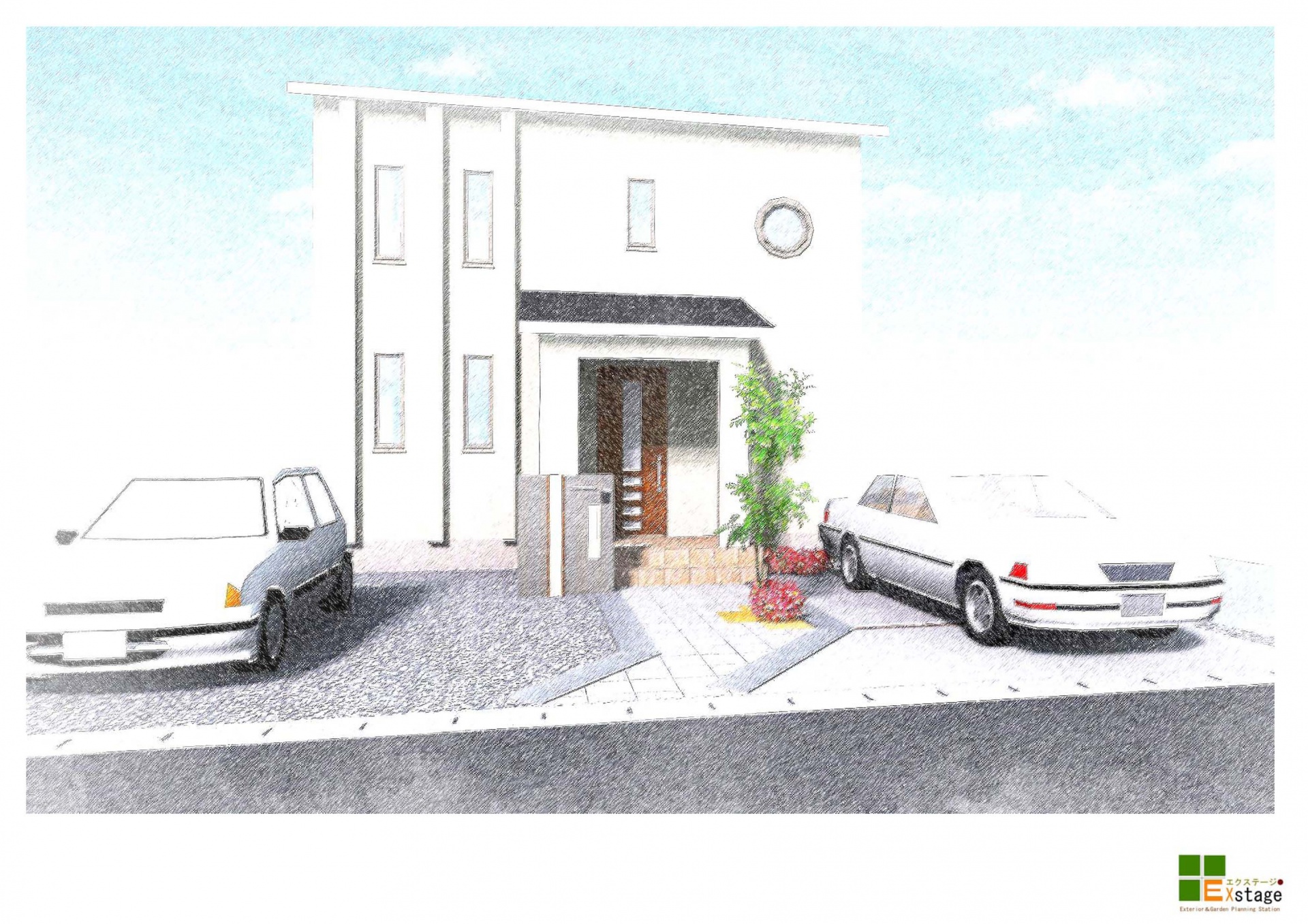 デザインパース集 シンプルエクステリアに似合うオリジナル門柱デザイン シンプルな外構デザインによく似合うエクステリアデザインパース集。グリーンをポイントにおさえたモノトーンエクステリアパースデザインです。 このパースの施工例はこちら