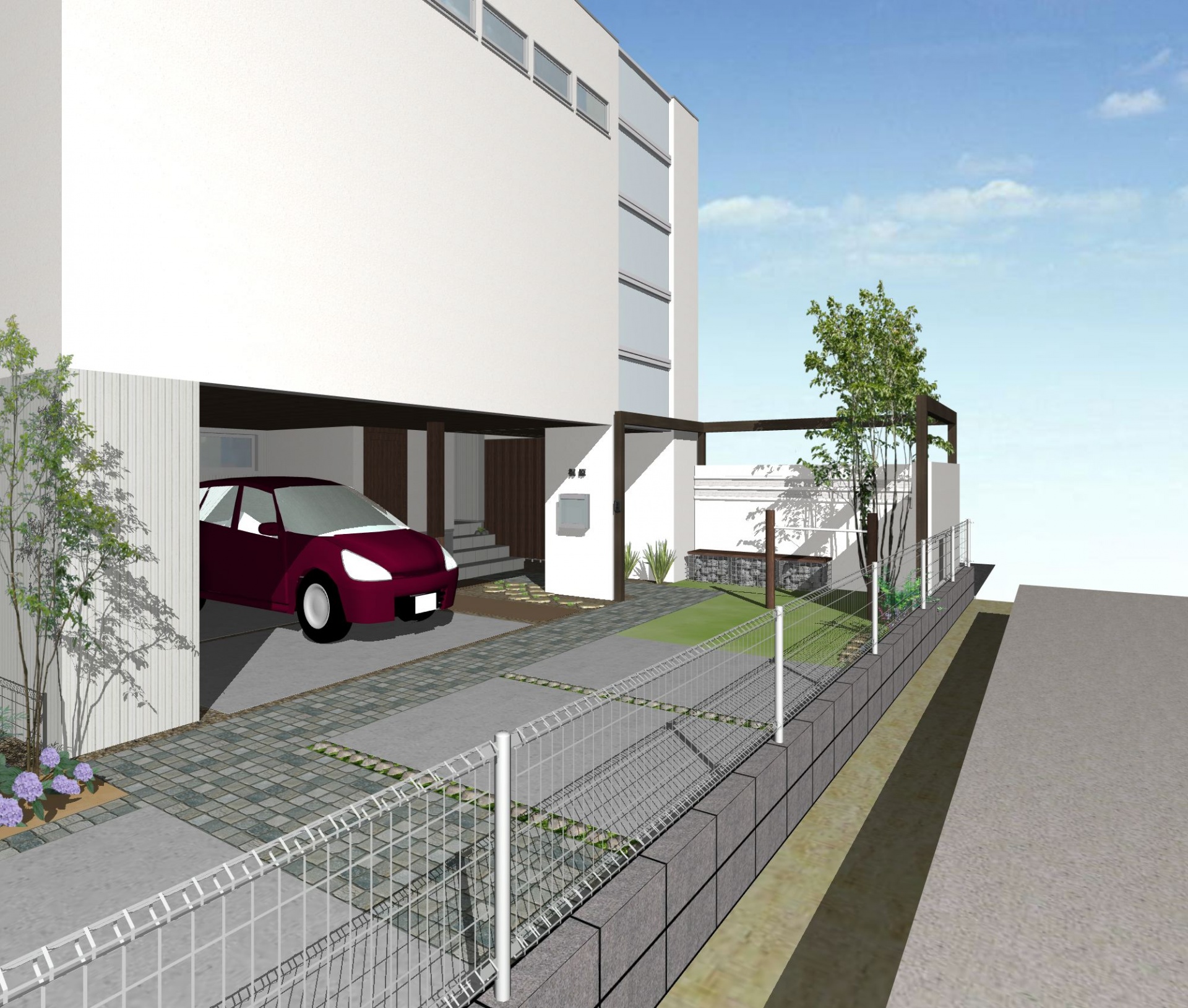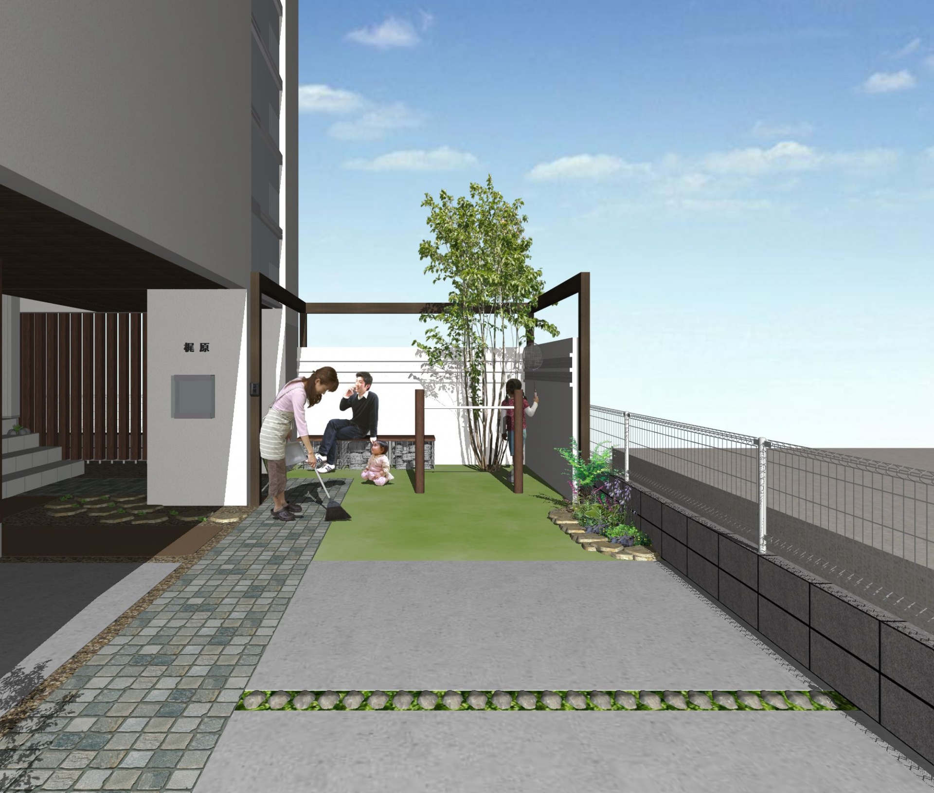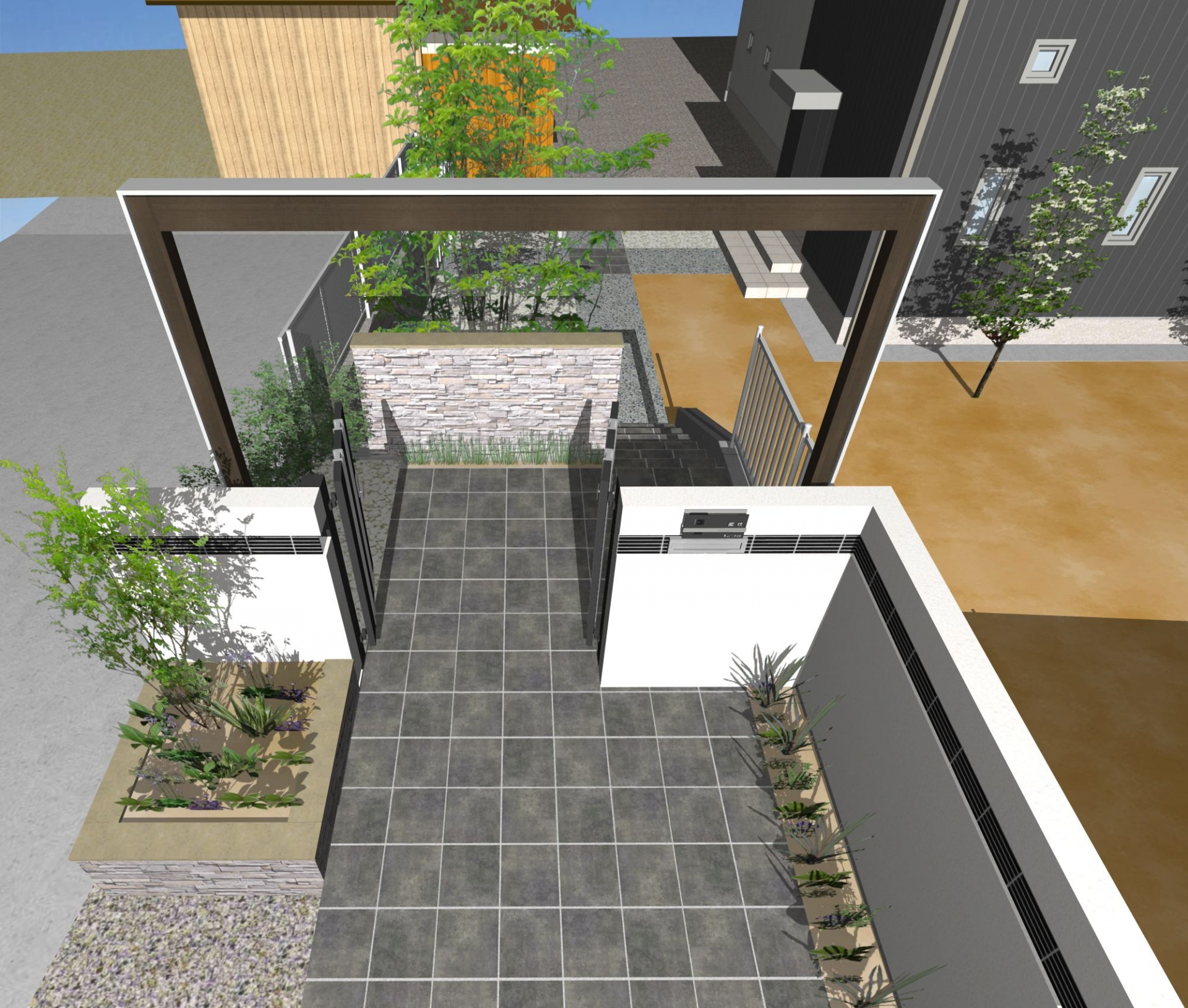 デザインパース集 旗竿敷地の奥に広がるモダンガーデン 旗竿敷地を有効利用したプランです。 入り口から、奥の家の方の庭だという事を分かりやすく繋がりを持たせています。 専用通路沿いには低木類を植え、その奥には中木~高木を配置、お庭が広がります。 芝生にお子様用の鉄棒、ガビオン(鉄の金網)に石を詰め込んだベンチなど、ご家族が楽しめるお庭になっています。