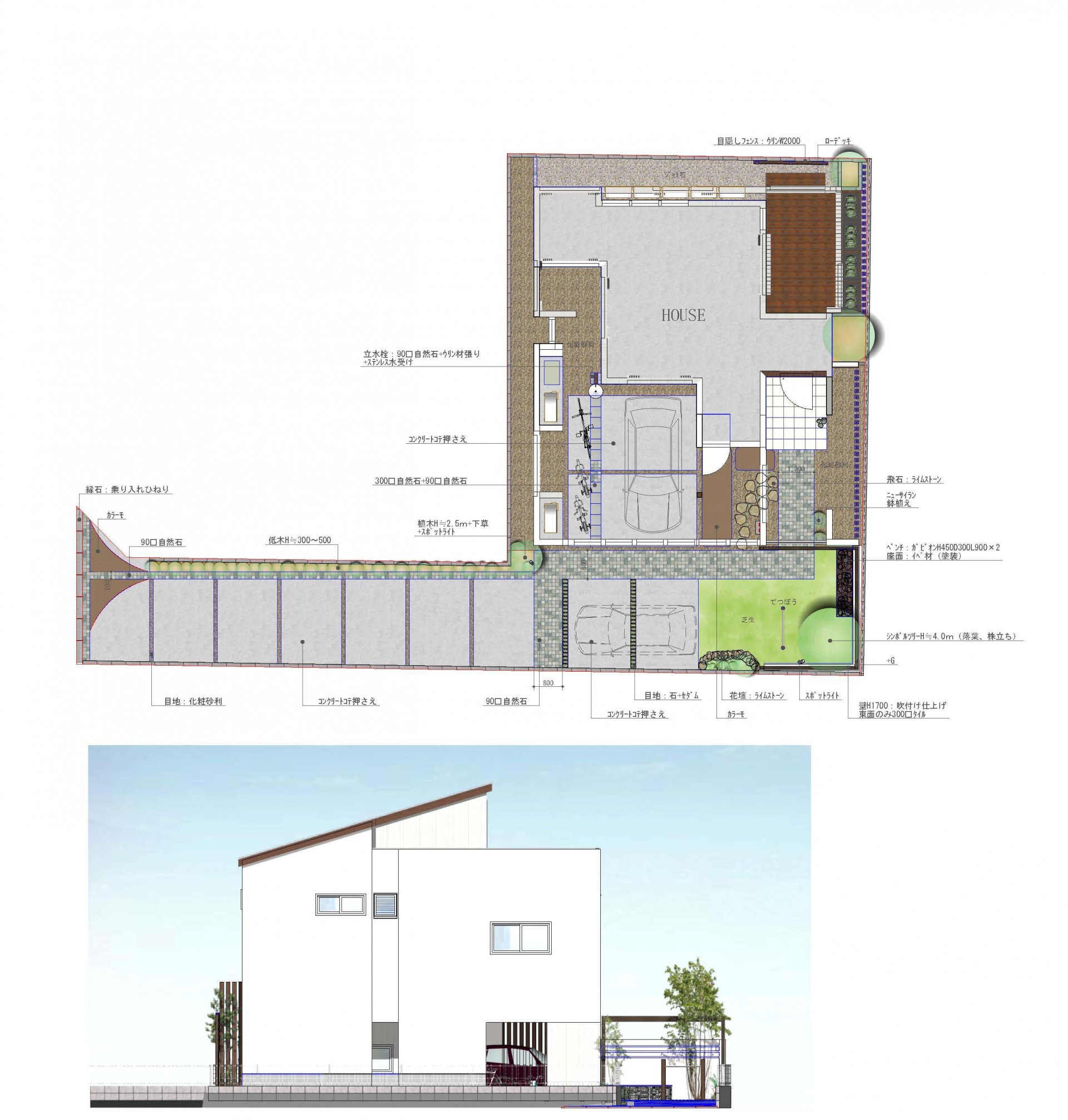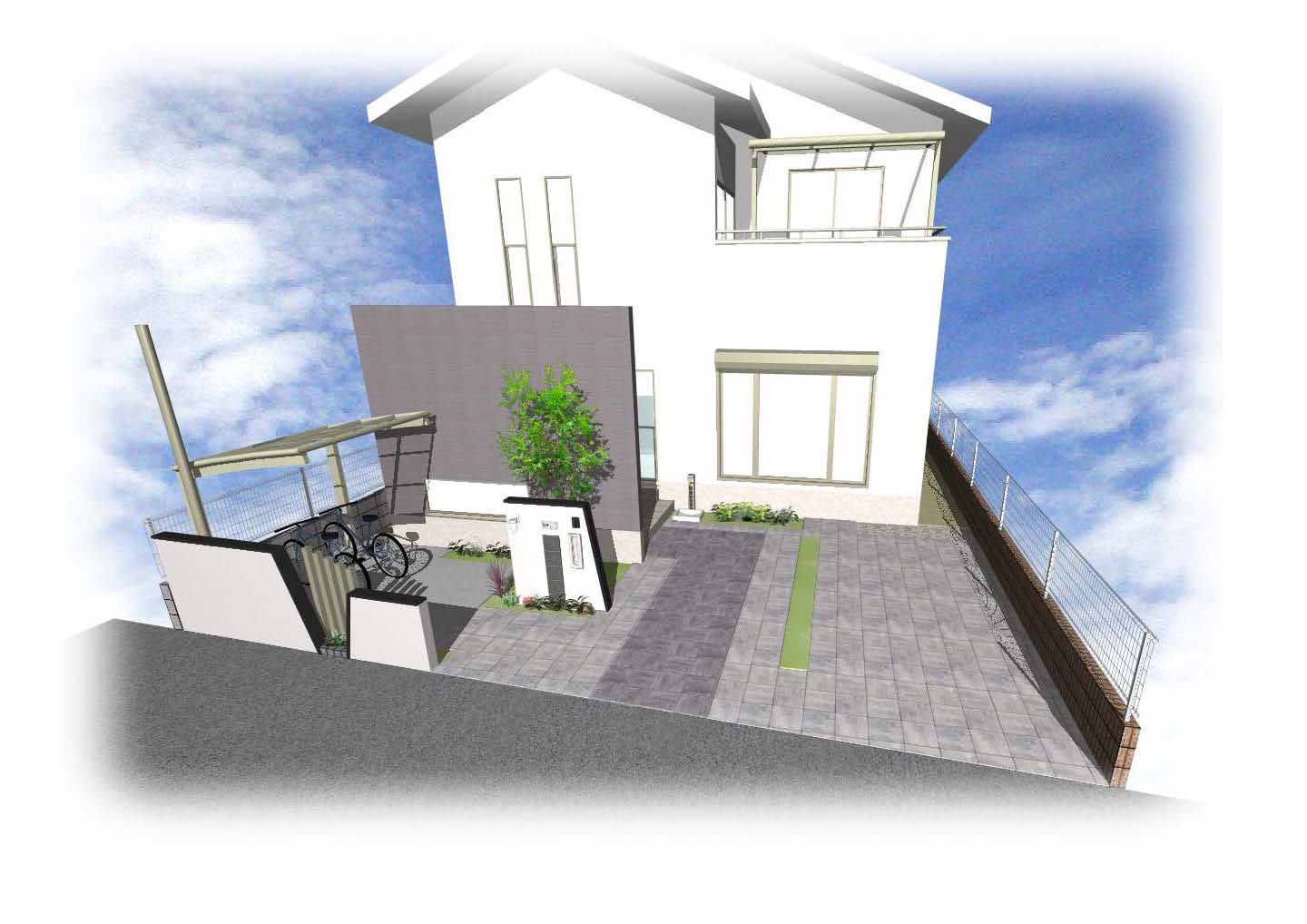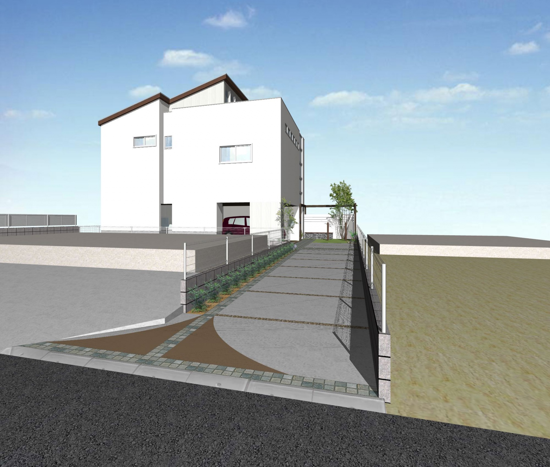 デザインパース集 旗竿敷地の奥に広がるモダンガーデン 旗竿敷地を有効利用したプランです。 入り口から、奥の家の方の庭だという事を分かりやすく繋がりを持たせています。 専用通路沿いには低木類を植え、その奥には中木~高木を配置、お庭が広がります。 芝生にお子様用の鉄棒、ガビオン(鉄の金網)に石を詰め込んだベンチなど、ご家族が楽しめるお庭になっています。