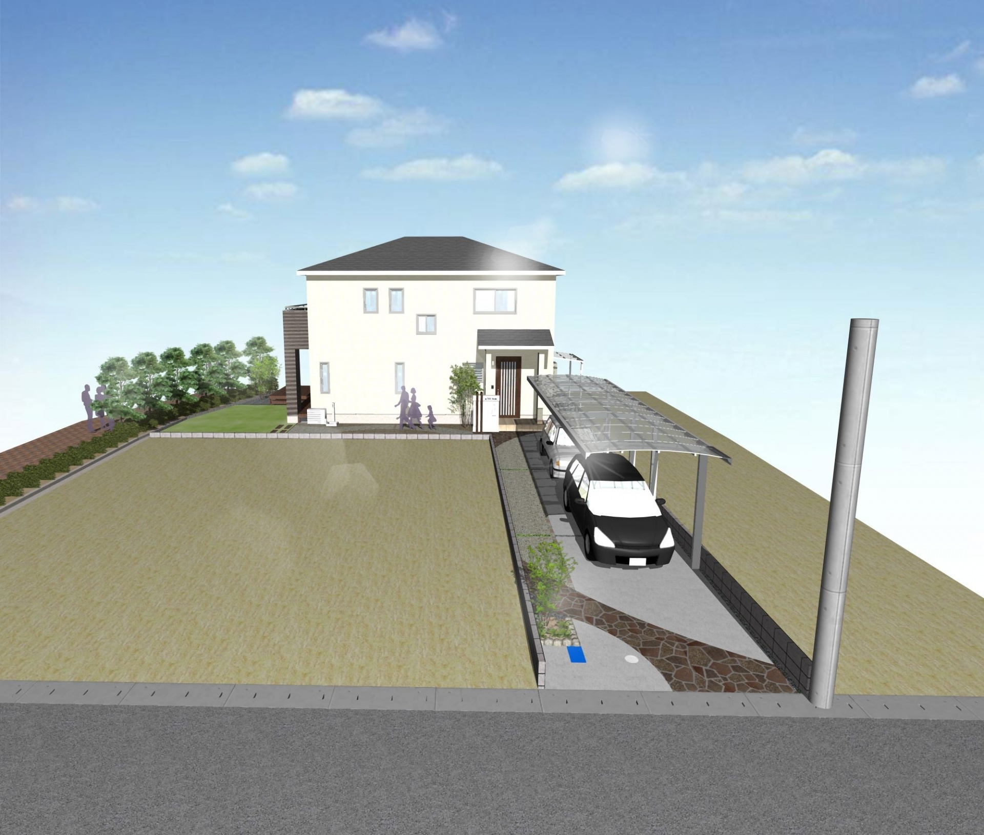デザインパース集 旗竿地のエクステリアプラン 専用通路幅4.0m部分が車庫スペース・アプローチとなります。 その奥には玄関があり、専用通路を「いかにも」というプランは避け、奥まで繋がりのある空間・土間デザインを心がけました。 斜めにとった導線、自然石乱張りで入り口を印象付けデッドスペース部分には小さいながらも植栽スペースを設けました。 白とこげ茶の建物外壁に合わせて外構も落ち着いた色目でまとめています。