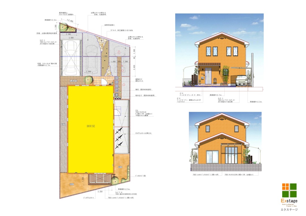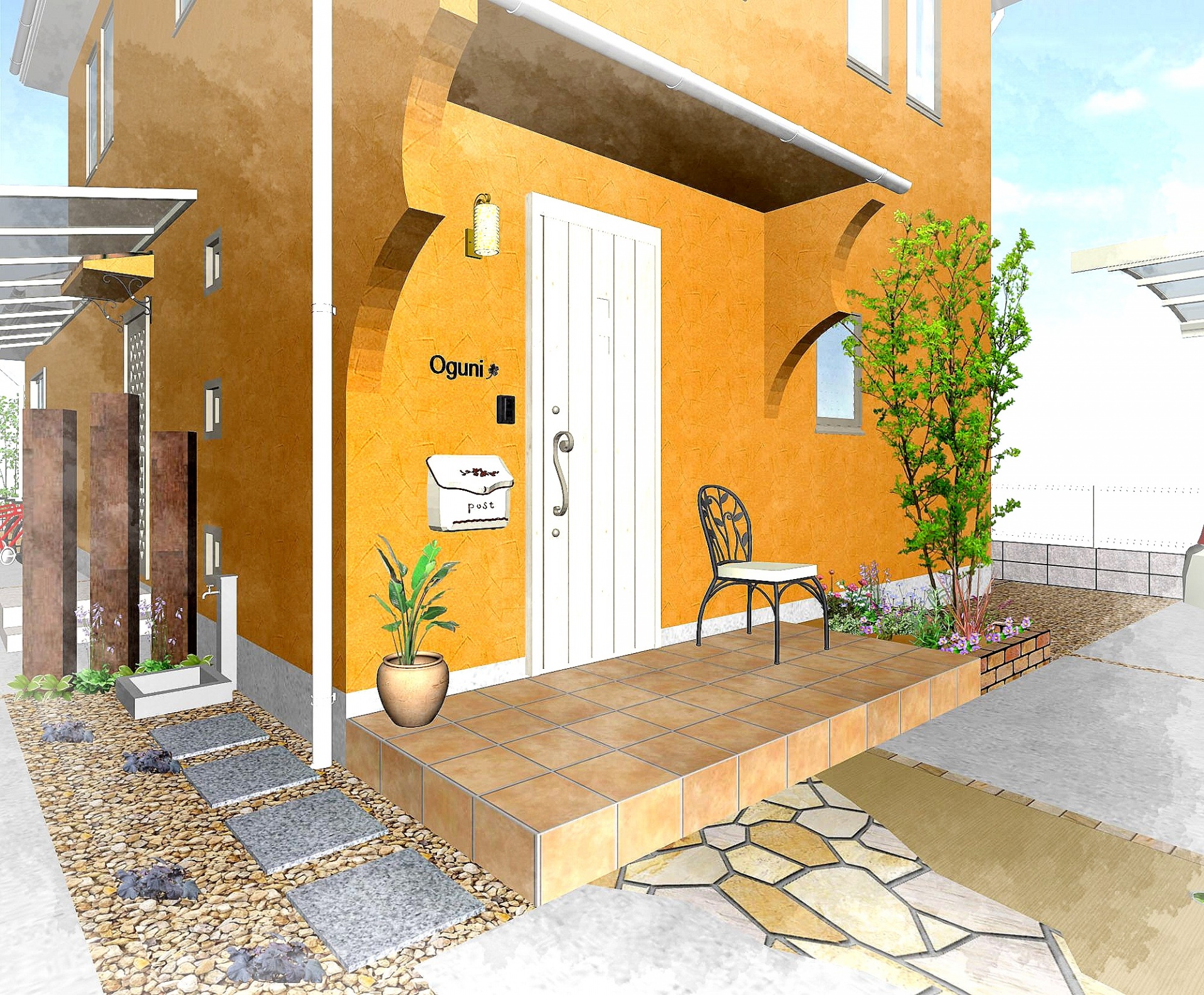 デザインパース集 黄色の外壁にポーチを取り付けたプラン 黄色い外壁が印象的なお客様のエクステリアプランです。 車の進入路の幅、来客時の駐車スペースを考慮して前面部分を固めることでご提案させて頂きました。 アプローチのデザインは石の豪華さと、カラーコンクリートの柔らかさが融合したイメージです。 門柱を設けず建物外壁に表札・ポストを取り付ける計画の為、スッキリとしています。 変形地のデッドスペースになっている部分を植栽スペースとすることで、より一層建物との一体感が出るエクステリアとなると考えます。