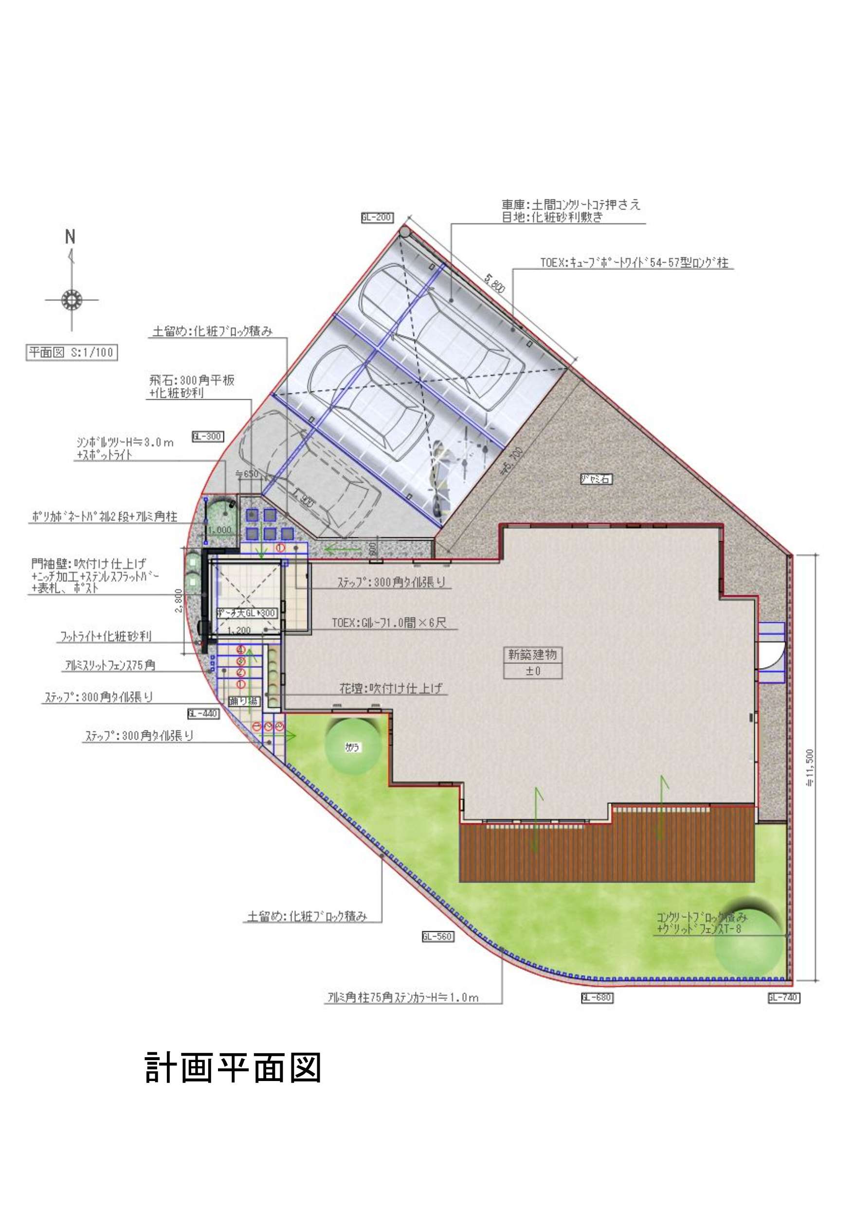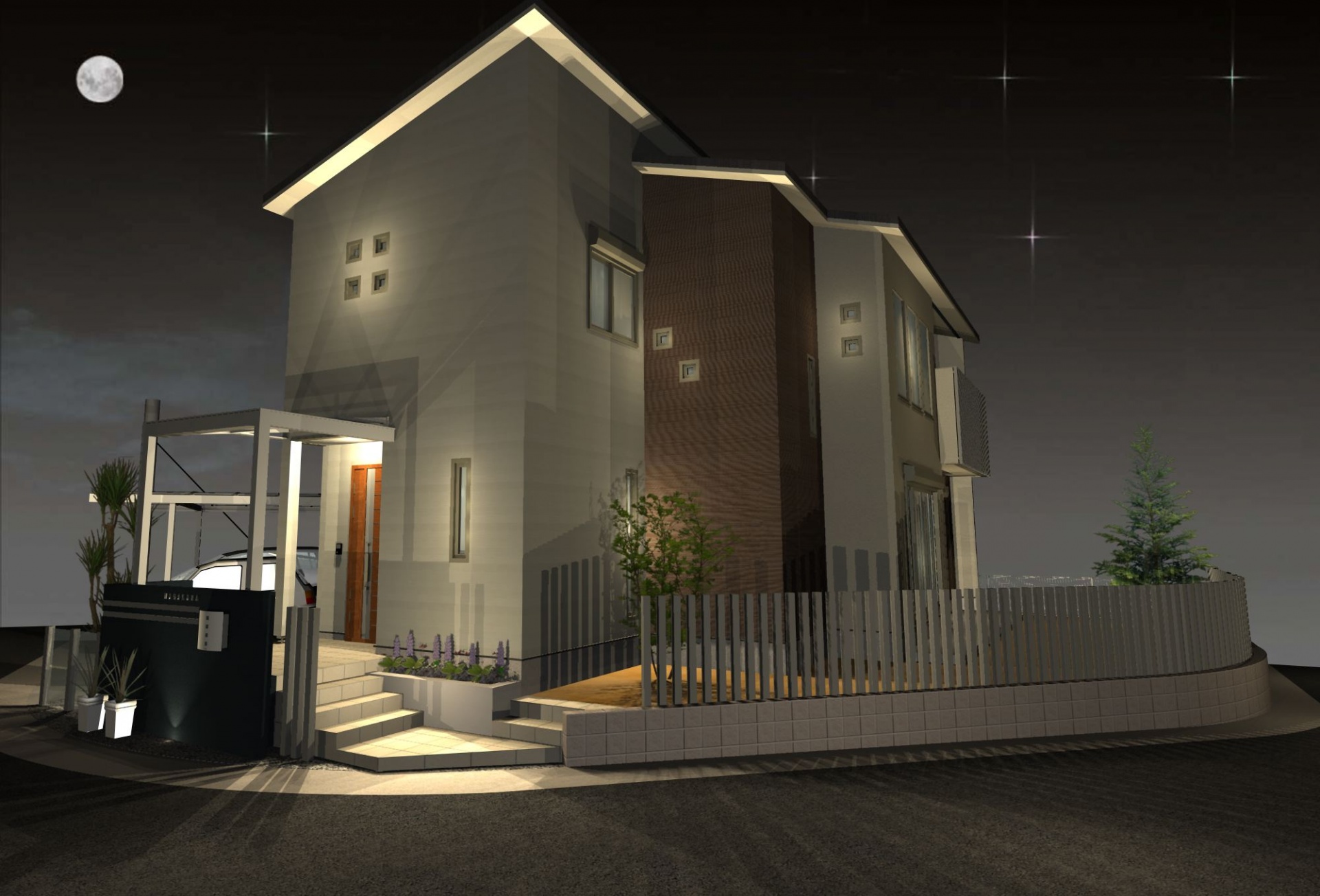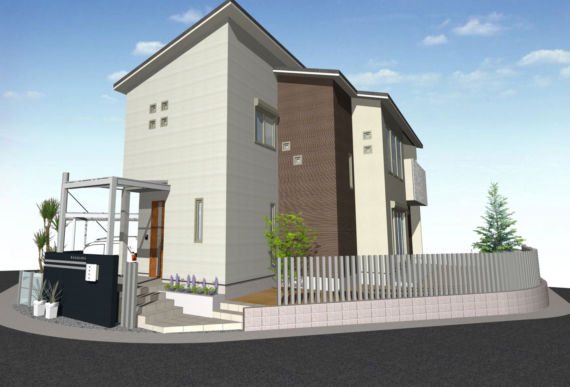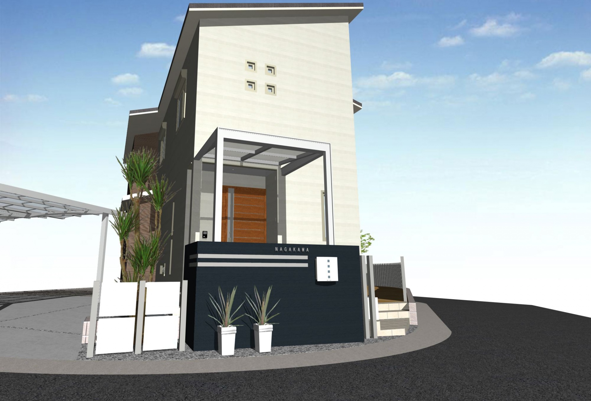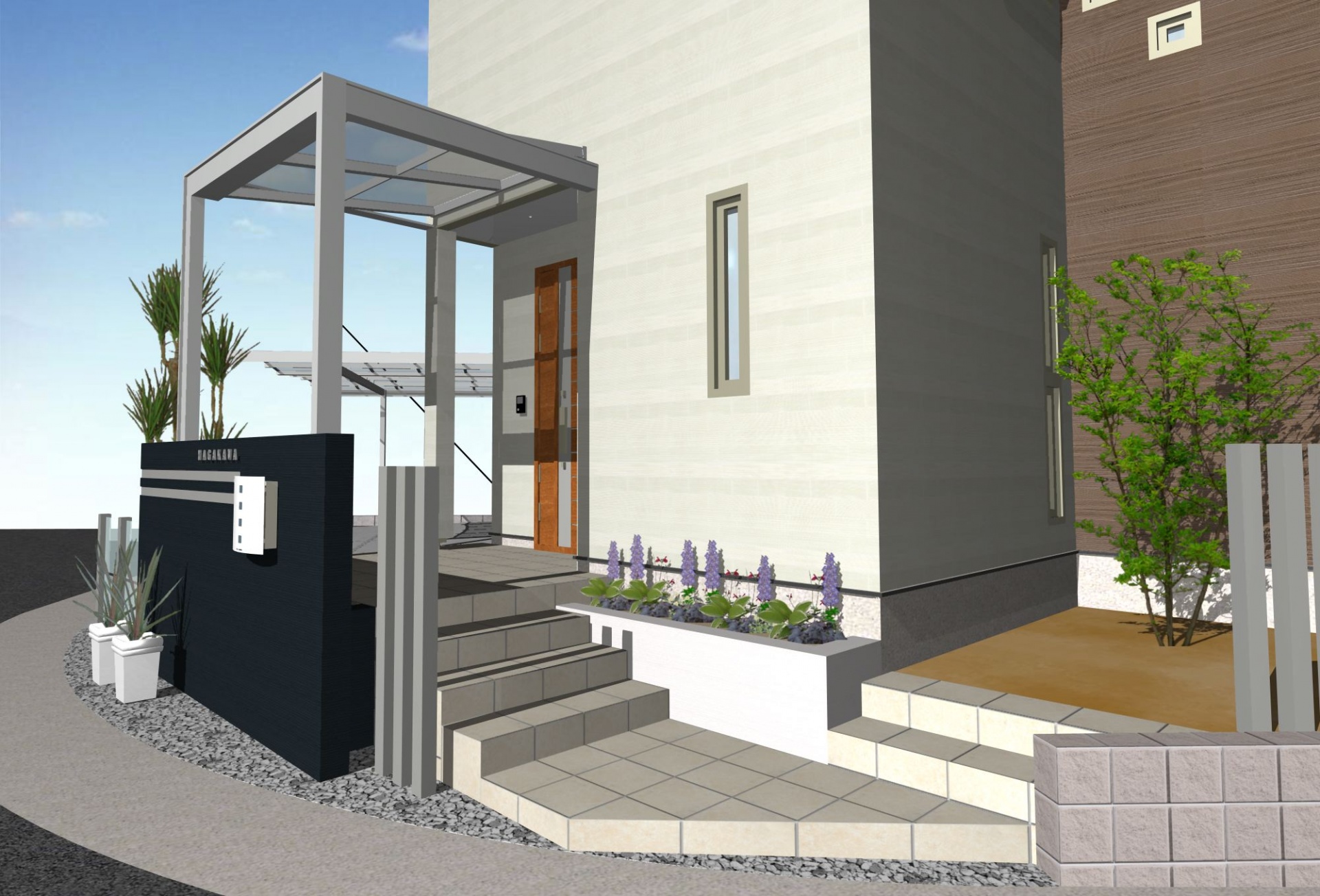 デザインパース集 ステンカラーで魅せるエクステリア 建物の雰囲気に合った、個性がある他には無いようなデザインをご希望されていました。 少しプレッシャーを感じながら、驚かせてやろうという気持ちでプランニングに望みました。 総二階の建物に、すっきりとした玄関前のルーフを提案し、黒壁でインパクトを持たせることを考えました。 土留めも兼ねた黒壁はL字で控え壁代わりですが、それを活かす様にステンレスのフラットバーを埋め込みシャープなを表現しています。