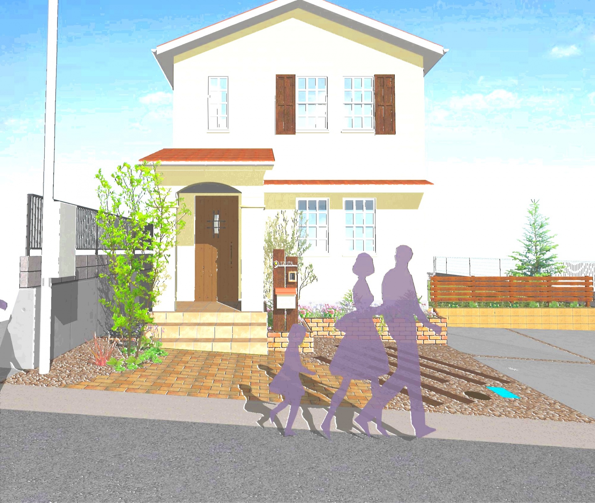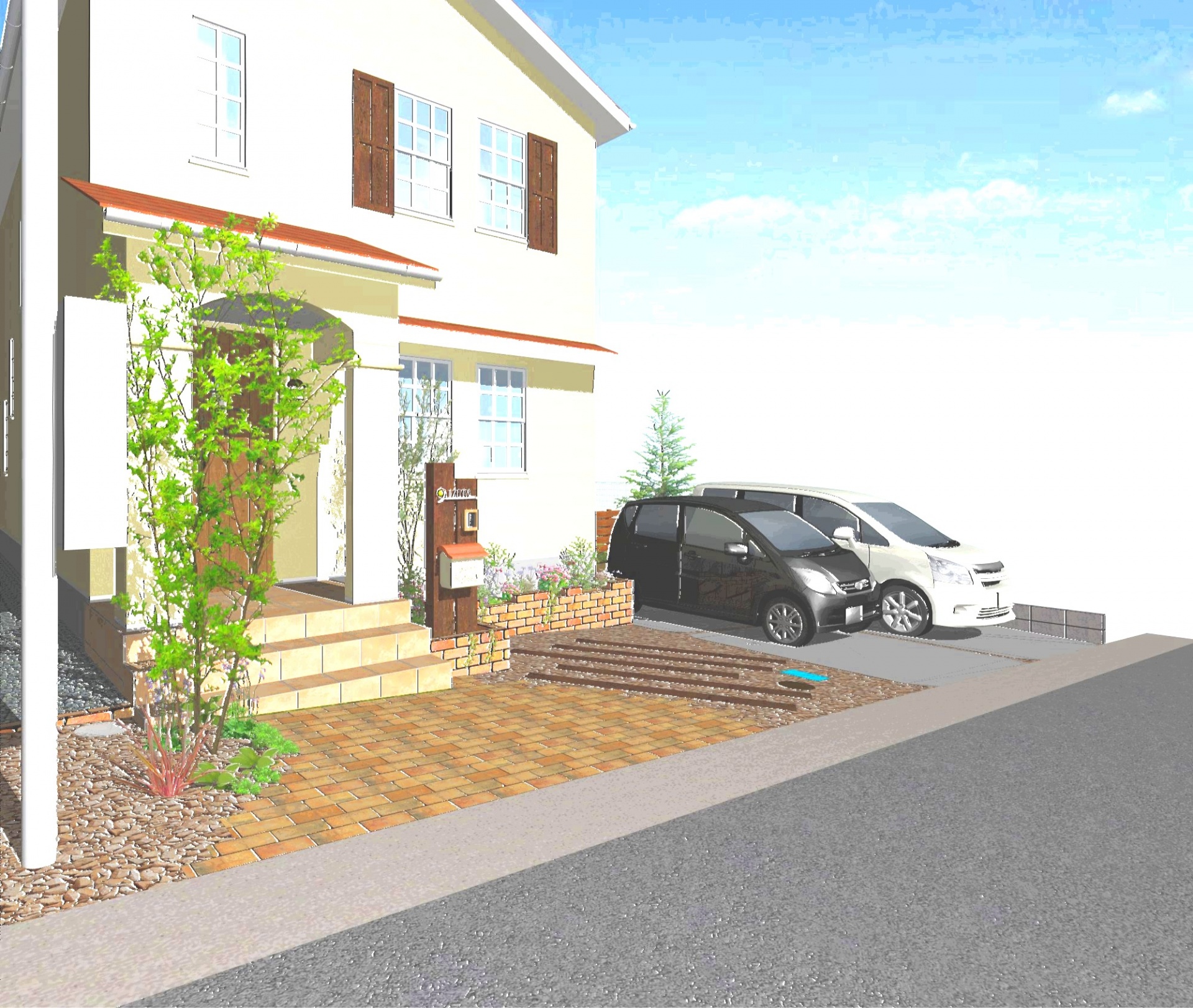 デザインパース集 木を使ったナチュラルなお庭プラン 建物の雰囲気に合わせたデザインでお任せいただきました。 門柱は壁ではなく、枕木を立てたナチュラルな門柱。 表札、ポストも可愛いものを選びました。 こちらでは道路勾配が端々で70cmほどついています。 その他お庭の設計GLとも段差があり、建物が深基礎になっていませんでした。 建物基礎周りはレンガ花壇を設け、お庭と車庫の高低差は土留めブロックと転落防止の木製フェンス。 素材も極力、自然素材を使いナチュラルなイメージを守っています。