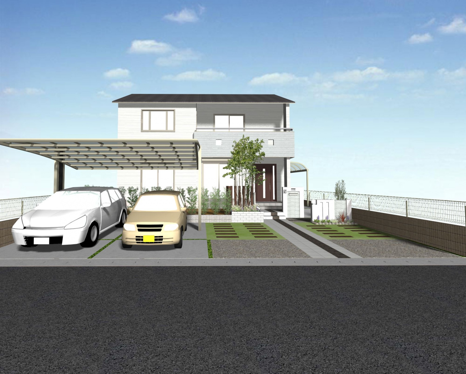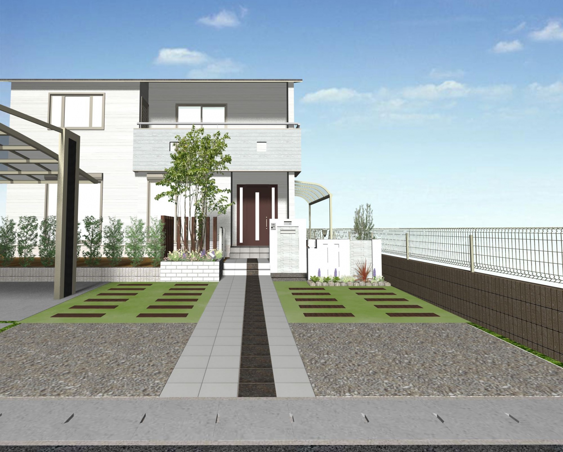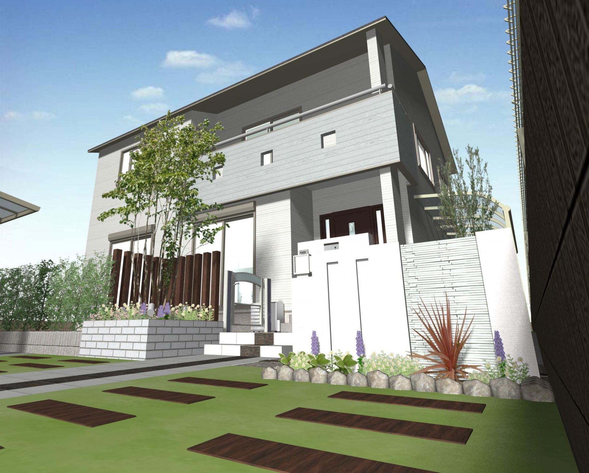 デザインパース集 高低差のあるシンプルモダンなお庭 車庫、アプローチ部分は敷地設計GLより30~40cm下がっていますので、土留め+階段が必要になってきます。 建物が白の外壁でシンプルですので、エクステリアも白を基調にまとめています。 2Fバルコニー部分は少し石積み調になっており、門周りの壁も白ですがテクスチャーを変えて調和を図っています。 まっすぐに伸びたタイルアプローチも1部色を変えてシャープな印象を与えています。