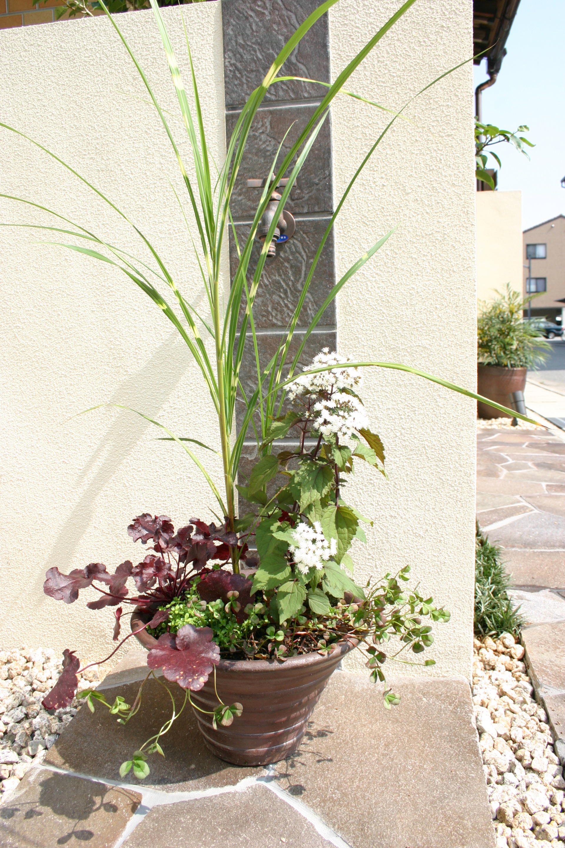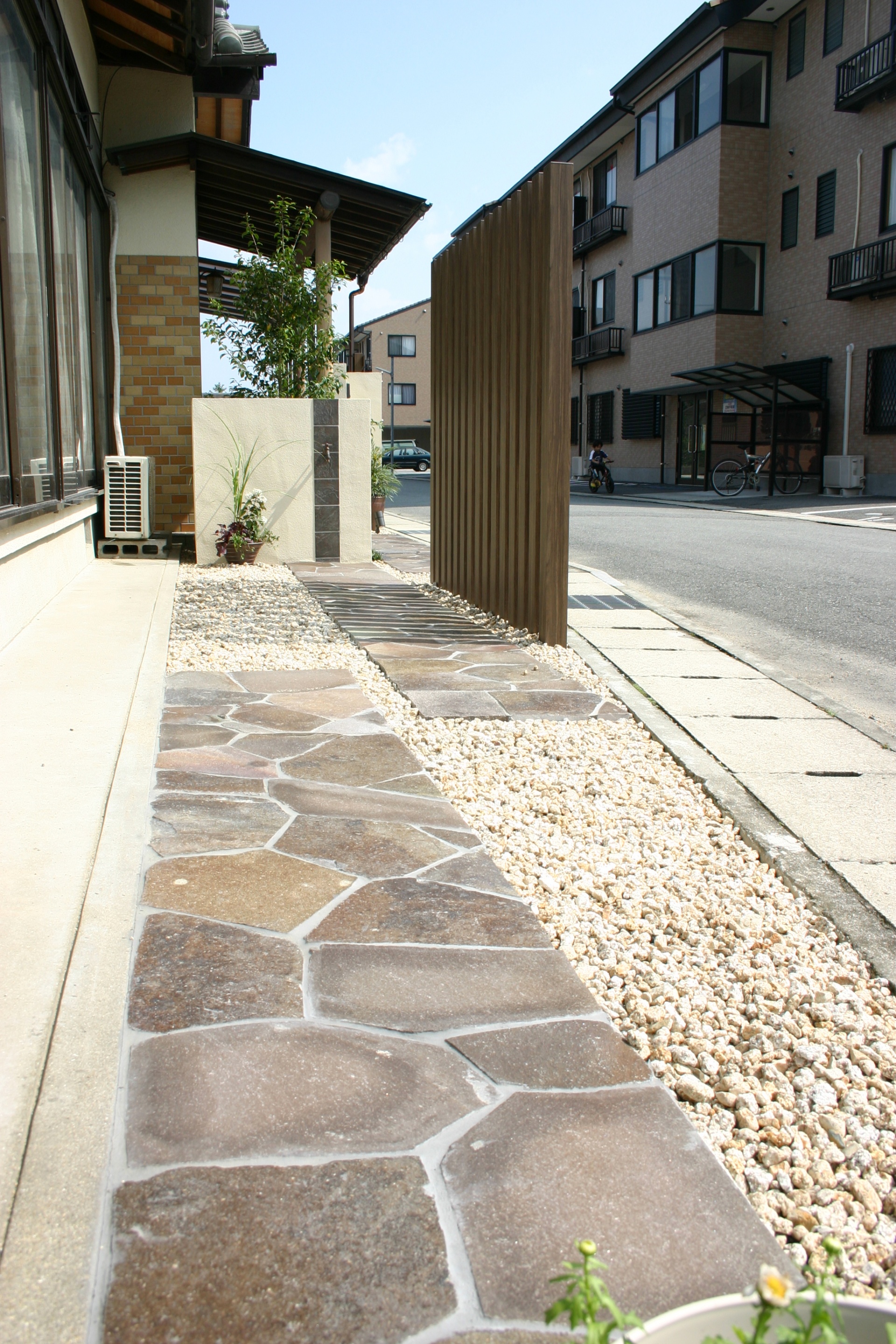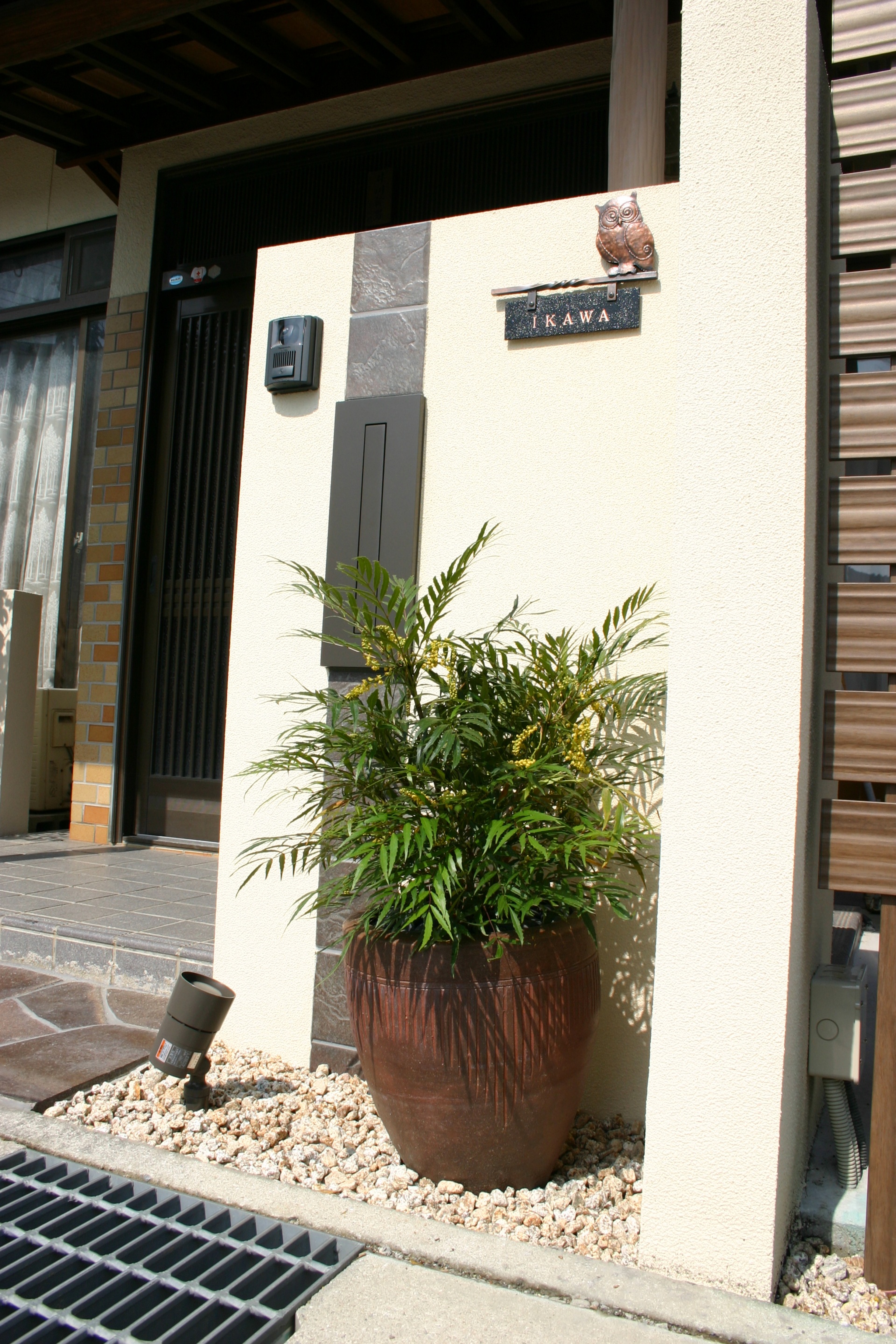 スタイル別施工実績 風に揺れるソヨゴ たつの市I様邸 和風のお宅の御依頼でした。色調をウッドフェンスで落ち着いた感じに抑え、門柱はアイボリーの吹付けにブラックのアクセントタイルで仕上げました。玄関横のソヨゴがポイントです。 建物の感じを損なわないよう落ち着いた色調に アイボリーの壁の前にはマホニアコンフーサを 道路面からの視線を考慮しウリンのウッドフェンスを設置 袖壁の裏面には水道栓そ設置、植木にお水やりに便利です。 銅製のフクロウの表札。施主様お気に入りです。