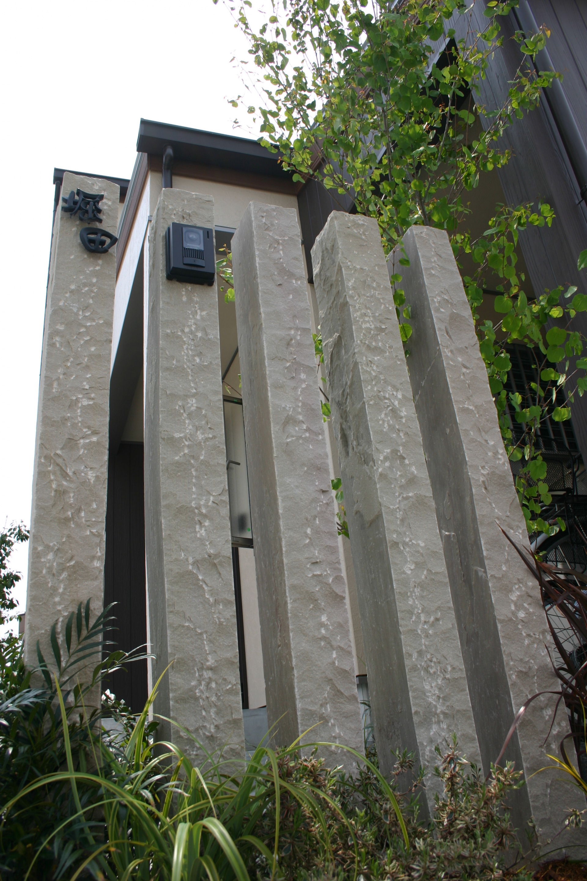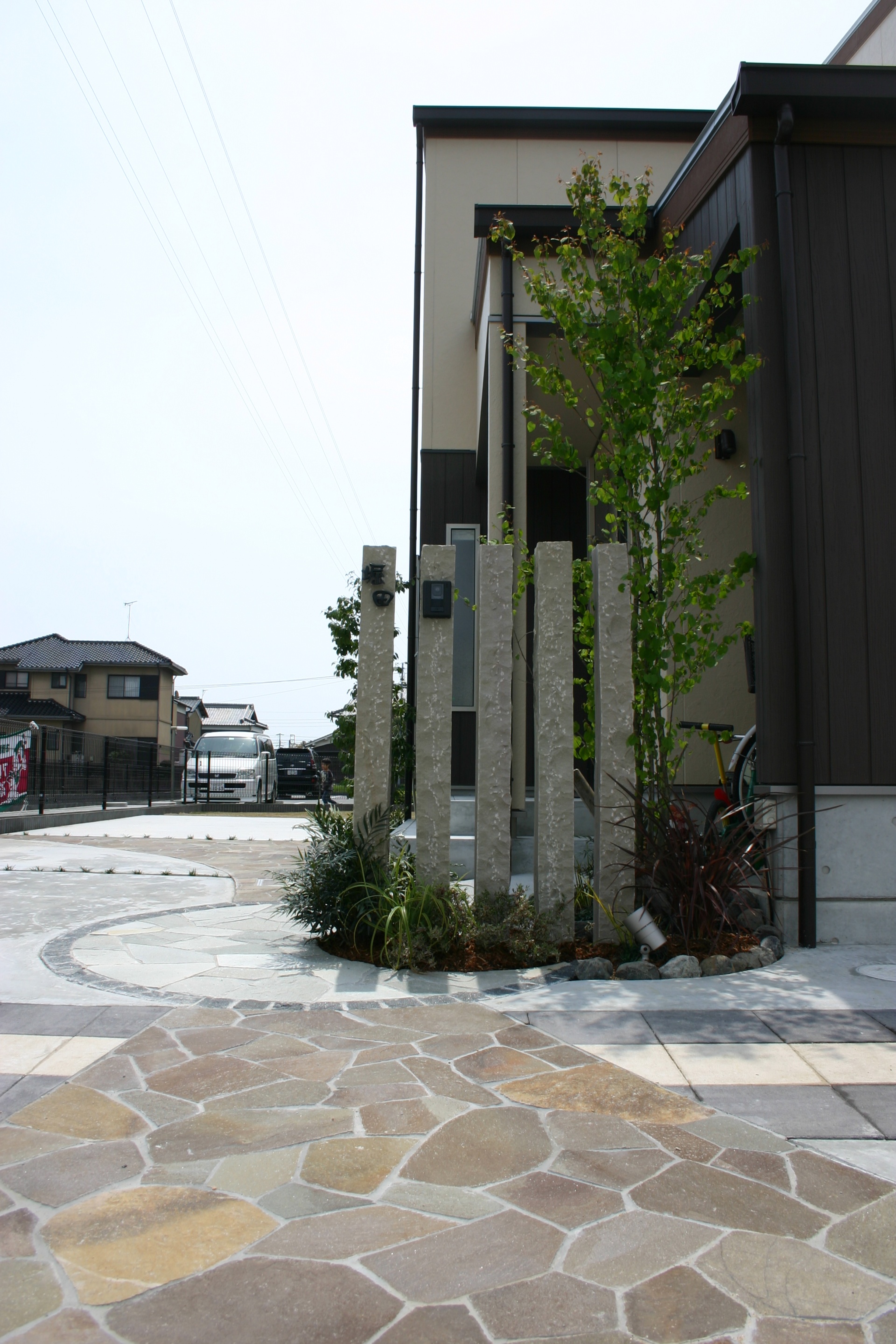 スタイル別施工実績 開放感のある石の門柱に緑が映える門周り 姫路市H様邸 車が停めれるスペースを最大限に確保するため、必然に土間部分が多くなってしまいます。建物の雰囲気に合わせ和心のある石の門柱。隙間からシンボルツリーの緑が見え爽やかな気持ちになります。門柱周りは自然石を円形に配置し踊り場的になっています。足元にも緑が入り、来客の目も楽しませてくれます。 before 建物に丸窓があるのをヒントに、門柱周りの踊り場にも自然石でサークル状にしてリンクしています。 ヤブラン、マホニアコンフーサなど常緑で和の雰囲気のある植栽をさせていただきました。