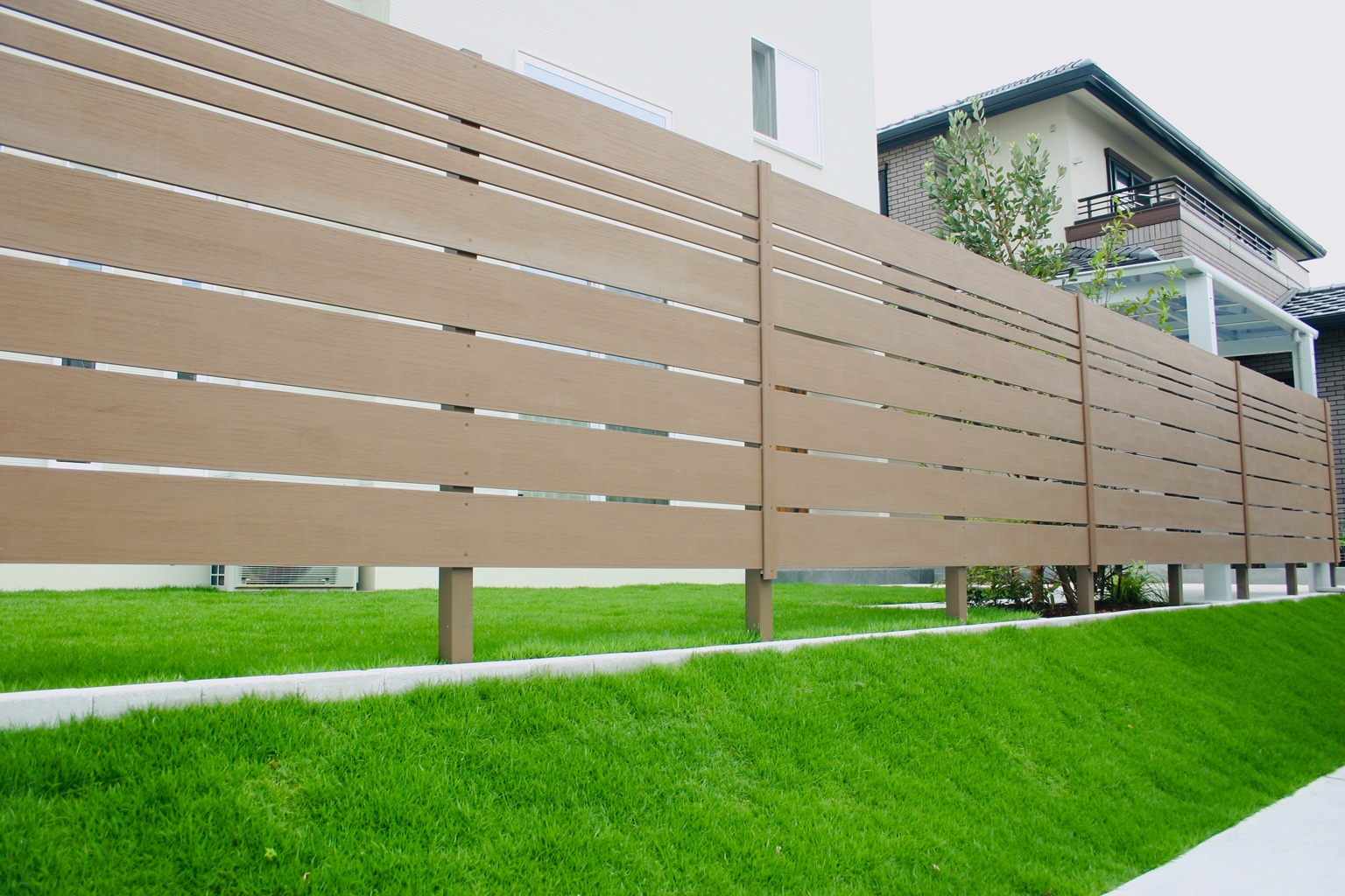 赤穂市新築外構 高低差を芝生法面で解消した緑と茶色のコントラストが綺麗なお庭