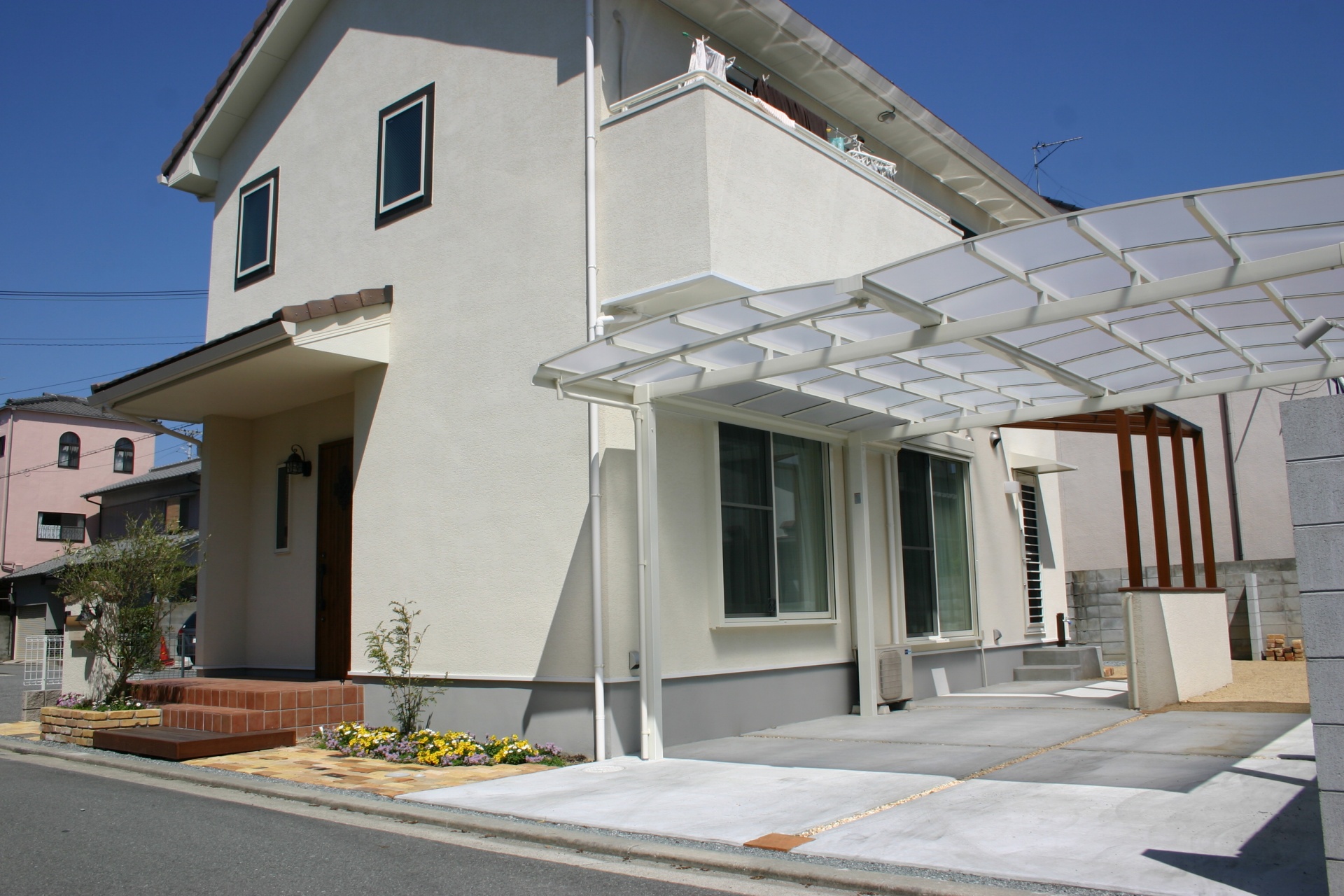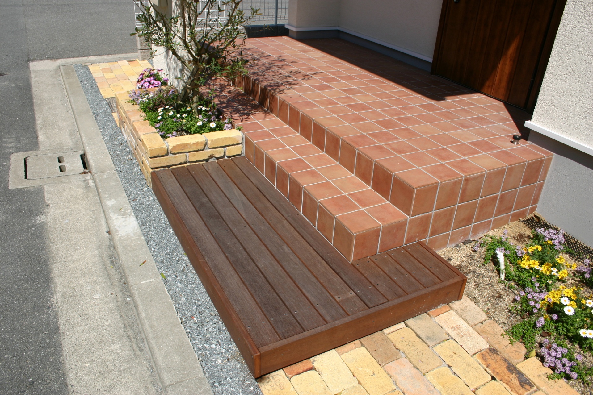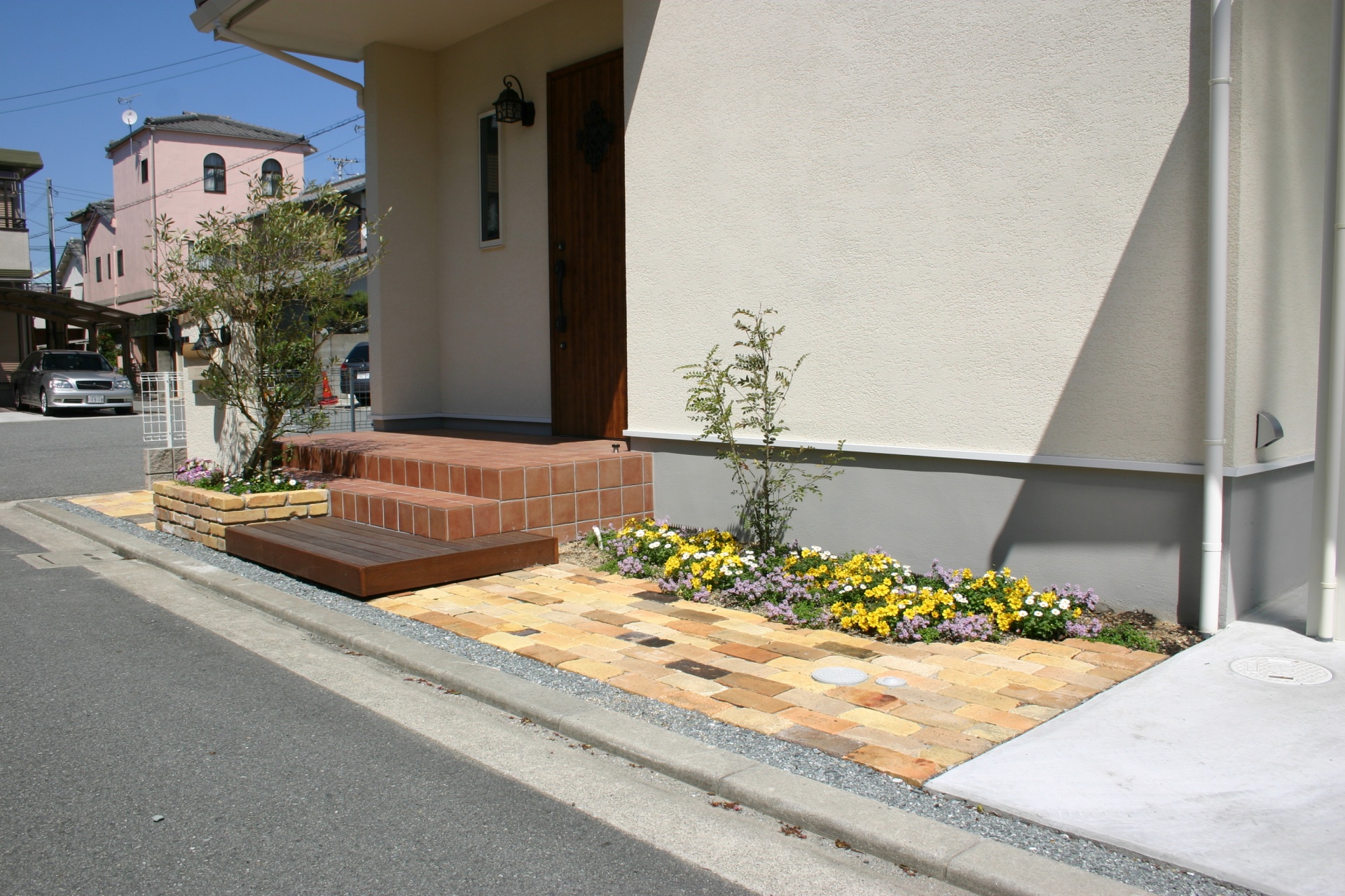 スタイル別施工実績 ウリン材ステップでナチュラルな門周り 姫路市O様邸 建築中からお庭のご相談に来られました姫路市O様 玄関前の高低差も外構でよりナチュラルに仕上げるのにウッドデッキ調でご提案しました。 レンガと緑を組み合わせることで門周りにナチュラルさと可愛さがプラスされました。 白のカーポートも設計通り、すっきりとおさまっています。 リビング前にはココマがあり、将来ウッドデッキを作り お庭として有効利用される予定です。 . before 玄関前に花壇を設け、オリーブを植えることで視線を遮ることが出来ます お客様の友人が記念に作って下さった表札がよく似合います。 . 玄関前の空間をゆったりとナチュラルにウッドで仕上げています 材料はハードウッドのウリン材 国産の耐火レンガを敷き詰めたファサードに植栽スペースを設ける事で柔らかな雰囲気になりました .. 有効開口にぴったりと納まった2台分のカーポート LIXIL:ココマオープンテラス腰壁タイプ1.5間×8尺 腰壁は建物と同じトラバーチン風仕上げで統一感をだしています 自転車置き場としてもご利用頂けます ..