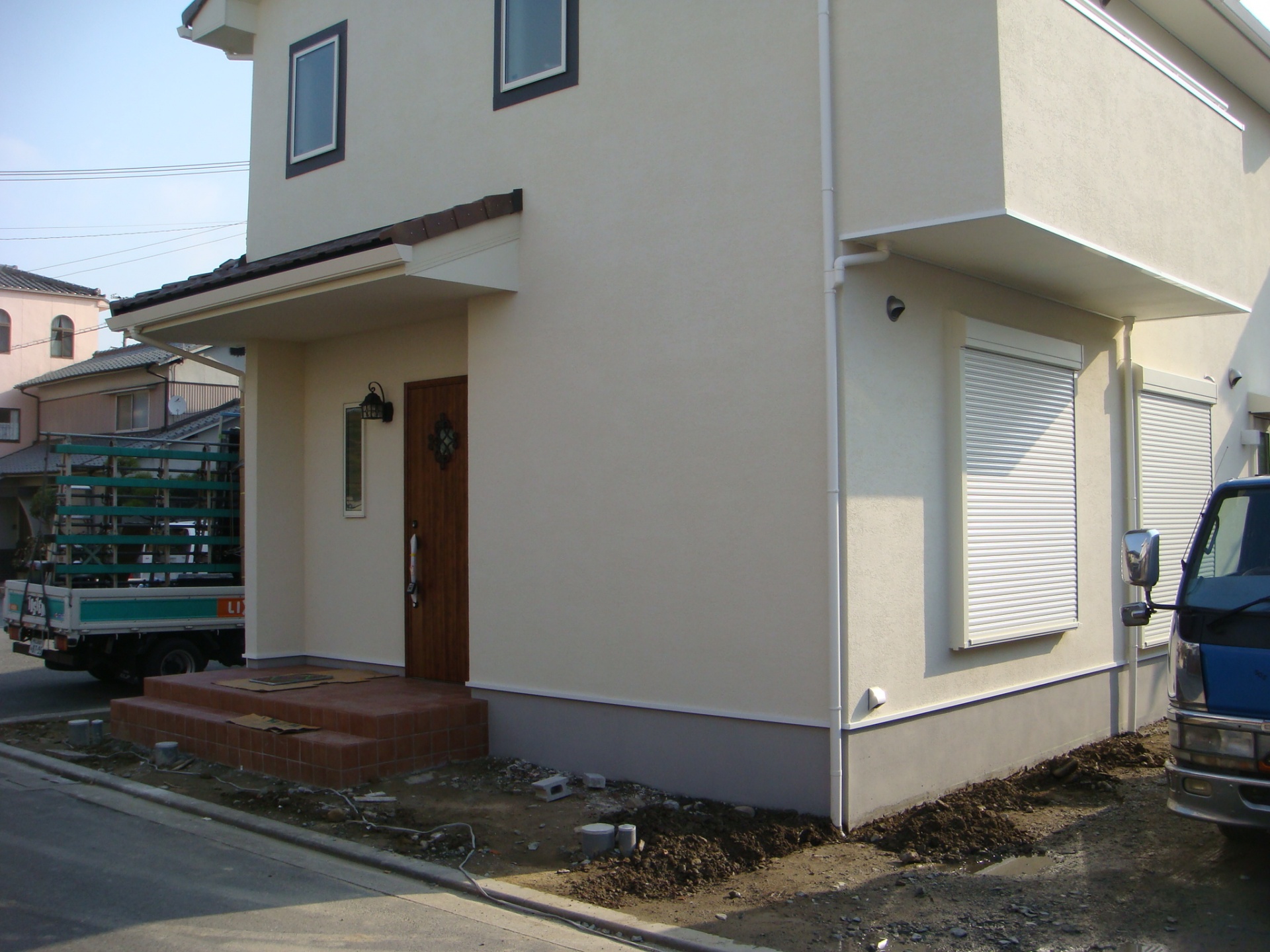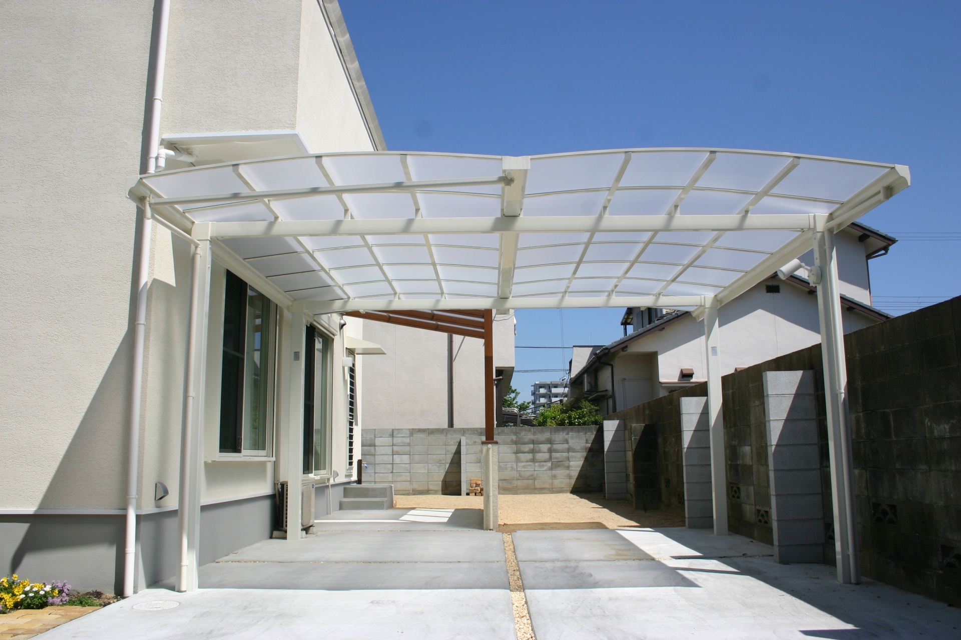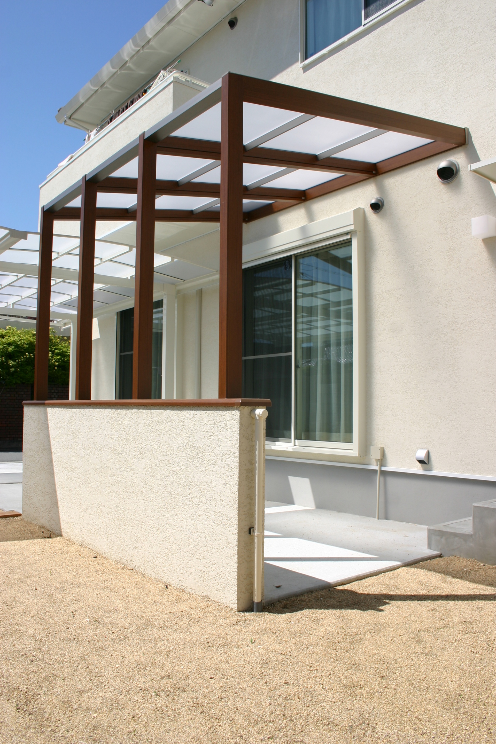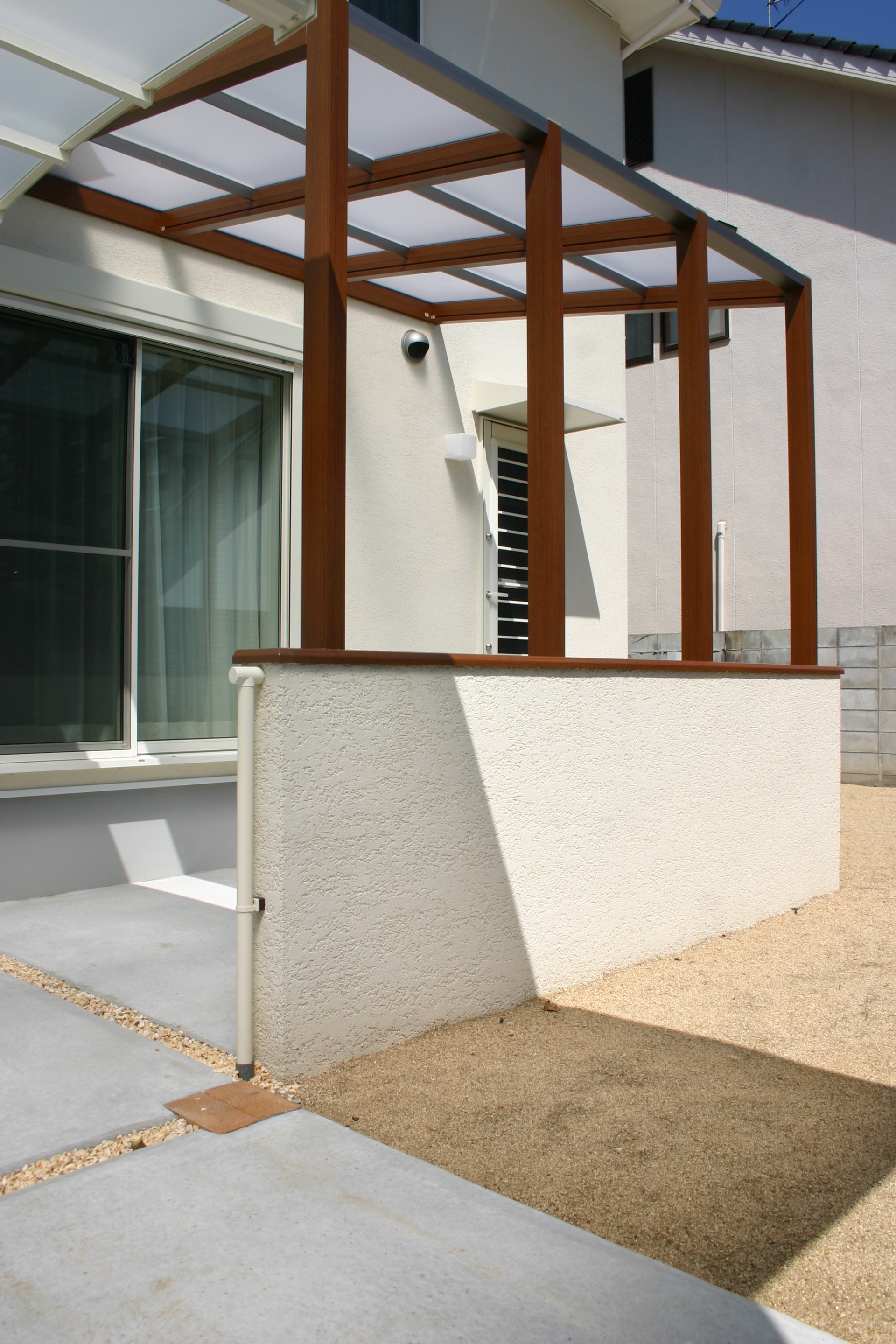 スタイル別施工実績 ウリン材ステップでナチュラルな門周り 姫路市O様邸 建築中からお庭のご相談に来られました姫路市O様 玄関前の高低差も外構でよりナチュラルに仕上げるのにウッドデッキ調でご提案しました。 レンガと緑を組み合わせることで門周りにナチュラルさと可愛さがプラスされました。 白のカーポートも設計通り、すっきりとおさまっています。 リビング前にはココマがあり、将来ウッドデッキを作り お庭として有効利用される予定です。 . before 玄関前に花壇を設け、オリーブを植えることで視線を遮ることが出来ます お客様の友人が記念に作って下さった表札がよく似合います。 . 玄関前の空間をゆったりとナチュラルにウッドで仕上げています 材料はハードウッドのウリン材 国産の耐火レンガを敷き詰めたファサードに植栽スペースを設ける事で柔らかな雰囲気になりました .. 有効開口にぴったりと納まった2台分のカーポート LIXIL:ココマオープンテラス腰壁タイプ1.5間×8尺 腰壁は建物と同じトラバーチン風仕上げで統一感をだしています 自転車置き場としてもご利用頂けます ..