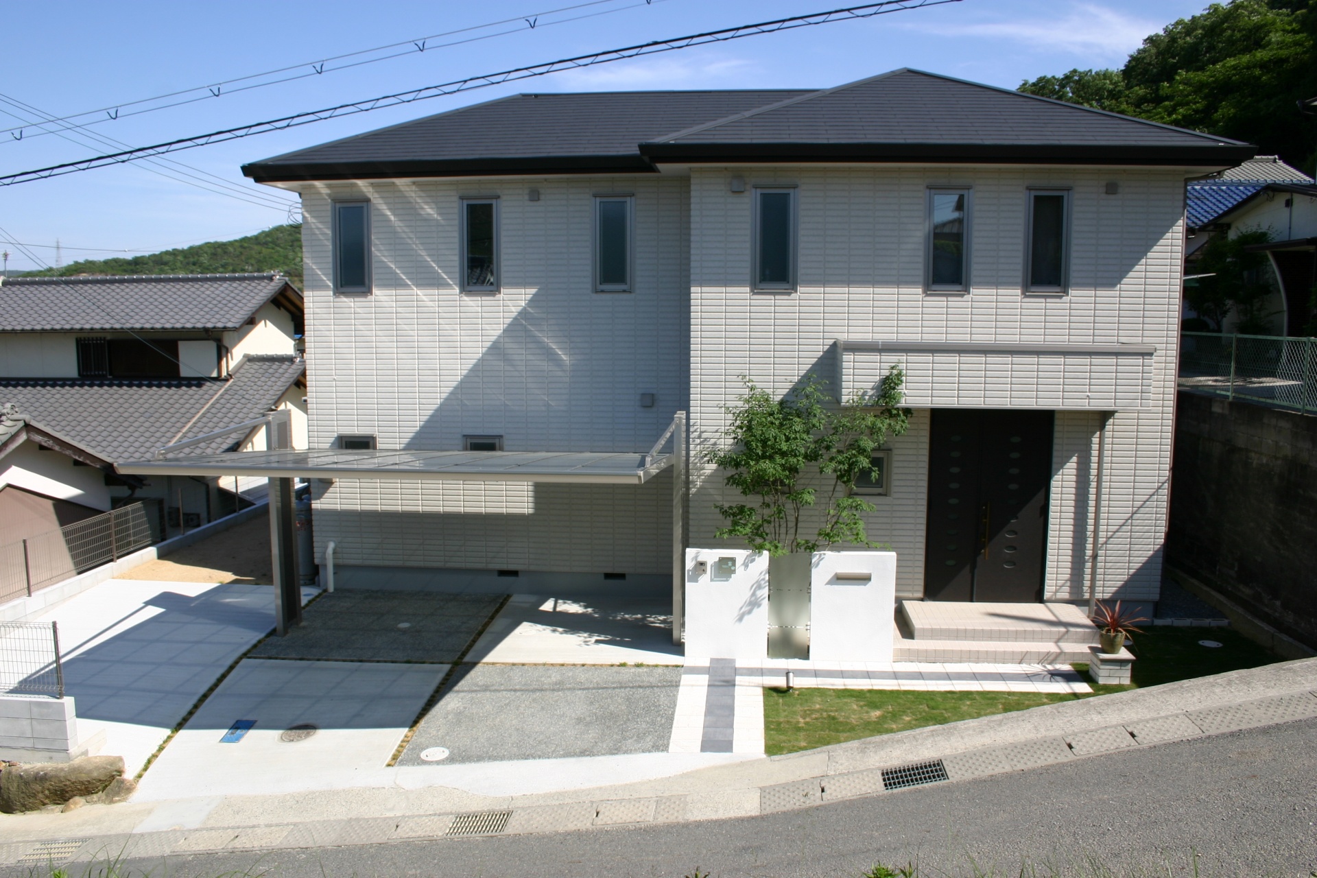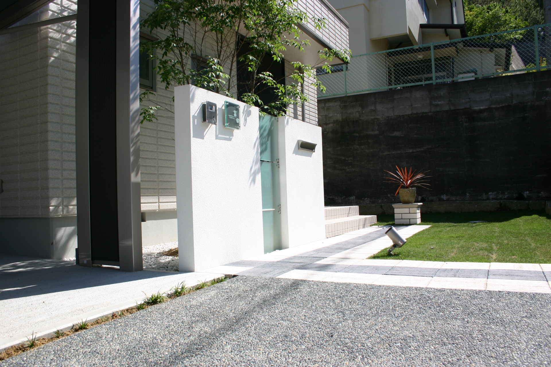 スタイル別施工実績 青空に映えるマイポート 相生市T様邸 前面道路幅が狭く道路勾配もきつい敷地条件でしたが、車庫2台分のマイポートワイドは2本足の為車の出入りに邪魔になりません。 シンプルな建物シャープなデザインのカーポートがに良く似合います。 門周りもすっきりと白い壁の間にポリカボネートを挟み後ろに植えたトネリコのシルエットが映し出されます。 アプローチ及び車庫土間部分にはモノトーン調に色目を分けシンプルにまとめました。 玄関前の赤葉のコルジルネの鉢植えが紅一点、アイポイントに。Planning:Kajiwara 白い門袖壁に透明感のあるポリカパネル 表札類の器具は極力シンプルに 玄関に向かうアプローチの先にはホワイトレンガの花台に赤葉のコルジルネが目を引きます