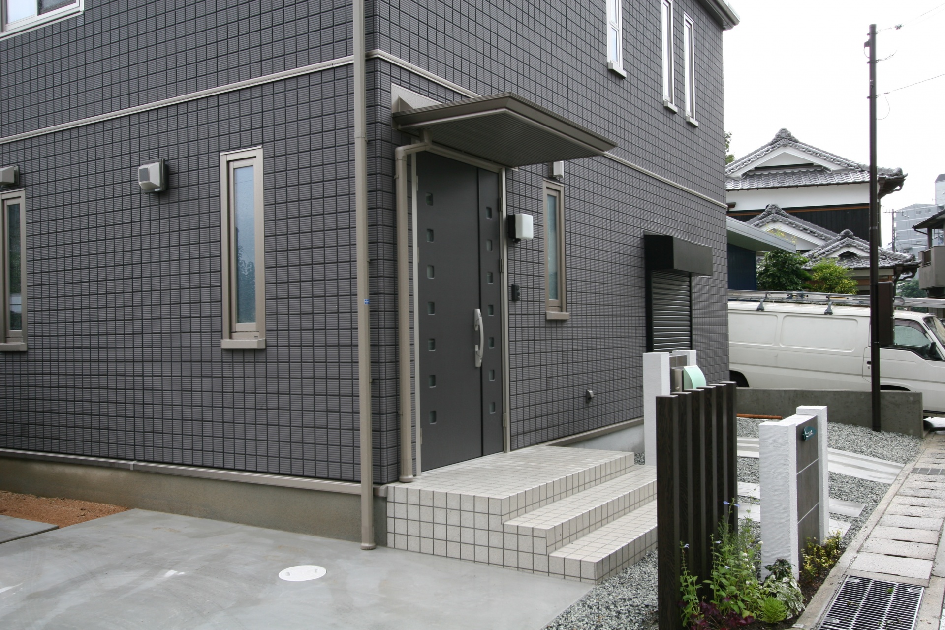 スタイル別施工実績 モノトーン門柱 姫路市K様邸 建物のモノトーンかつシャープな外観に合わせる様に面と線を基調に設計しました。門柱、塀には下地ブロックの厚みを変え300角タイルを白目地で仕上げ強調しています。アプローチもモノトーンな色目でまとめ玄関ポーチ前のエバーアートウッド(木調アルミ角柱)が全体を引き締めます。またポスト、表札にはグリーン色を使い植え込みの緑とのコントラストを楽しめます。 ホワイトとブラックの組み合わせが全体を引き締めます。 ポストはシーズンミラノをセレクト。 アートウッドフェンスがポイントです。