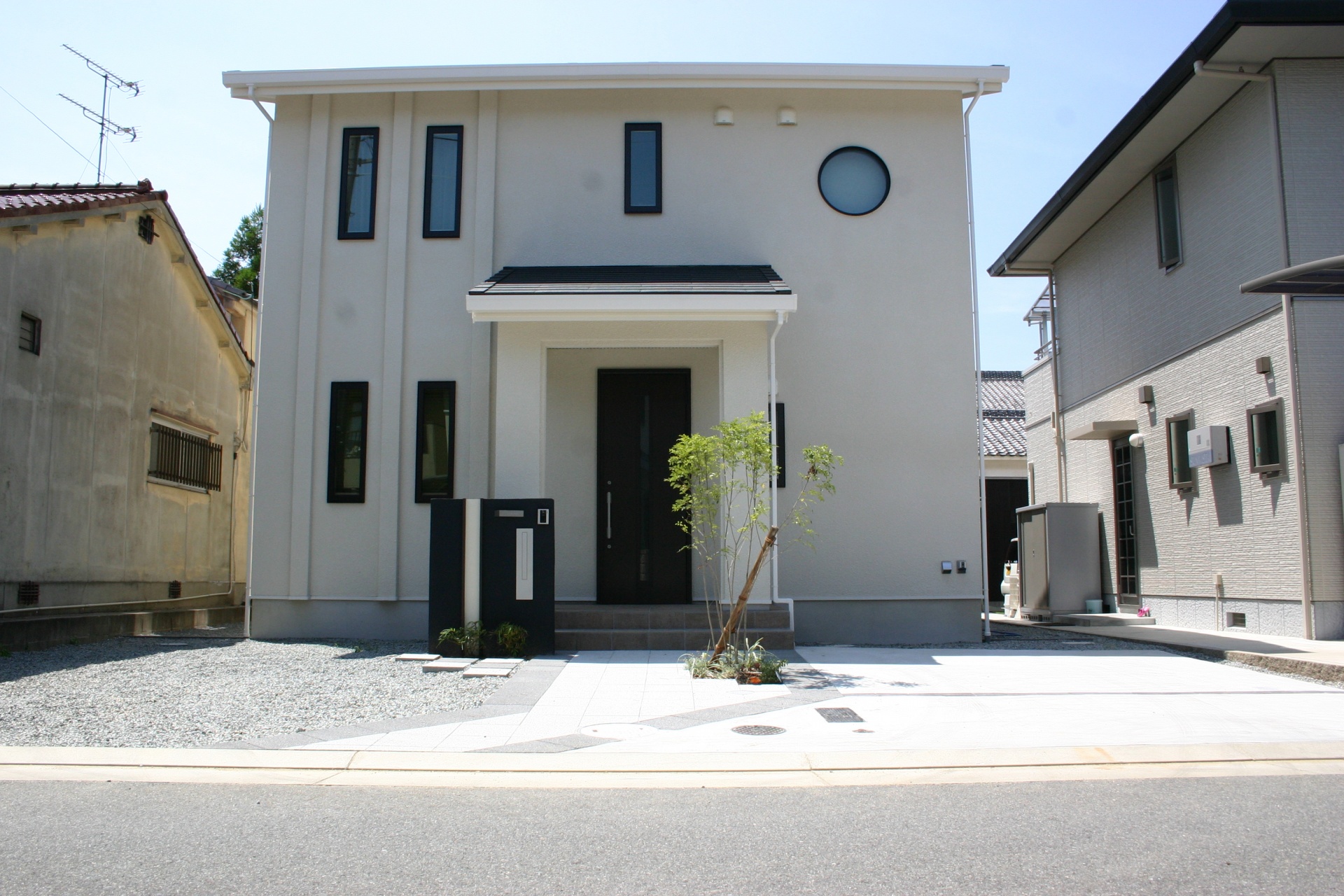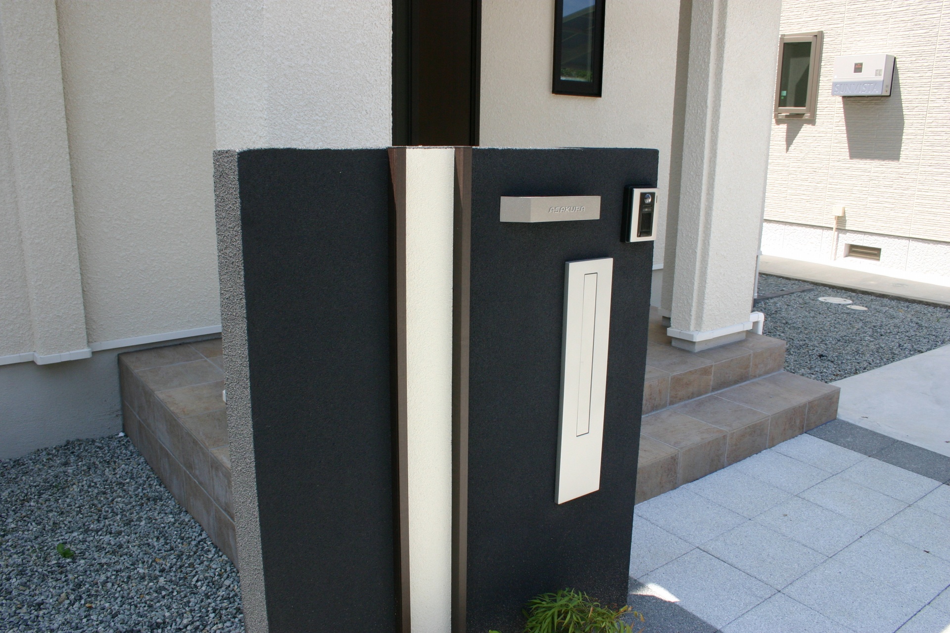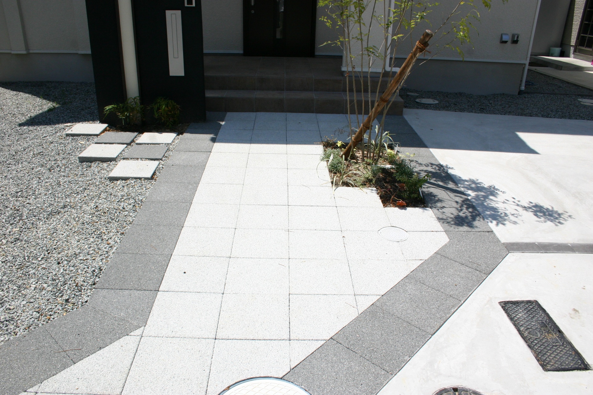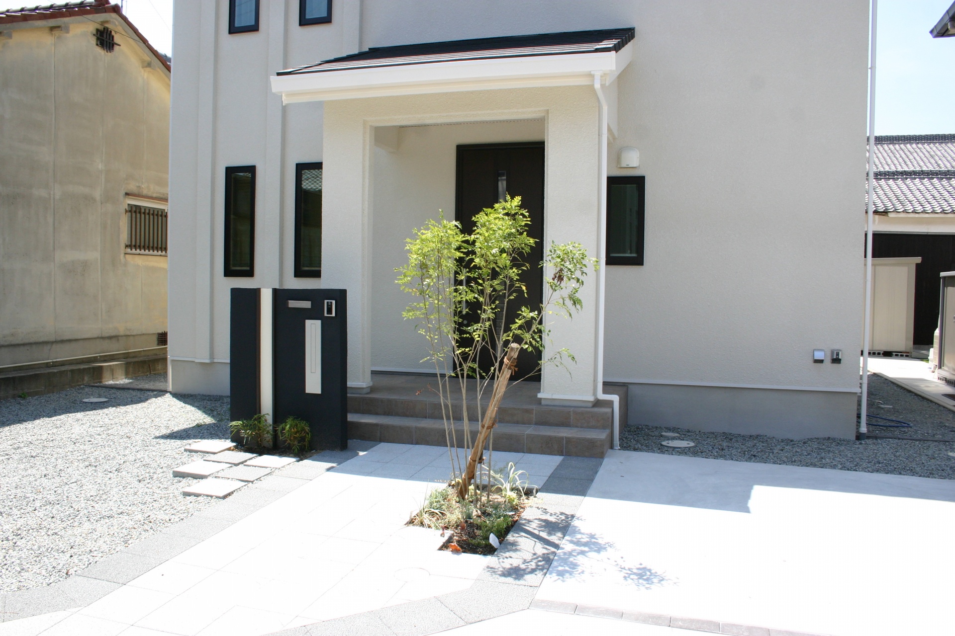 スタイル別施工実績 シンプルモダンスタイル門柱エクステリア 姫路市A様邸 ホワイトモダンの建物にブラックのシンプルアクセント門柱をデザインしました。縦にホワイトのラインをウッドのバーで色分けしたオリジナルデザイン門柱です。アプローチサイドのシマトネリコのグリーンがお客様をやさしくお出迎えしてくれます。 鋳物のオリジナルサインがデザイン門柱に個性を持たせます。 アプローチ周り全景。300角UDウォ―クをラインを生かしてデザインしたアプローチデザイン。 縦のラインを意識したオリジナル門柱デザイン。ポストもスリムタイプの縦型でコーディネイトしました。