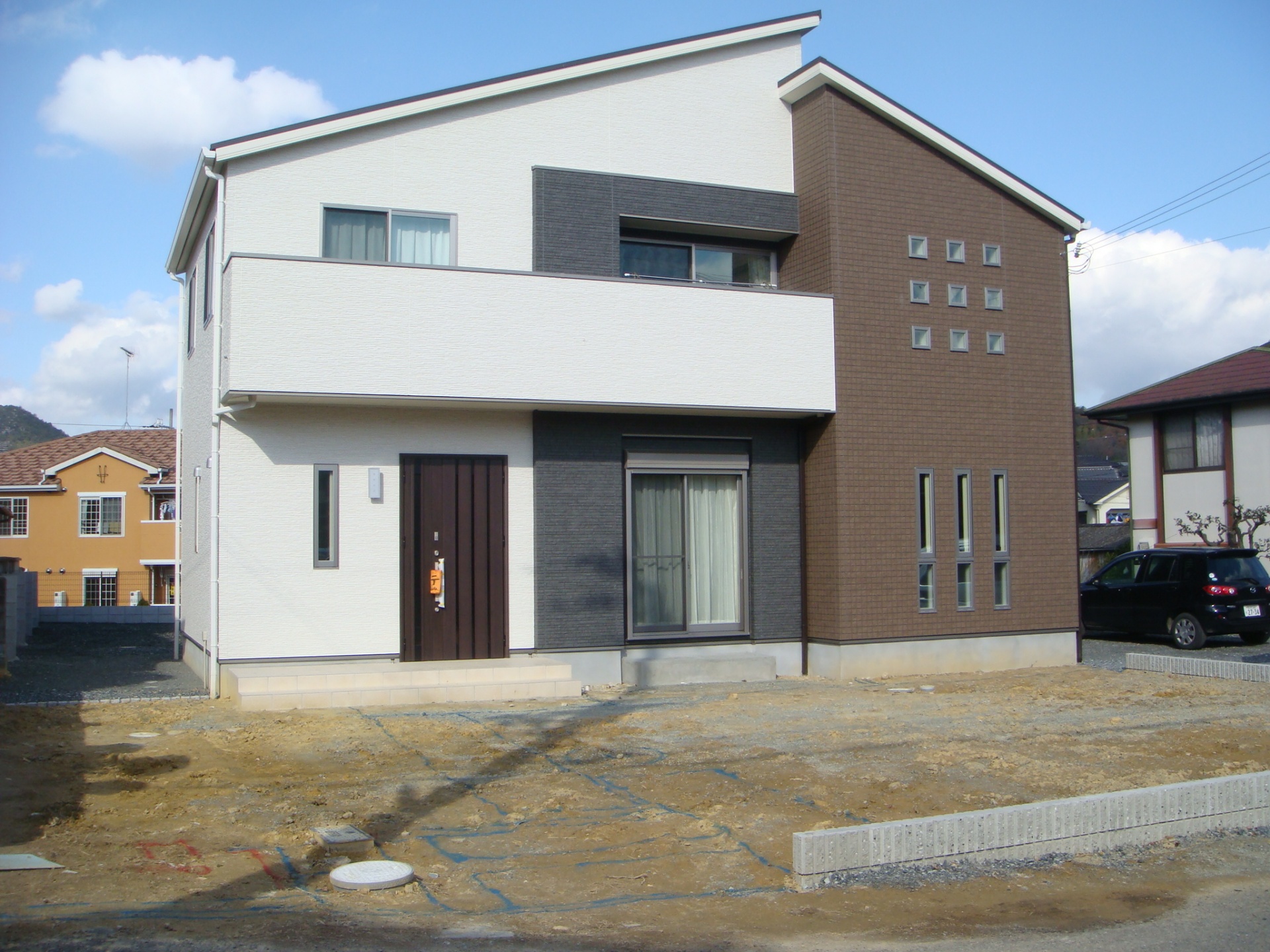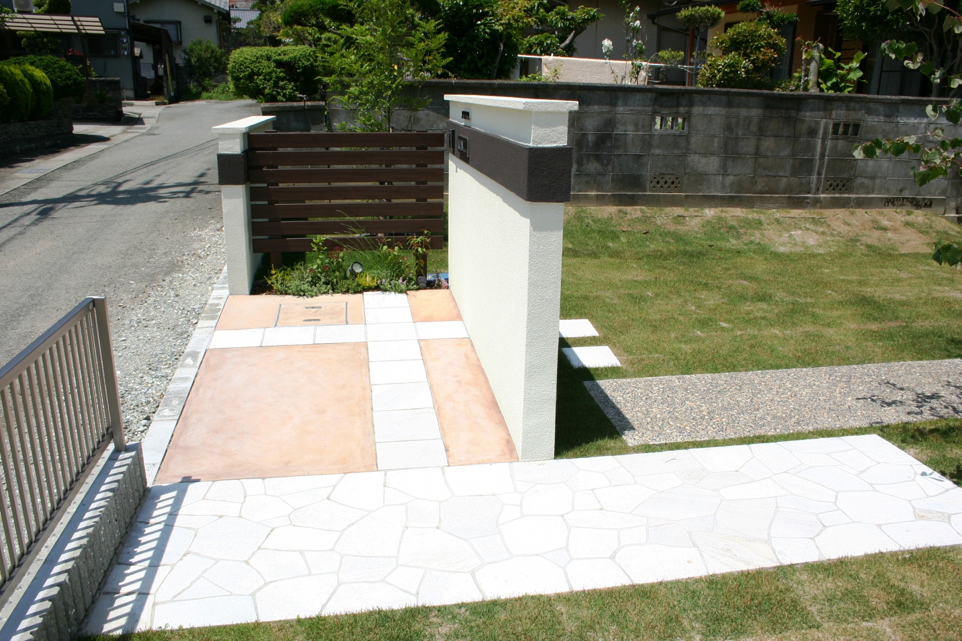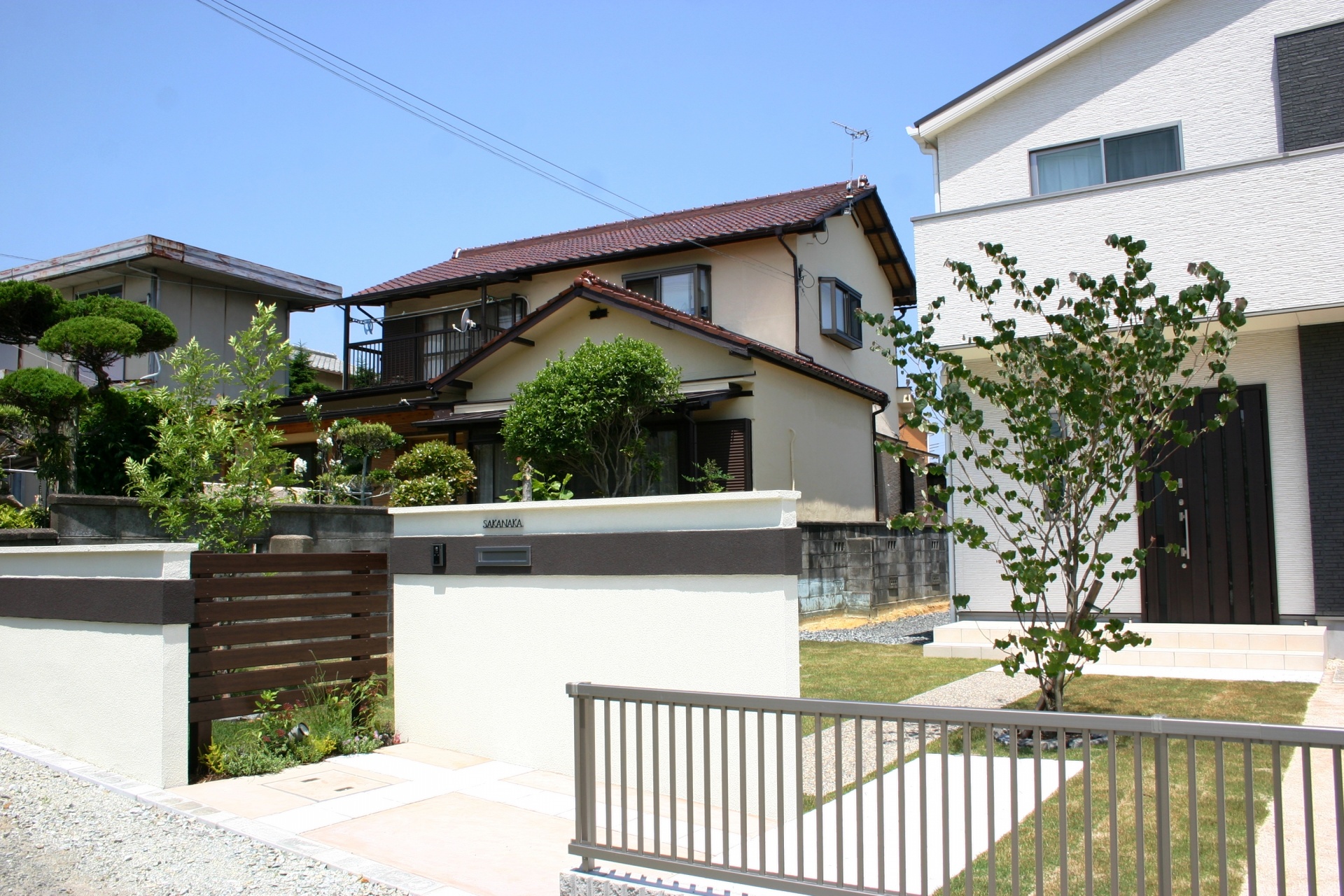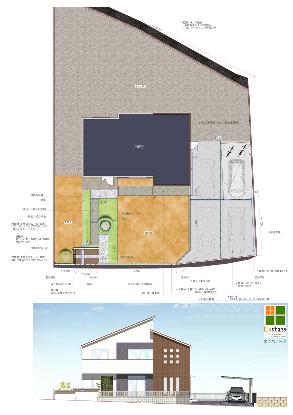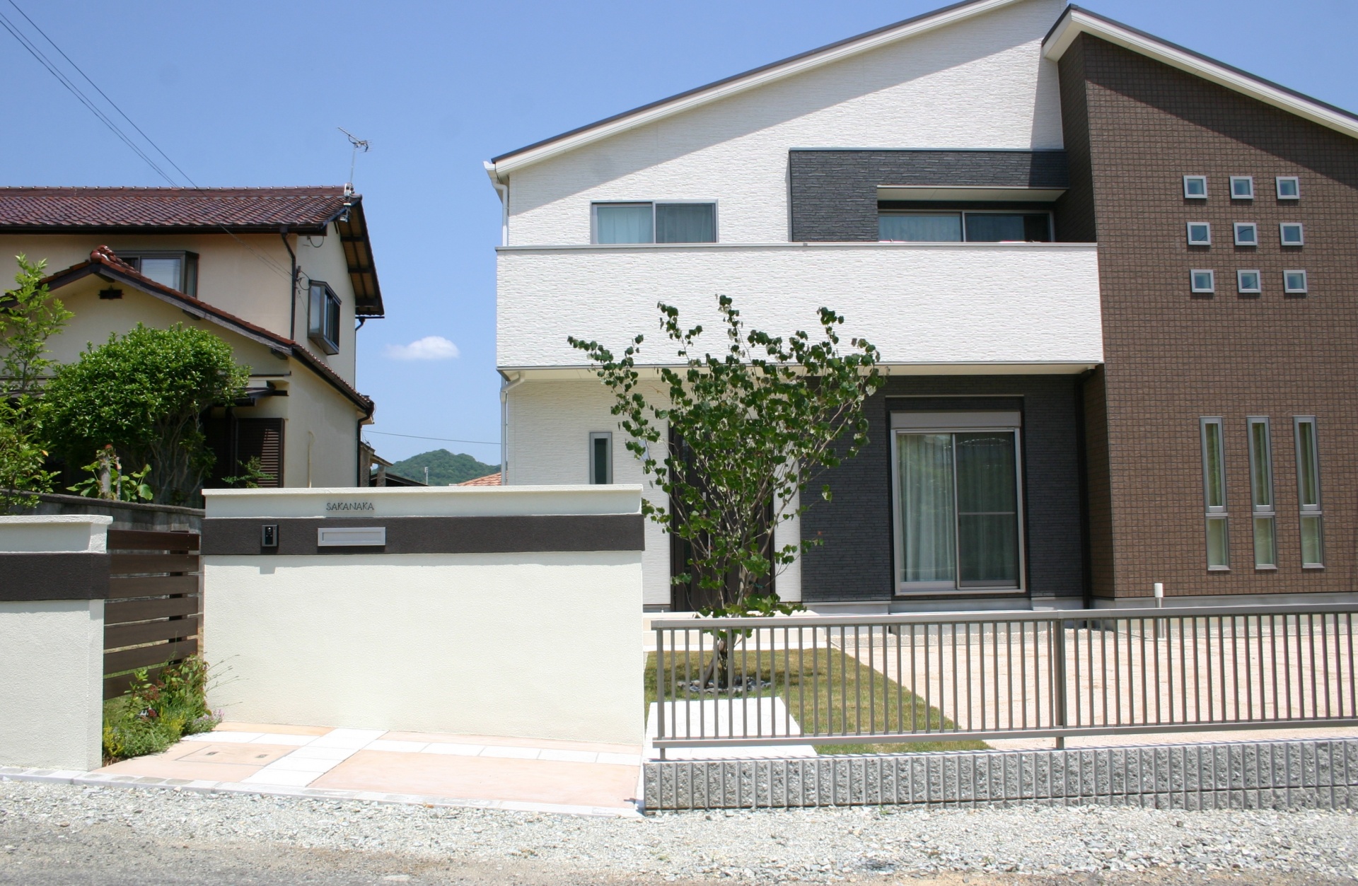 スタイル別施工実績 シンプルな門袖壁でセミクローズエクステリア 相生市S様邸 セミクローズスタイルの相生市S様邸 境界ブロックと車庫工事はご入居前にハウスメーカーさんでされていましたので、この度は門周り~アプローチの工事となりました 門周りに色替えした水平ラインで建物に合わせたモダンな雰囲気にしています 門袖壁を交わすと秋の紅葉が待ち遠しいマルバノキが出迎えてくれます before 平面立面計画図 門袖壁の間は木目調アルミフェンス+植栽で来客を迎えます の自然石アプローチの先にはシンボルツリーのマルバノキ