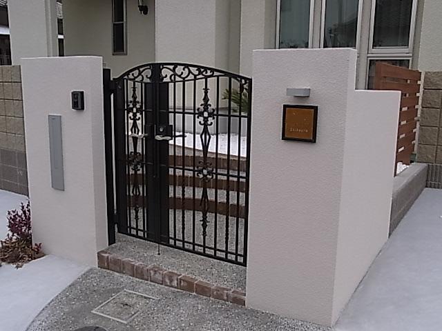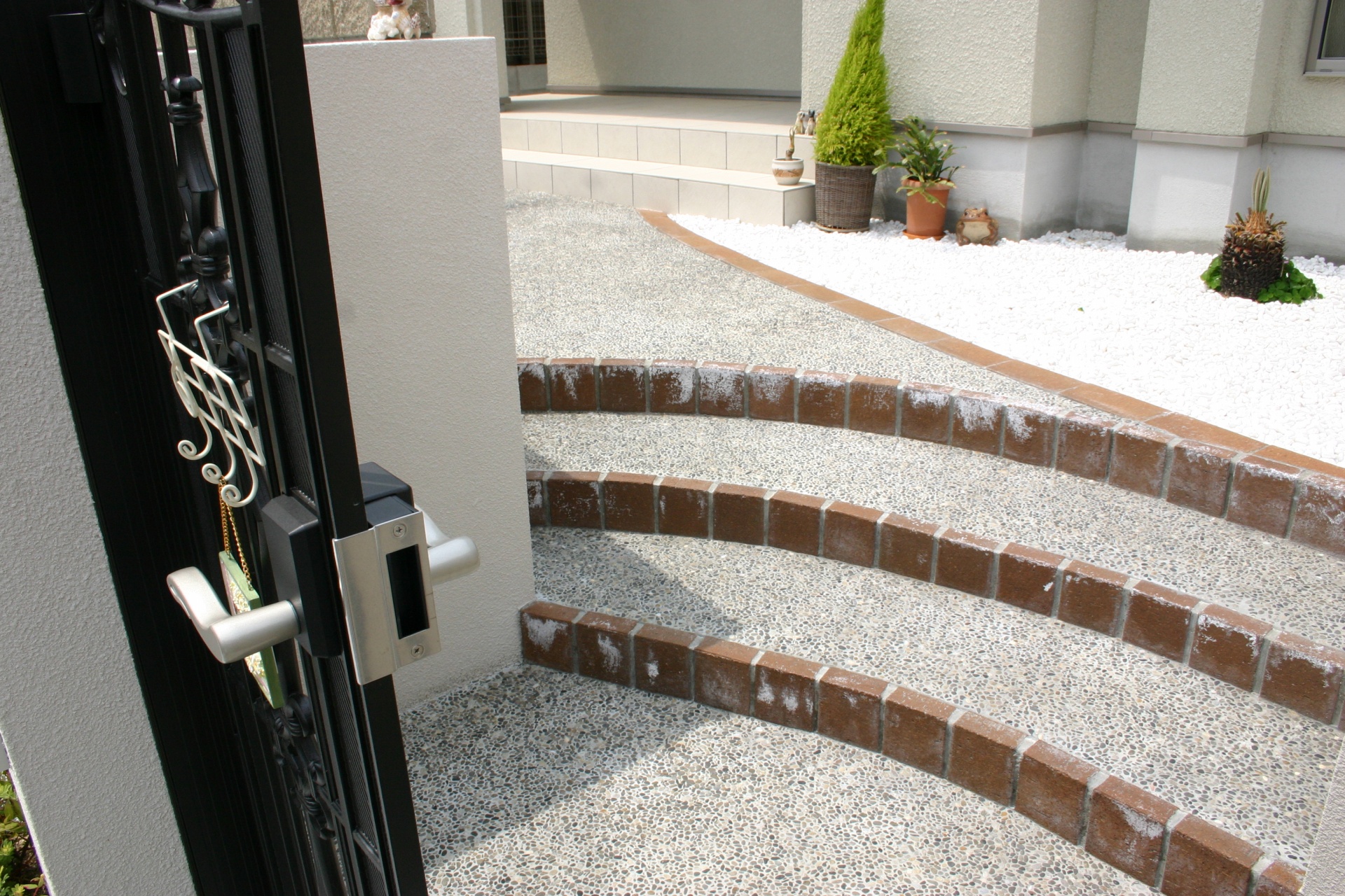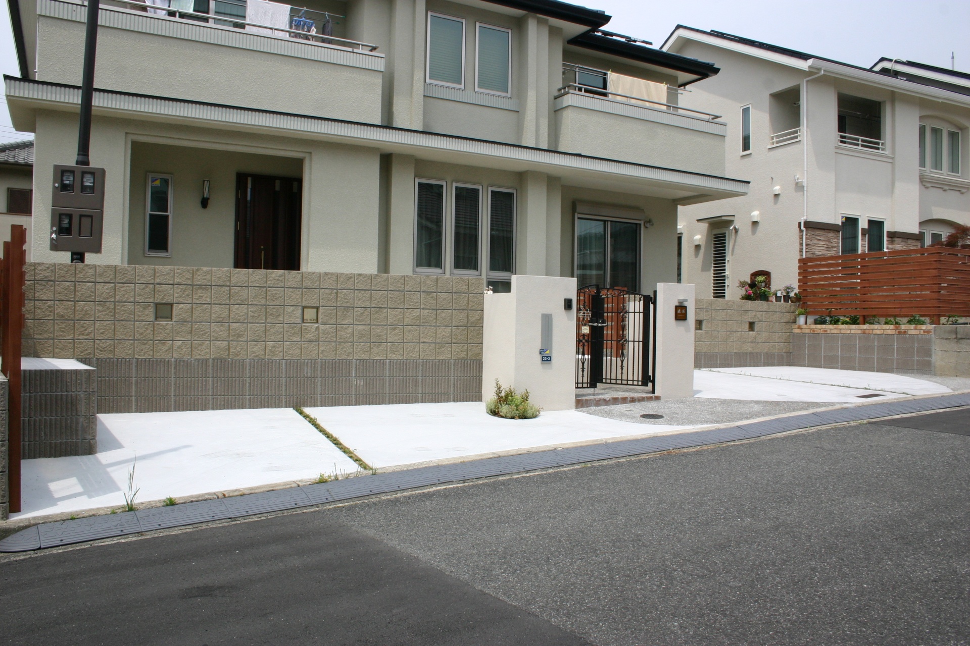 スタイル別施工実績 水平ラインのクローズプラン 姫路市S様邸 化粧ブロックの水平ラインで上品なエクステリアに仕上げました。隣合う世帯とのバランスを考慮し2棟の一体感を意識しました。玄関門扉はリクシルキャスティナ門扉の高級感のある門周りにデザインしました。 ホワイト門柱と高級キャスティナ門扉の組み合わせ。 落ち着きのある美浜の洗出しをセレクト。
