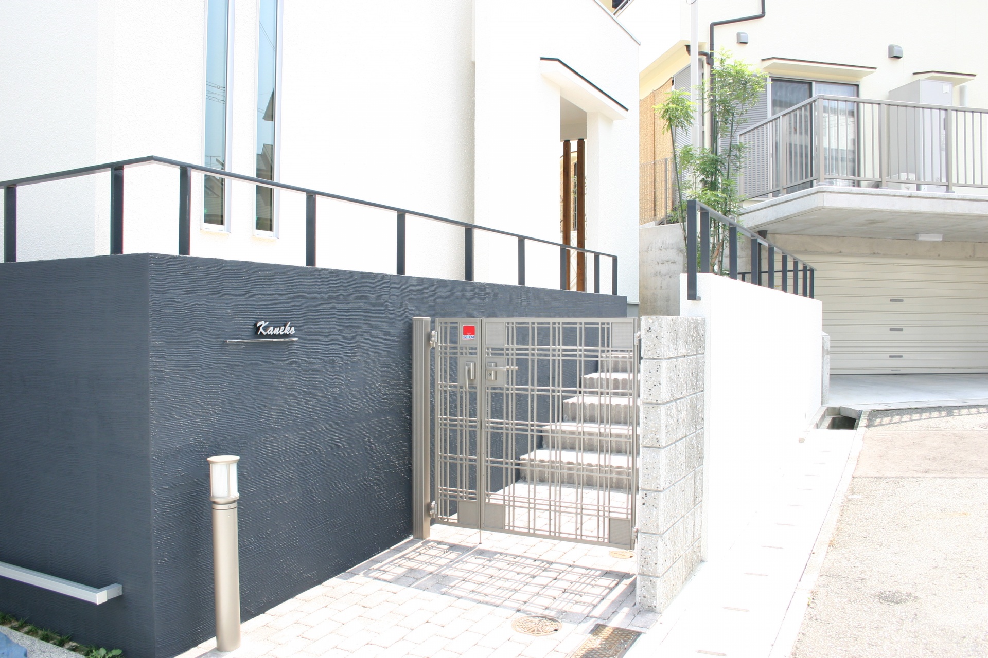 スタイル別施工実績 ホワイトアンドブラック 神戸市K様邸 ホワイトの壁にシンボルツリーのトネリコがよく似合います。 濃紺色のフラットバーは施主様の支給品を取付、インパクトのあるデザインになりました。 玄関はあえて正面から門扉が見えない様に設計。 夜になるとブラックの壁がポールライトによって演出されます。 ホワイトの建物に映るシンボルツリーのトネリコ。ブラックとホワイトとのコラボレーションにアクセントのフラットバーが落下防止の柵になっています。