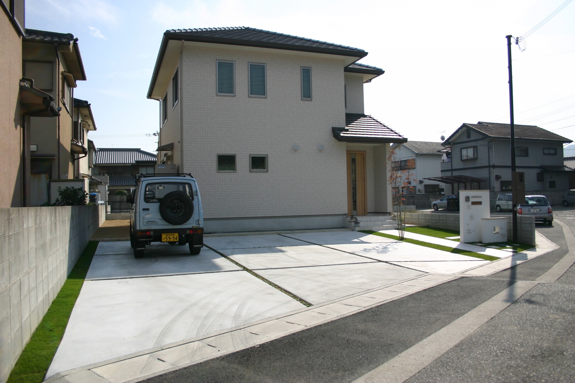 施工実績 ストレートラインのシンプル外構 たつのエクステリア ストレートのタイルラインアプローチと花弁をモチーフとしたエクステリア外構デザイン。アオダモの紅葉が季節を感じさせてくれます。 四季を感じさせる植栽。 全景。