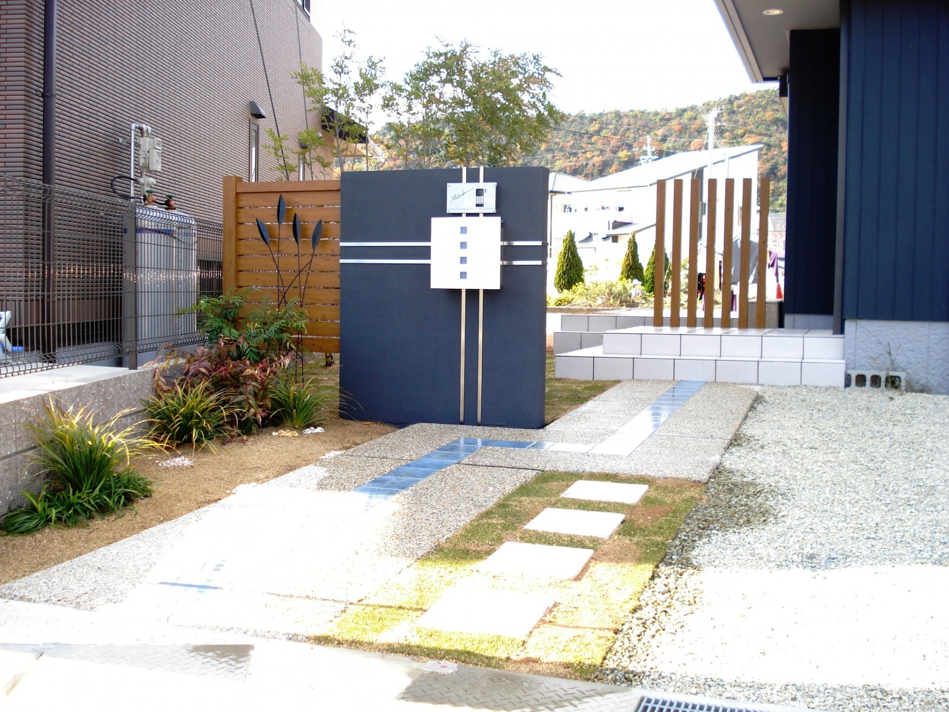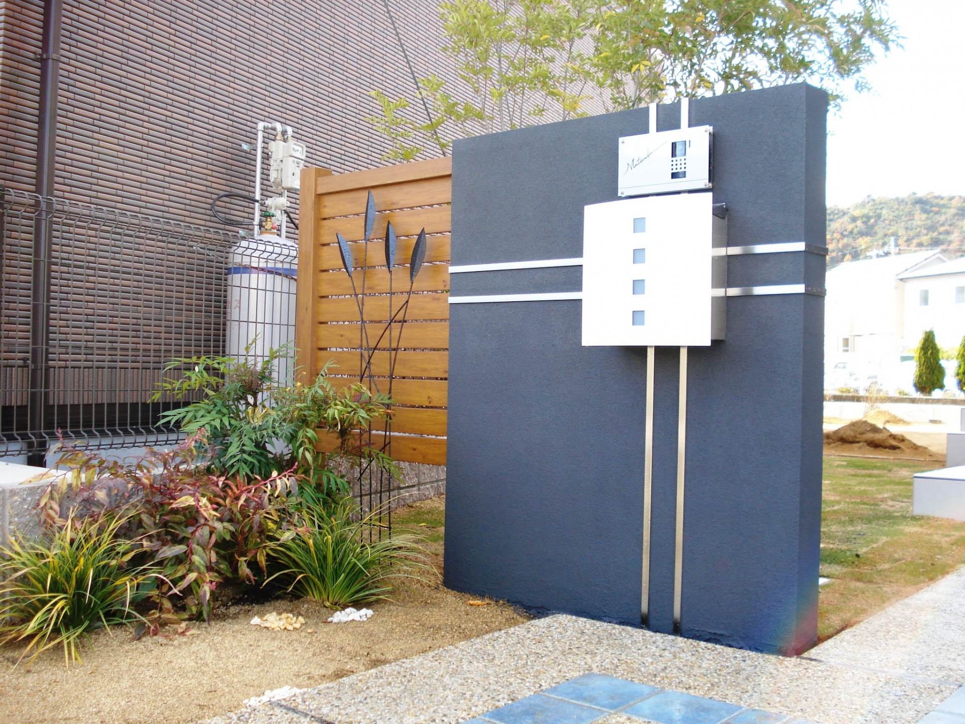 施工実績 ダークブルーシンプルエクステリア 赤穂新築外構 ダークブルーのオリジナル門柱にステンレスの鏡面ラインをデザインしたシンプルモダン門柱デザイン。赤穂市エクステリア施工例。シーズンポストのホワイトがポイントです。 オリジナルのインターホンカバーとサインが一体となったシンプルな門周りエクステリア。 サイドのウッドフェンスとアイアンオブジェがポイントです。