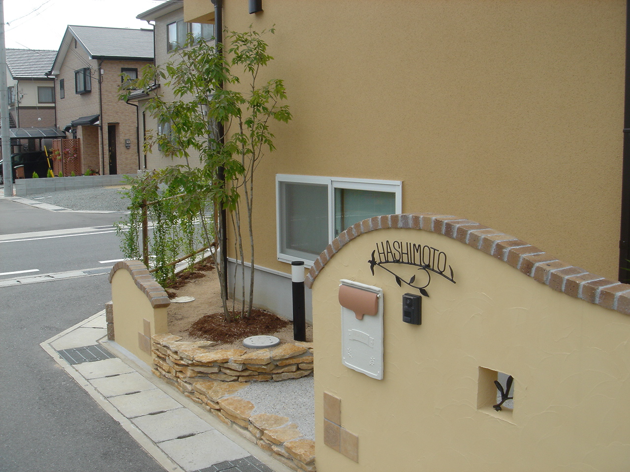 グリーンとレンガ笠木のコラボエクステリア たつの市新築外構