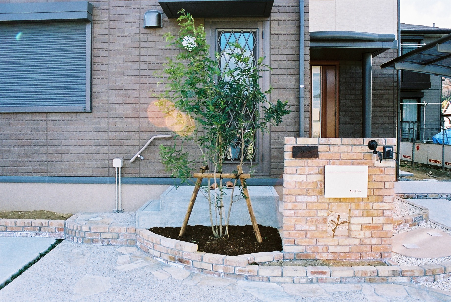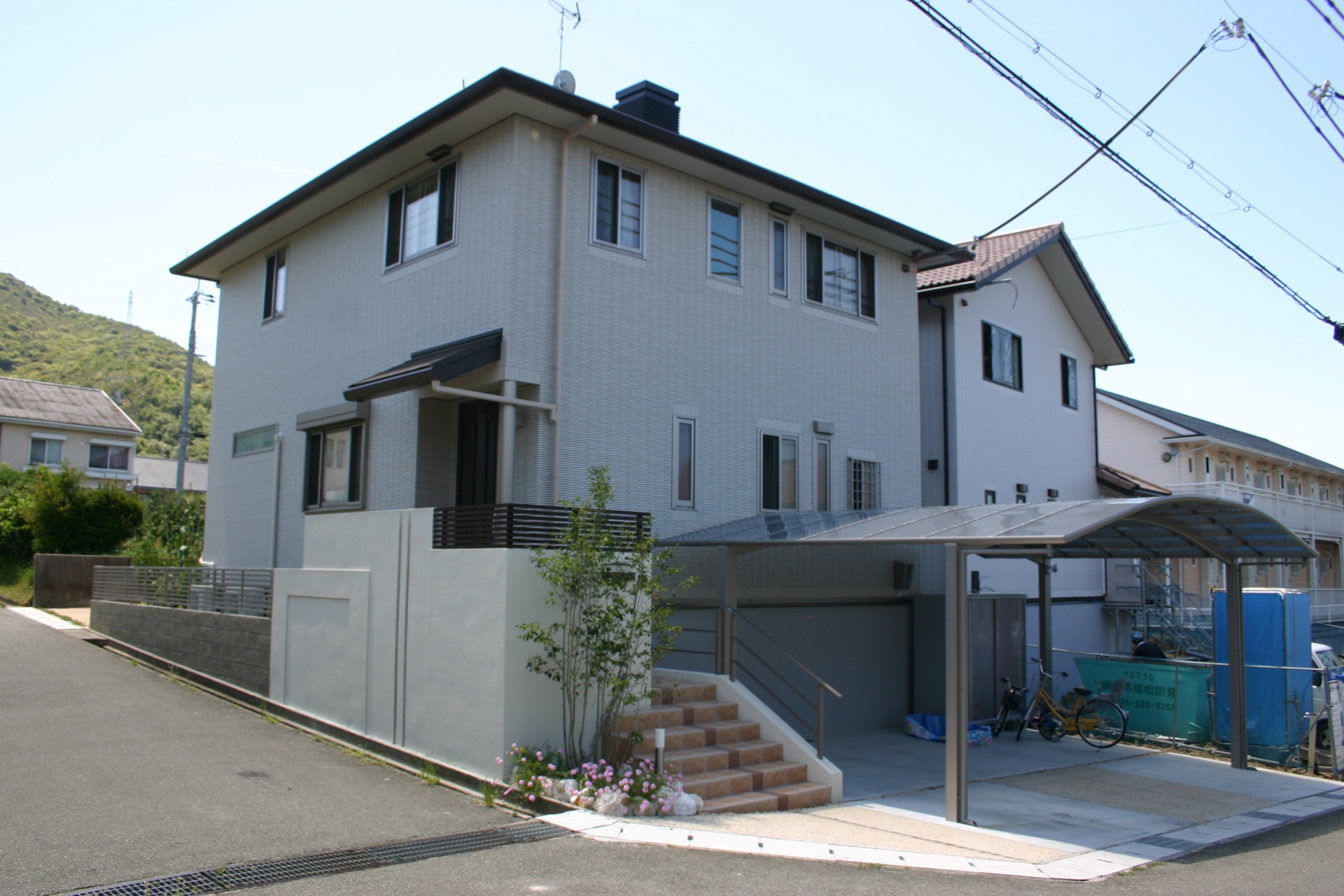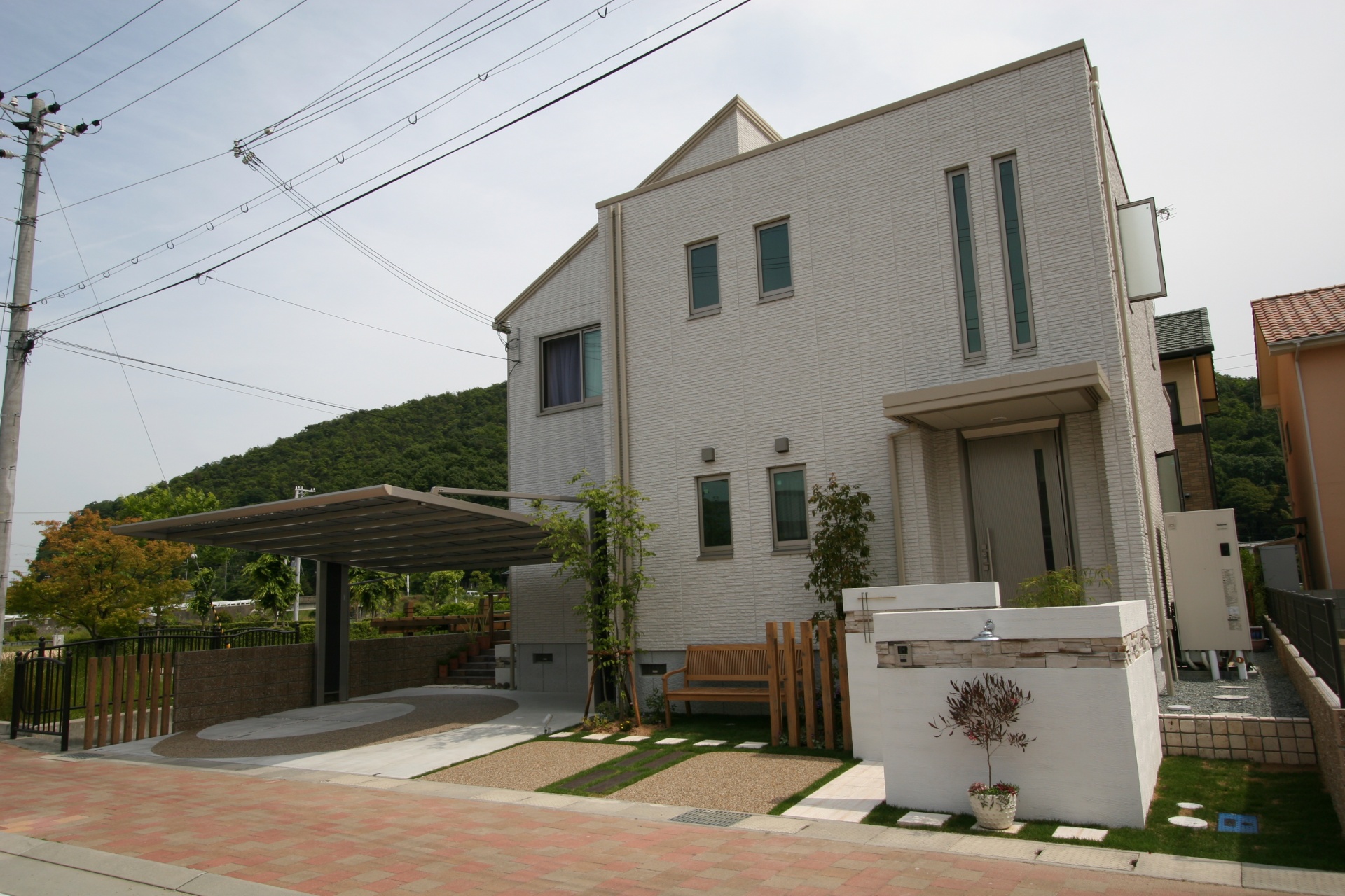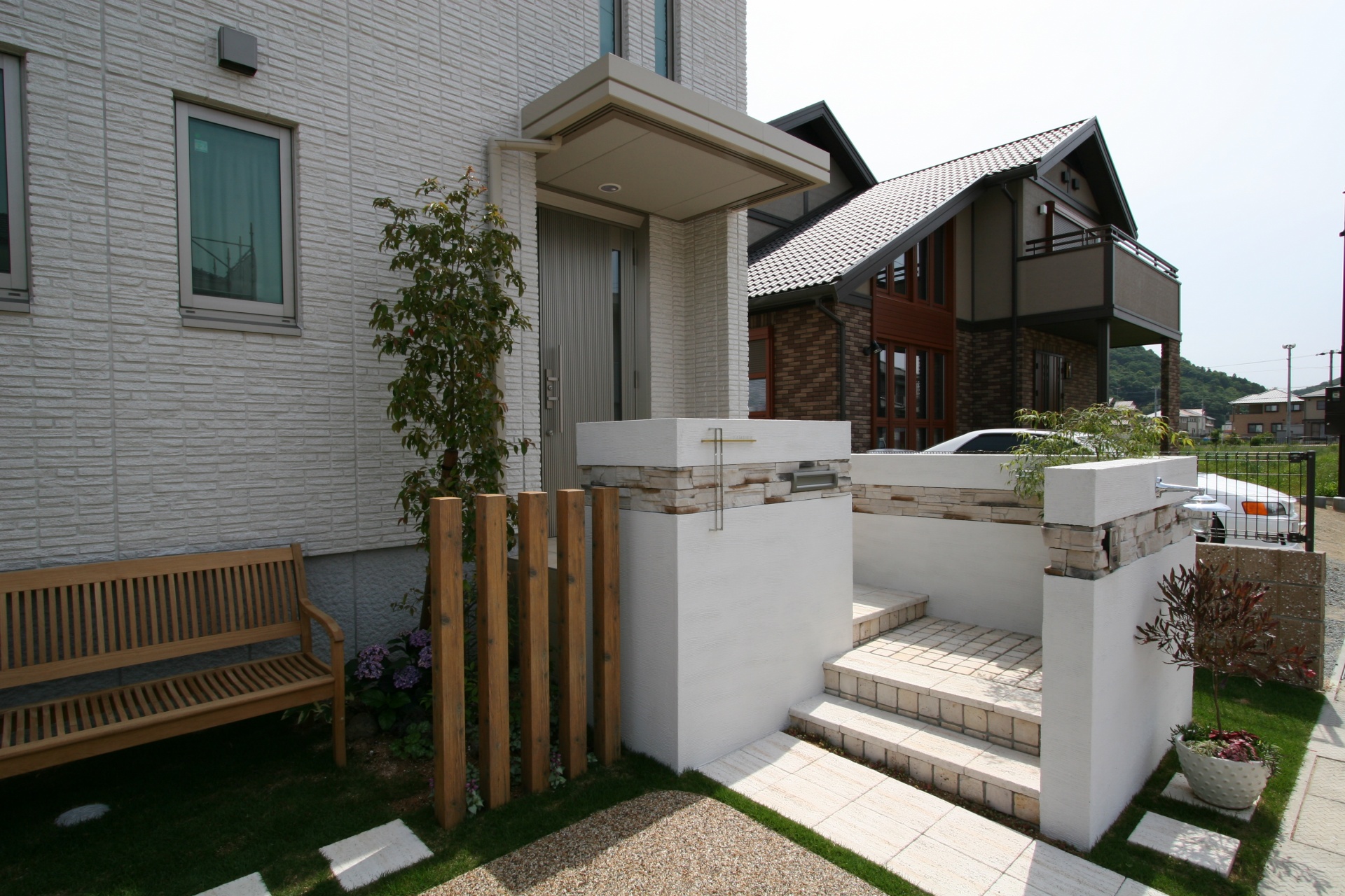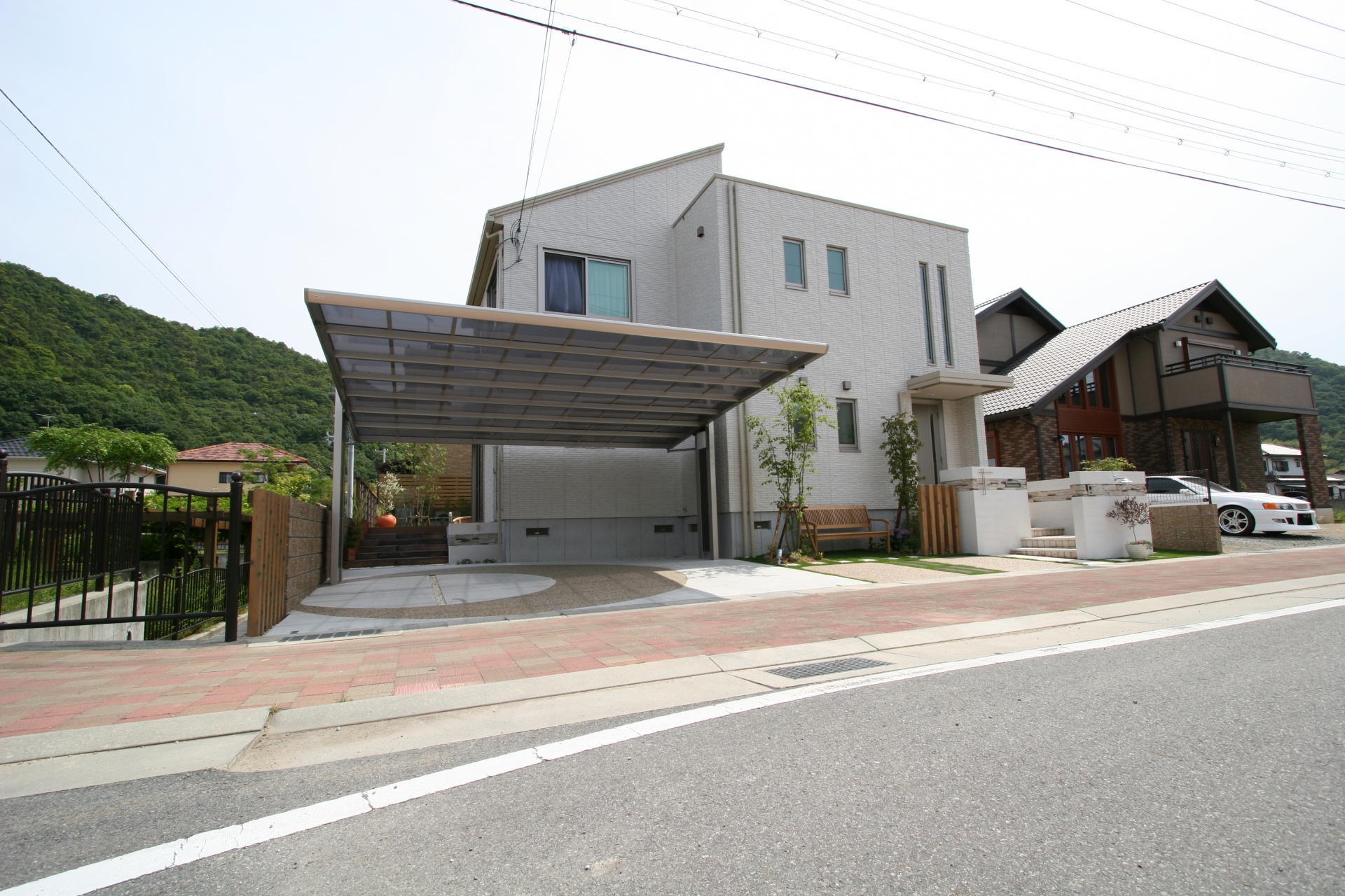 施工実績 マイポートデザインエクステリア たつの市新築外構 サブスペースを含め3台のパーキングスペースをデザインよくマイポートのカーポートをセレクトして設計しました。ホワイトを基調にした上品なエクステリアが完成しました。 門柱サイドのウッド調角柱。ベンチとのコラボがGOODです。 全景エクステリア。