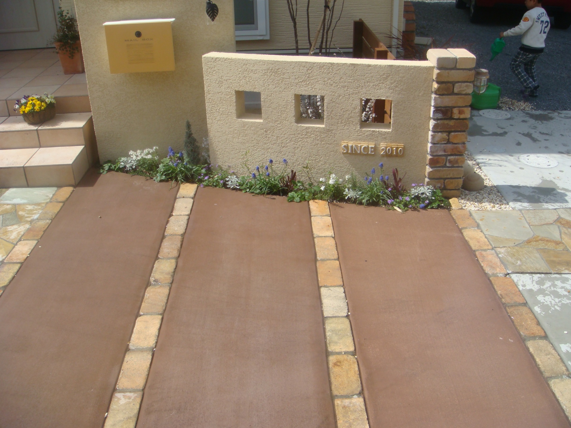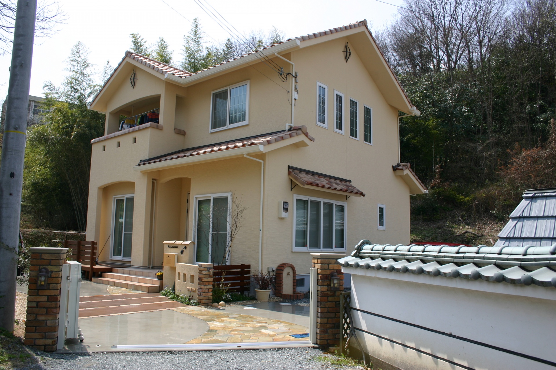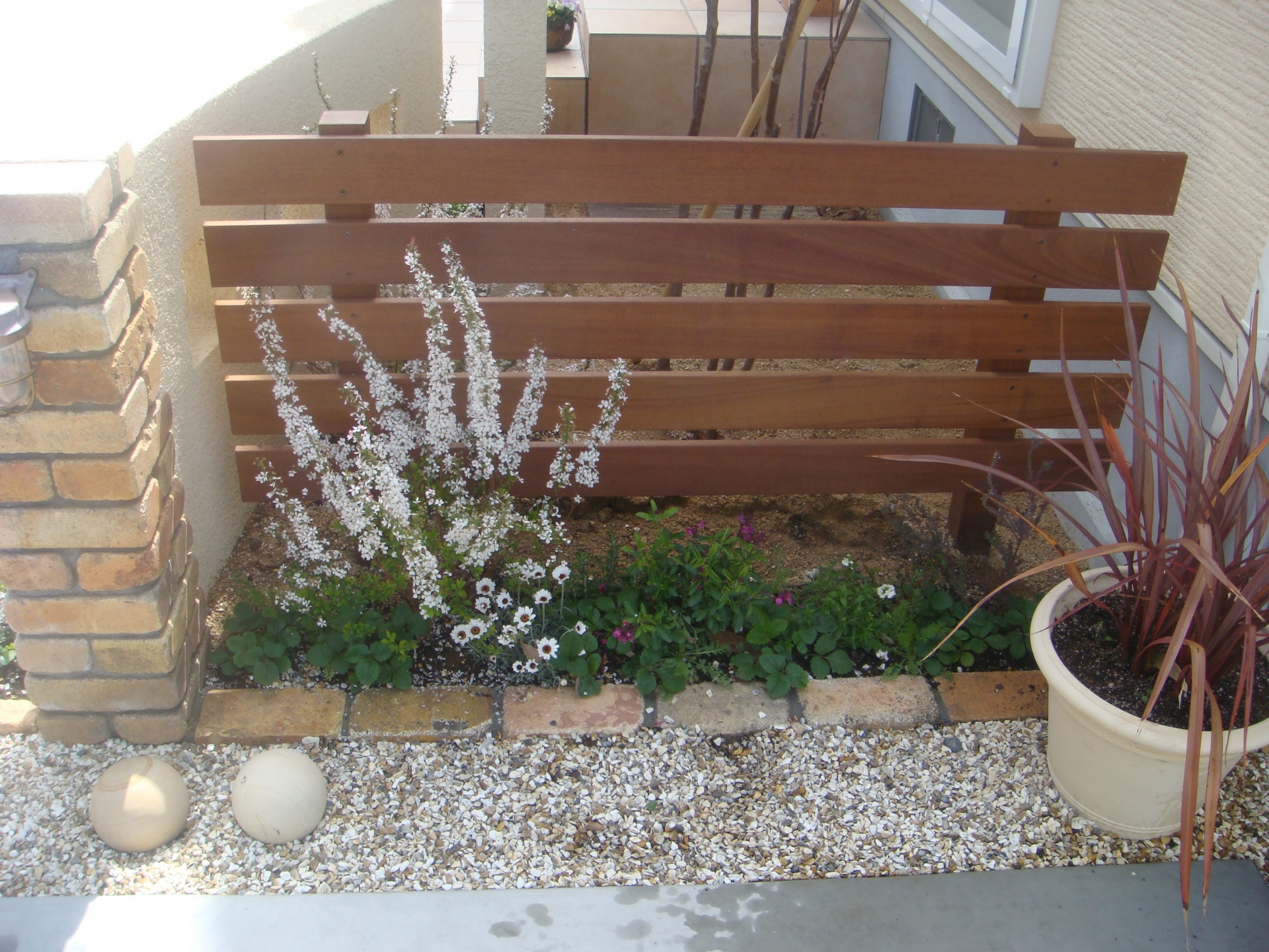 施工実績 プロバンスを意識したナチュラルデザイン 相生新築外構 プロバンス瓦を使用したナチュラルエクステリアデザイン。ディーズガーデンの小物がソフトイエローの洋風の建物のエクステリアデザインによく似合います。 ナチュラル感を演出する天然ウリンのウッドフェンスをポイントに。 カーラーコンクリート土間にアンティ―クレンガで線のアクセントをデザイン。 ナチュラルエクステリア全景。