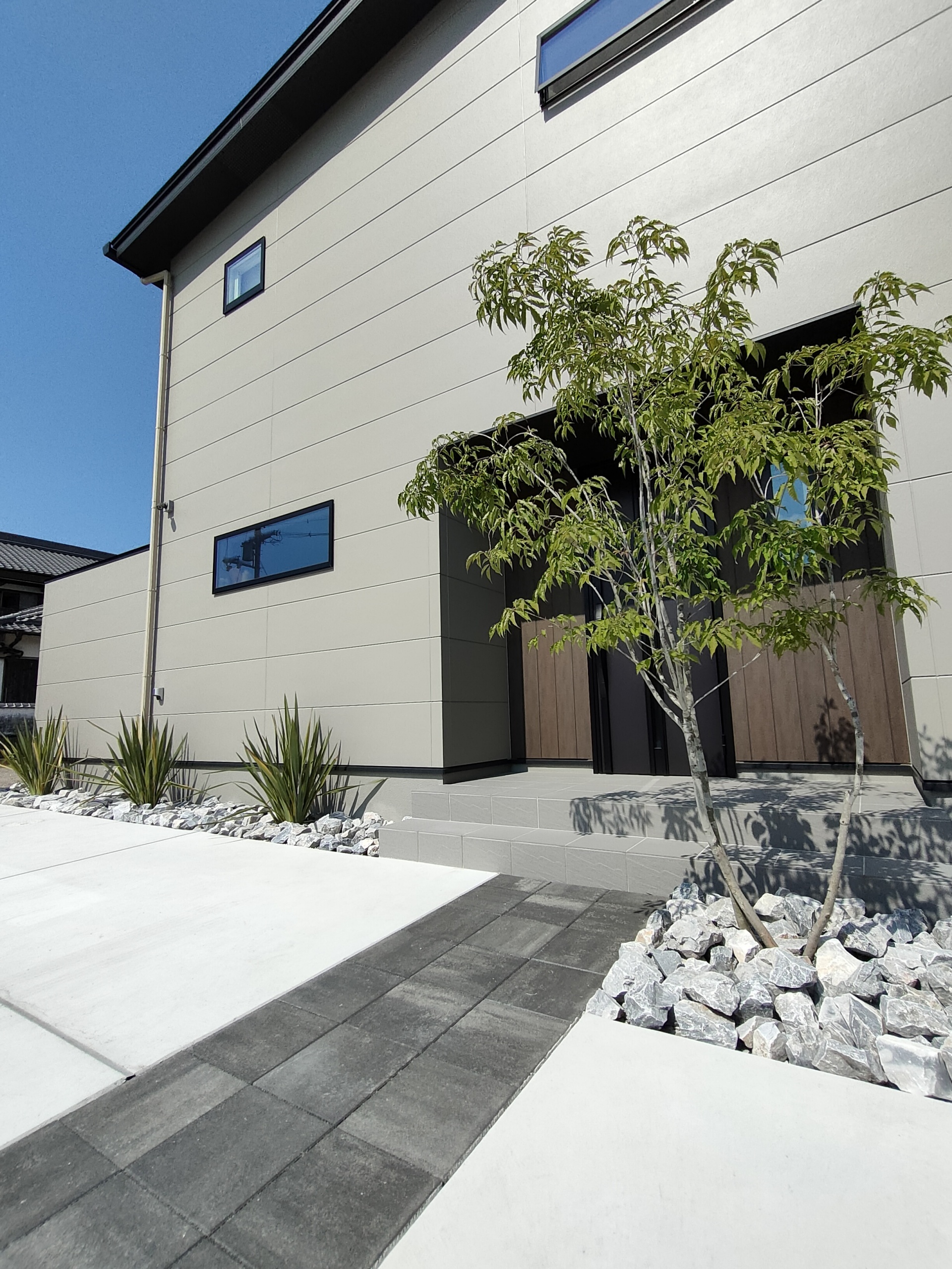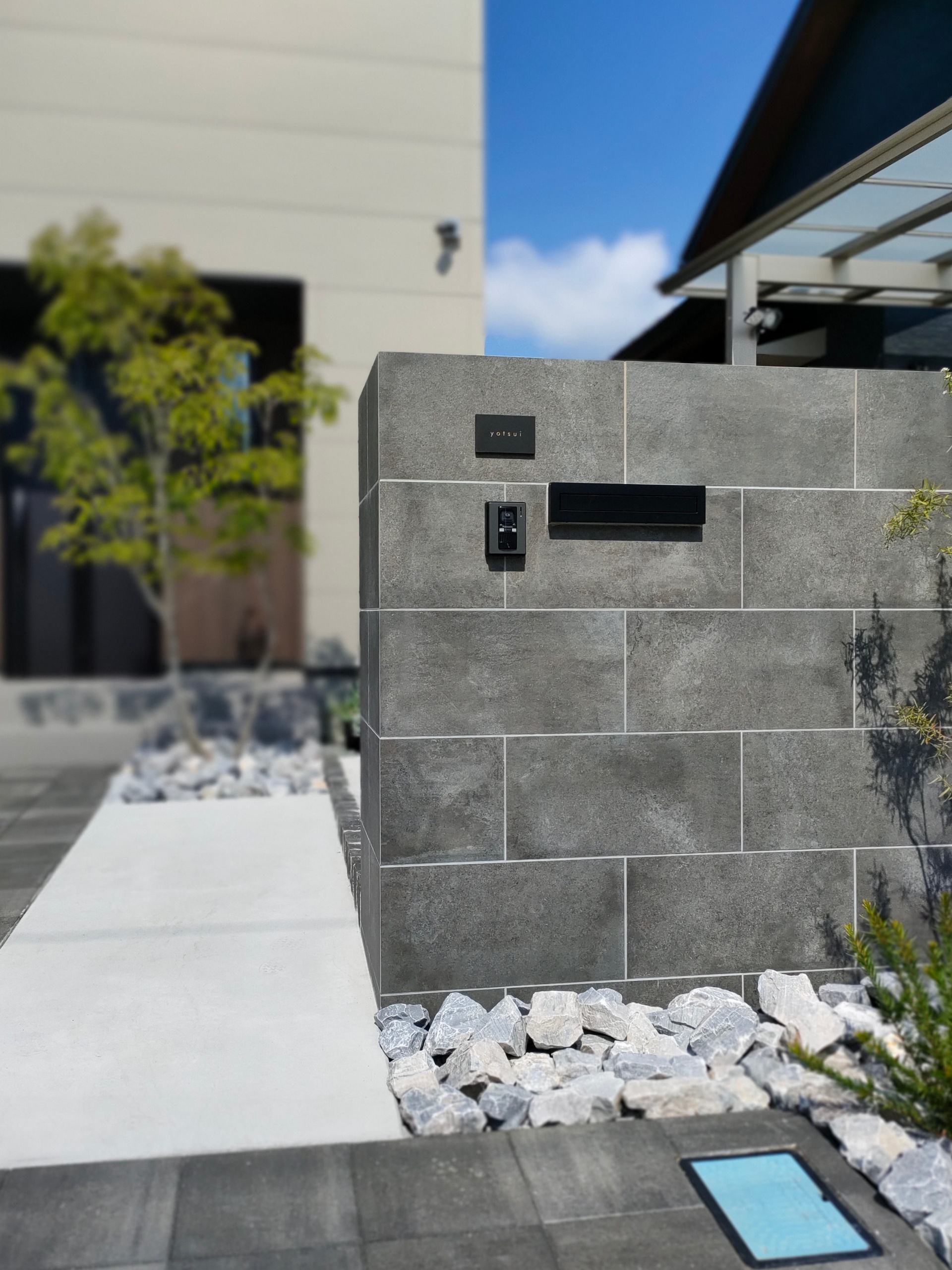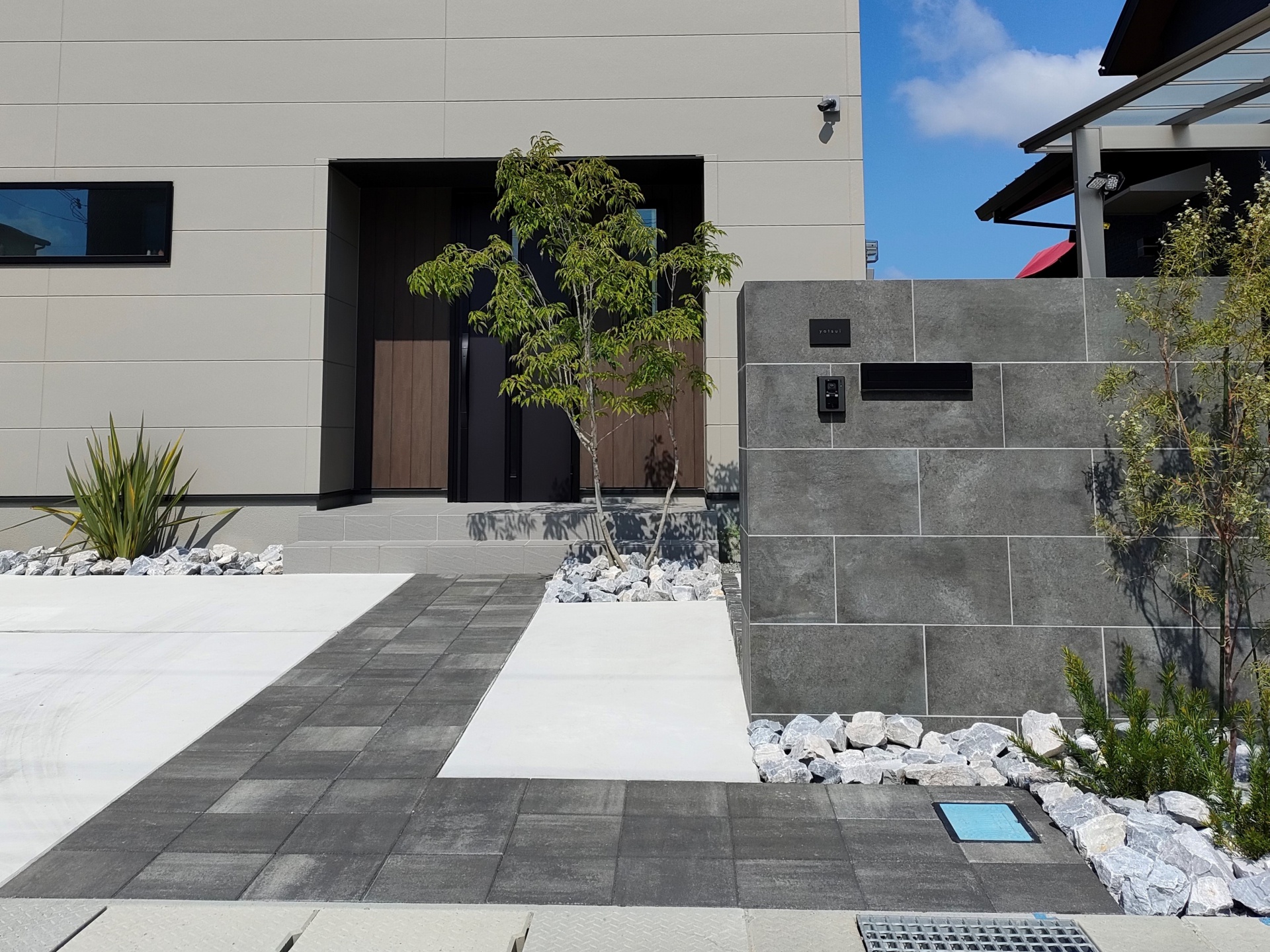施工実績 たつの市新築外構 シンプルモダン タイル門柱で格好いい外構デザイン シンプルな建物外観に合わせ黒のタイルでモダンなエクステリアに仕上げました たつの市Y様邸直線的なデザインを主体とし 門柱やアプローチの色目を黒で統一し格好いい外構になりました グレー色の握りこぶし程度の自然石を植栽足元に敷き詰め、 タイル門柱前にはシルバーティーツリー、建物基礎際にはニューサイランを配置 シャープな葉先でよりスッキリとした印象になっています before イメージパース 植栽のライトアップ 門柱にタイルを使用するとすっきりと見え迫力があります形は長方形で馬目地仕様 クールなイメージの大きめ石と組み合わせると、モダンさが引き立ちます表札やポストもタイルよりはっきりとした黒で統一し、タイルとメリハリをつけて主張は控えめにしています モダンなタイル門柱 門柱から玄関扉正面へと続くすっきりとした直線デザインのアプローチアプローチのタイルは少し色幅を持たせることで単調さを解消しています Y様ご家族との出会いはメールでのお問い合わせよりご連絡頂き、ご来店頂けたのがきっかけでした。打合せ後、現地を訪れ建物外観を見た際に「シンプルでクールモダンな外構デザインにしようと」思いましたタイルと石を引立たせるのに植栽の緑も要所に取り入れることにしましたシャープな葉先やシルバーリーフなど黒を基調としたモダンな外構にはぴったりの植栽をご提案出来たと思います黒とグレーと緑、少ない色目でシンプルで格好いい外構が完成しました「ありがとうございました」 お客様の声 ▼数ある中からエクステージをお選び頂きました理由をお聞かせ下さい。 SNSやホームページを見てお願いしたいと思ったから ▼ご感想・お気付きの点をお聞かせ下さい 思った通りの外構にしてくれてありがとうございました。 何かあればこれからもよろしくお願いします。