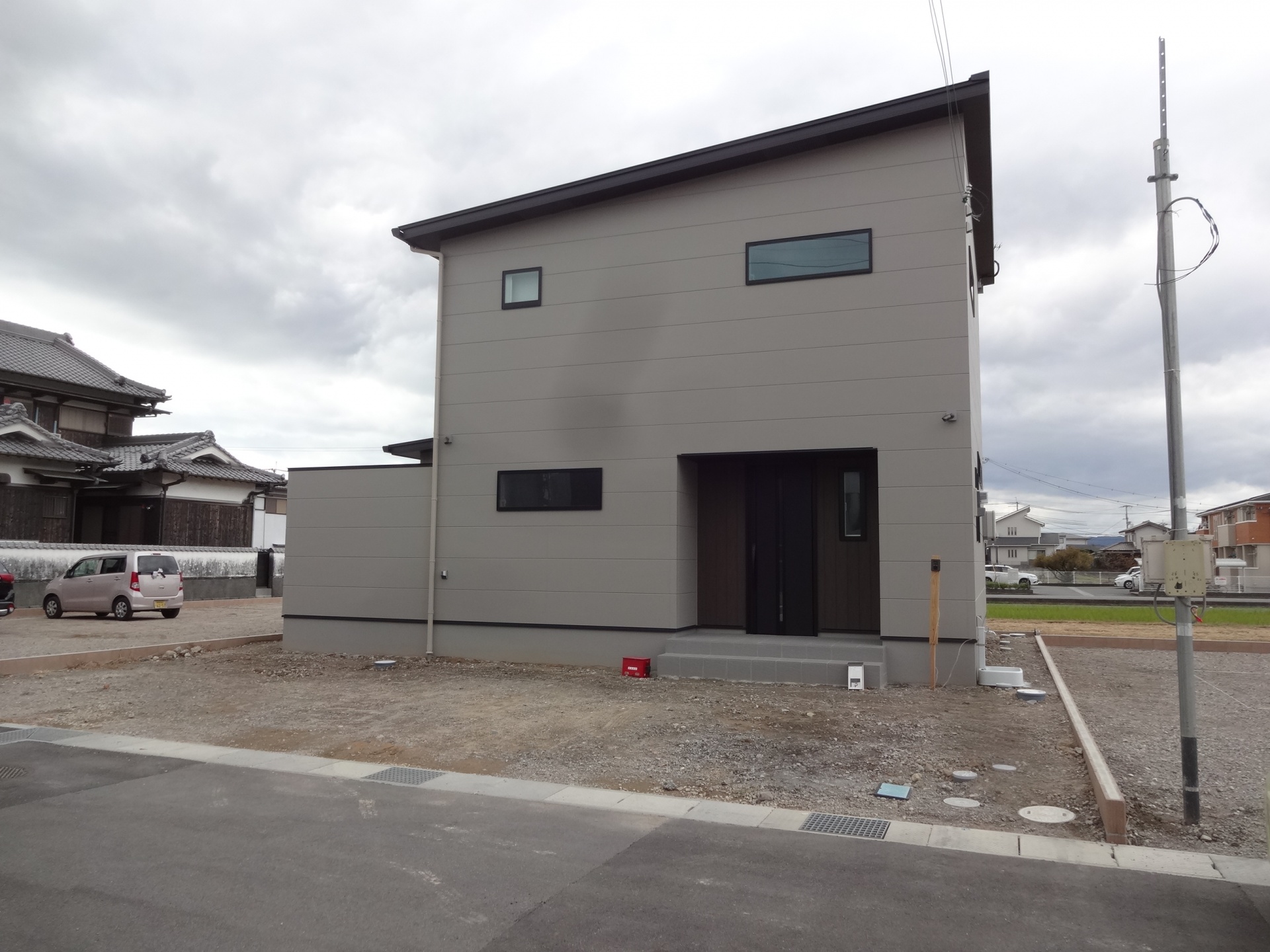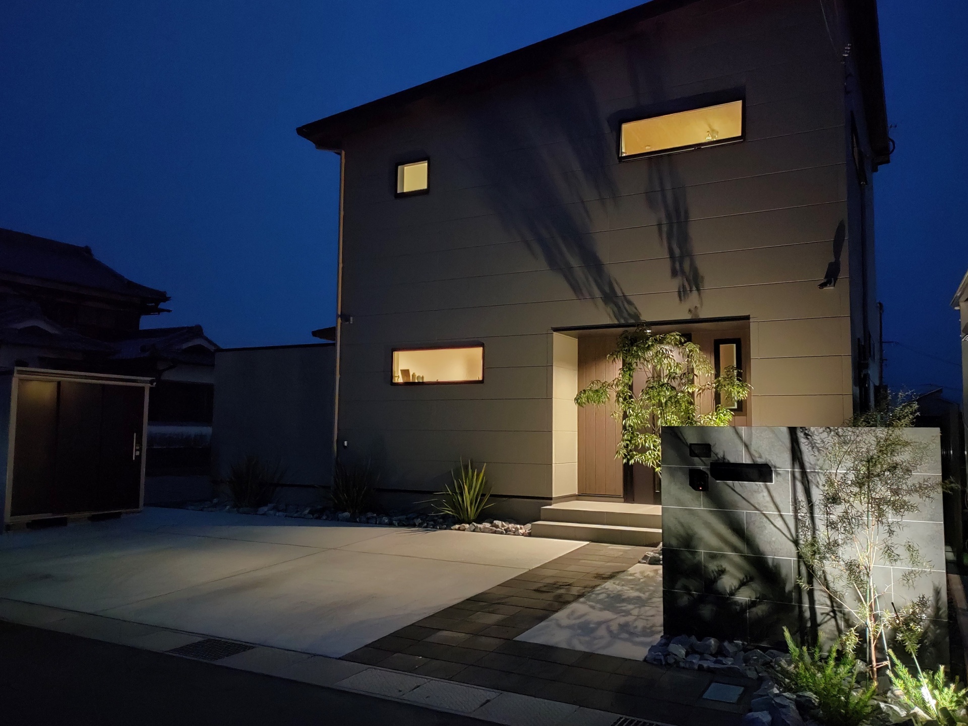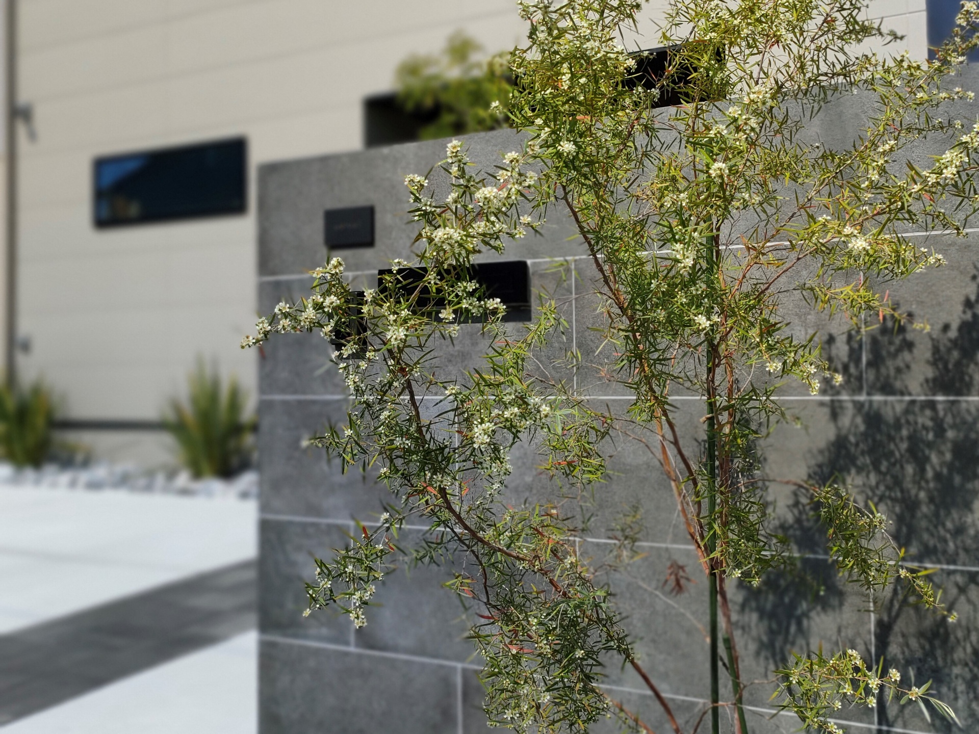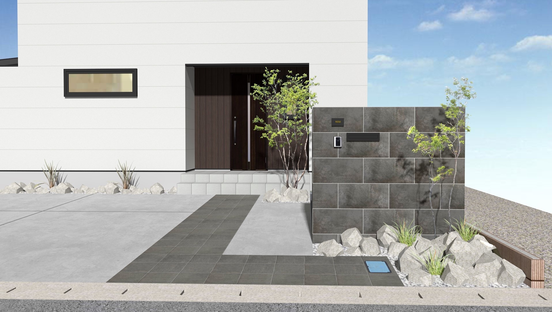施工実績 たつの市新築外構 シンプルモダン タイル門柱で格好いい外構デザイン シンプルな建物外観に合わせ黒のタイルでモダンなエクステリアに仕上げました たつの市Y様邸直線的なデザインを主体とし 門柱やアプローチの色目を黒で統一し格好いい外構になりました グレー色の握りこぶし程度の自然石を植栽足元に敷き詰め、 タイル門柱前にはシルバーティーツリー、建物基礎際にはニューサイランを配置 シャープな葉先でよりスッキリとした印象になっています before イメージパース 植栽のライトアップ 門柱にタイルを使用するとすっきりと見え迫力があります形は長方形で馬目地仕様 クールなイメージの大きめ石と組み合わせると、モダンさが引き立ちます表札やポストもタイルよりはっきりとした黒で統一し、タイルとメリハリをつけて主張は控えめにしています モダンなタイル門柱 門柱から玄関扉正面へと続くすっきりとした直線デザインのアプローチアプローチのタイルは少し色幅を持たせることで単調さを解消しています Y様ご家族との出会いはメールでのお問い合わせよりご連絡頂き、ご来店頂けたのがきっかけでした。打合せ後、現地を訪れ建物外観を見た際に「シンプルでクールモダンな外構デザインにしようと」思いましたタイルと石を引立たせるのに植栽の緑も要所に取り入れることにしましたシャープな葉先やシルバーリーフなど黒を基調としたモダンな外構にはぴったりの植栽をご提案出来たと思います黒とグレーと緑、少ない色目でシンプルで格好いい外構が完成しました「ありがとうございました」 お客様の声 ▼数ある中からエクステージをお選び頂きました理由をお聞かせ下さい。 SNSやホームページを見てお願いしたいと思ったから ▼ご感想・お気付きの点をお聞かせ下さい 思った通りの外構にしてくれてありがとうございました。 何かあればこれからもよろしくお願いします。