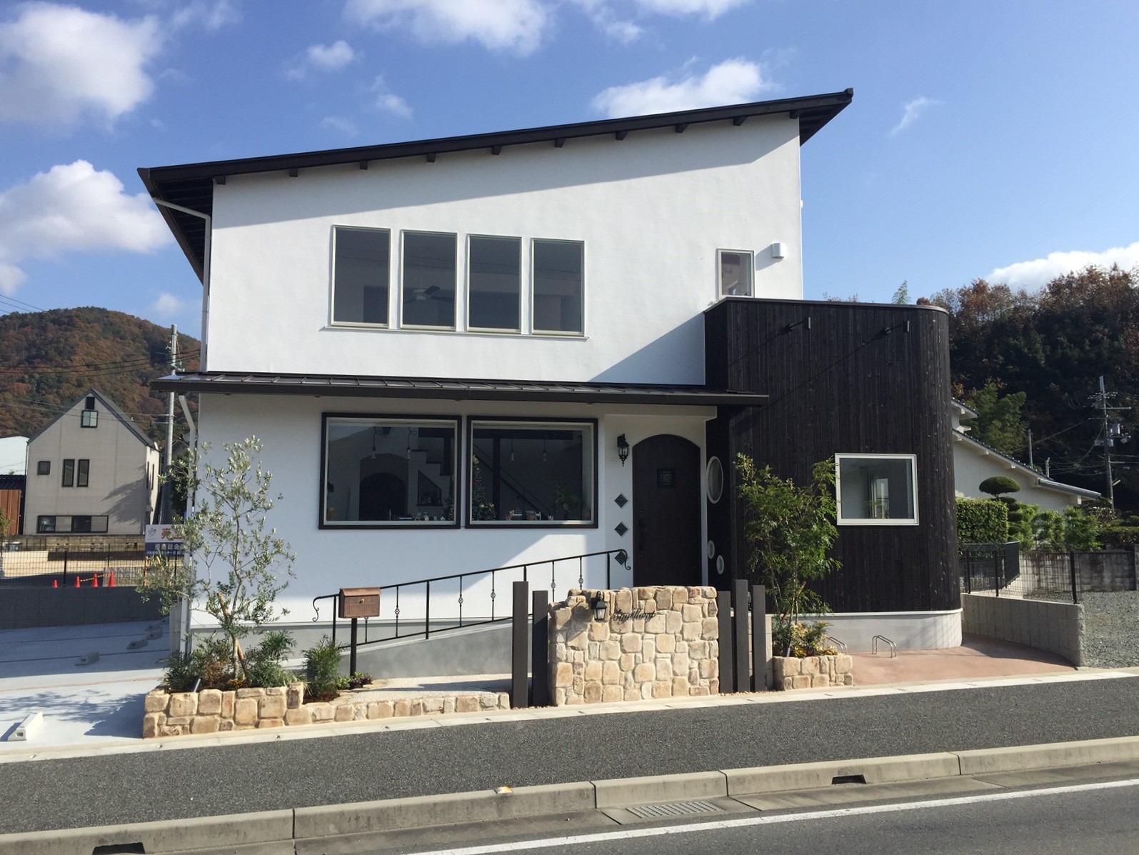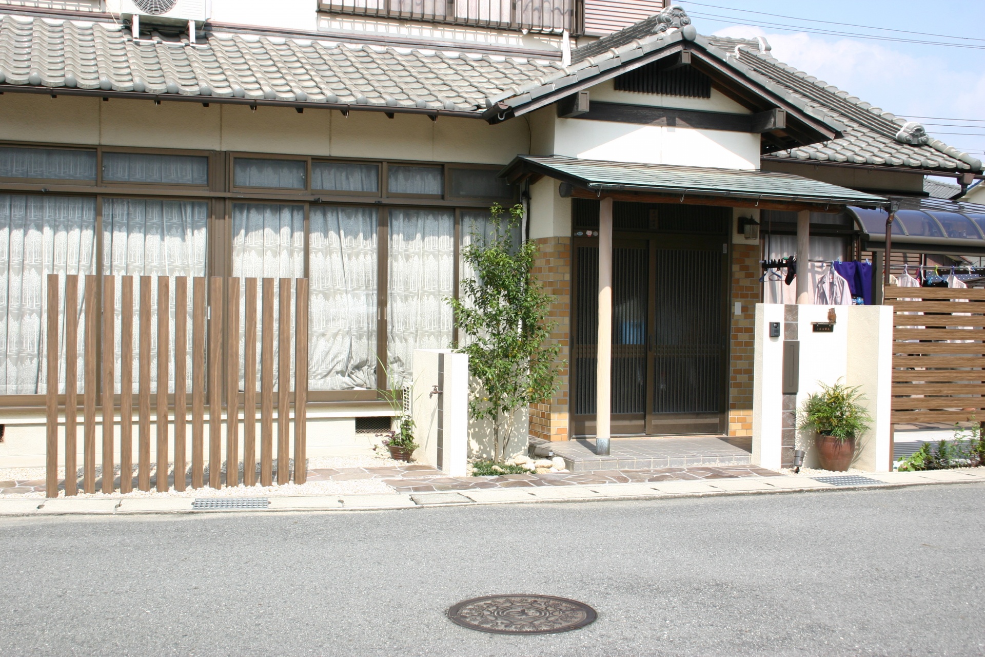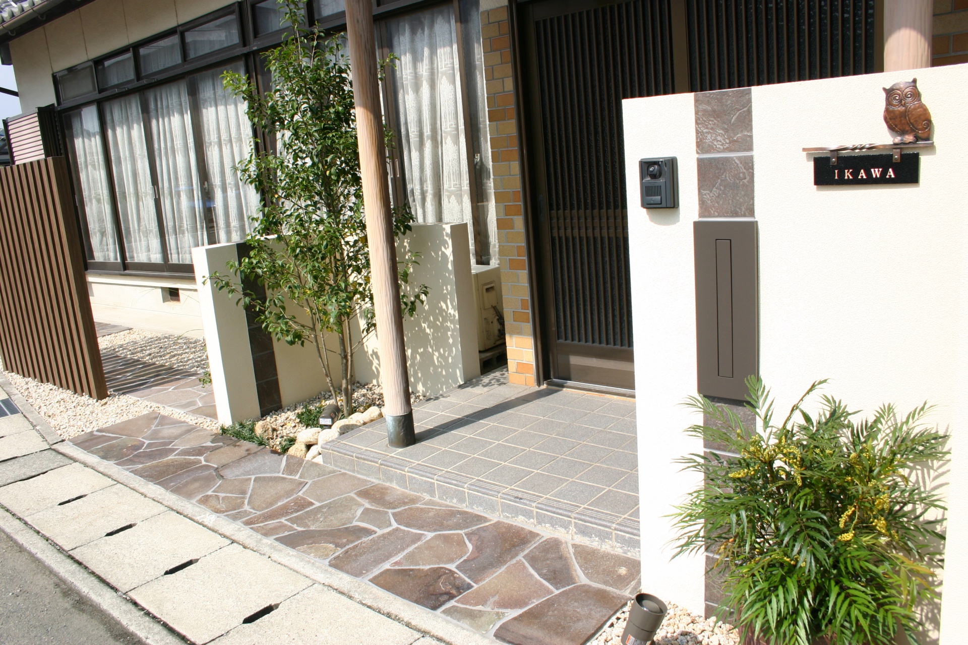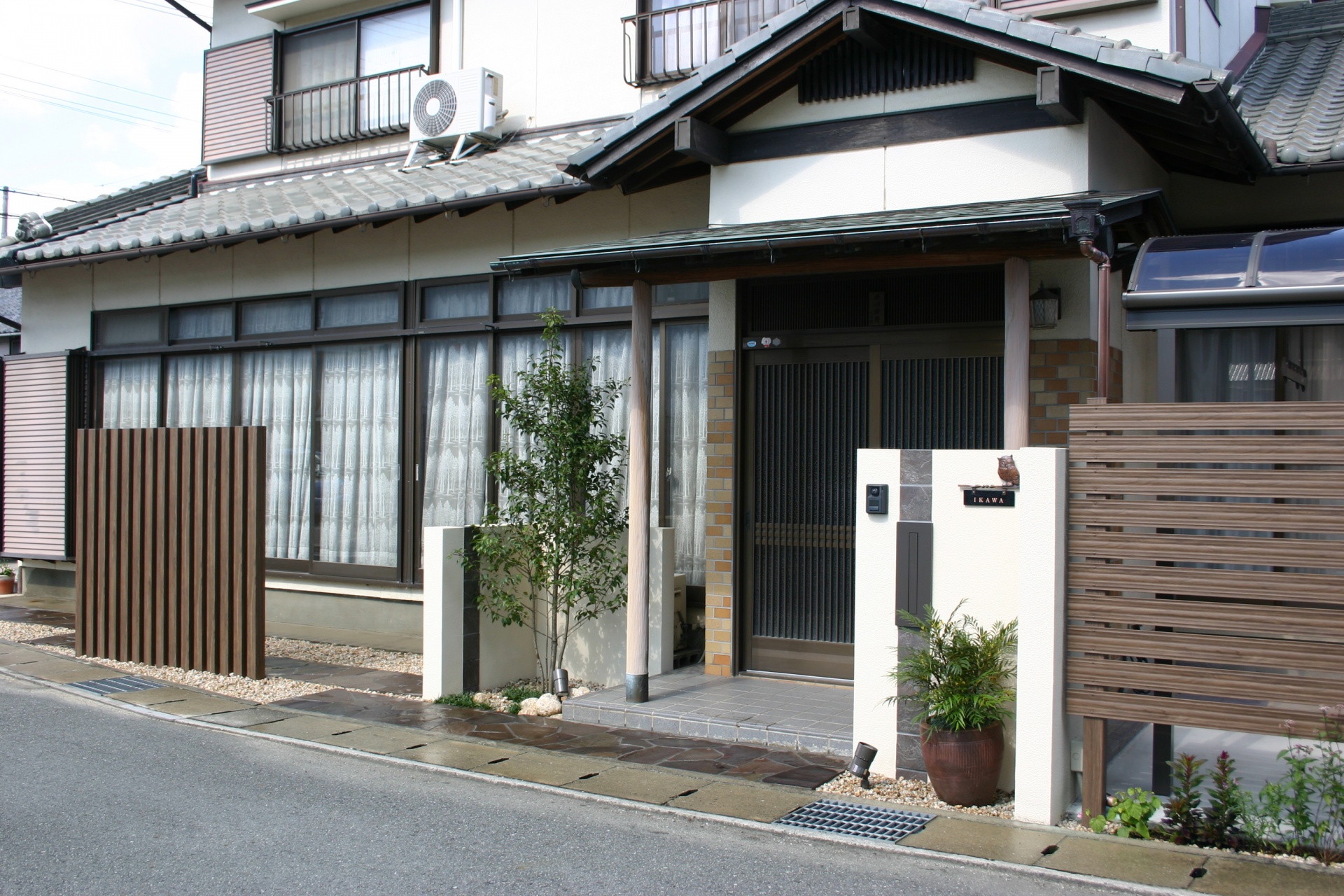 施工実績 和風テイストの落ち着いたモダン外構 たつの市エクステリア 和風の建物のタカショーアートウッドのフェンスを使用した和モダンテイストの外構施工例です。 アプローチには鉄平石の本格和風のこだわり。 アルミスリット木目フェンスがポイントです。 全景。