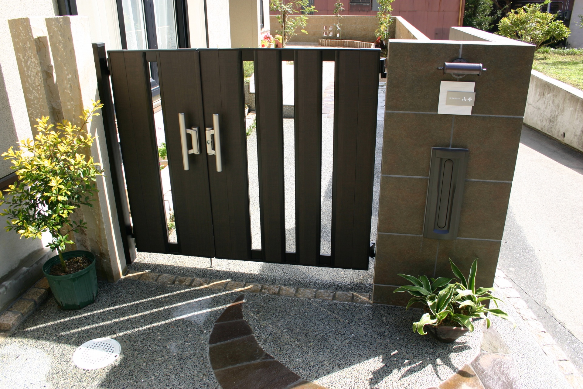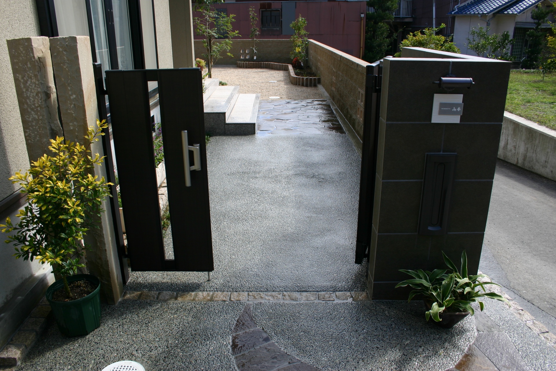 施工実績 タイル門柱の落ち着いたエクステリア たつの新築外構 タイルをポイントに取りいれたエクステリア門周りデザイン。月型のアプローチデザインが門柱足元のワンポイントになっています。木目調の高級感のある門扉が大人のエクステリアを演出してくれます。 美浜砂利を使用した自然石洗出しアプローチ仕上げで落ち着いた門周りをデザイン。 ライフモダンエクステリアに合わせた落ち着いたエクステリア門周り。
