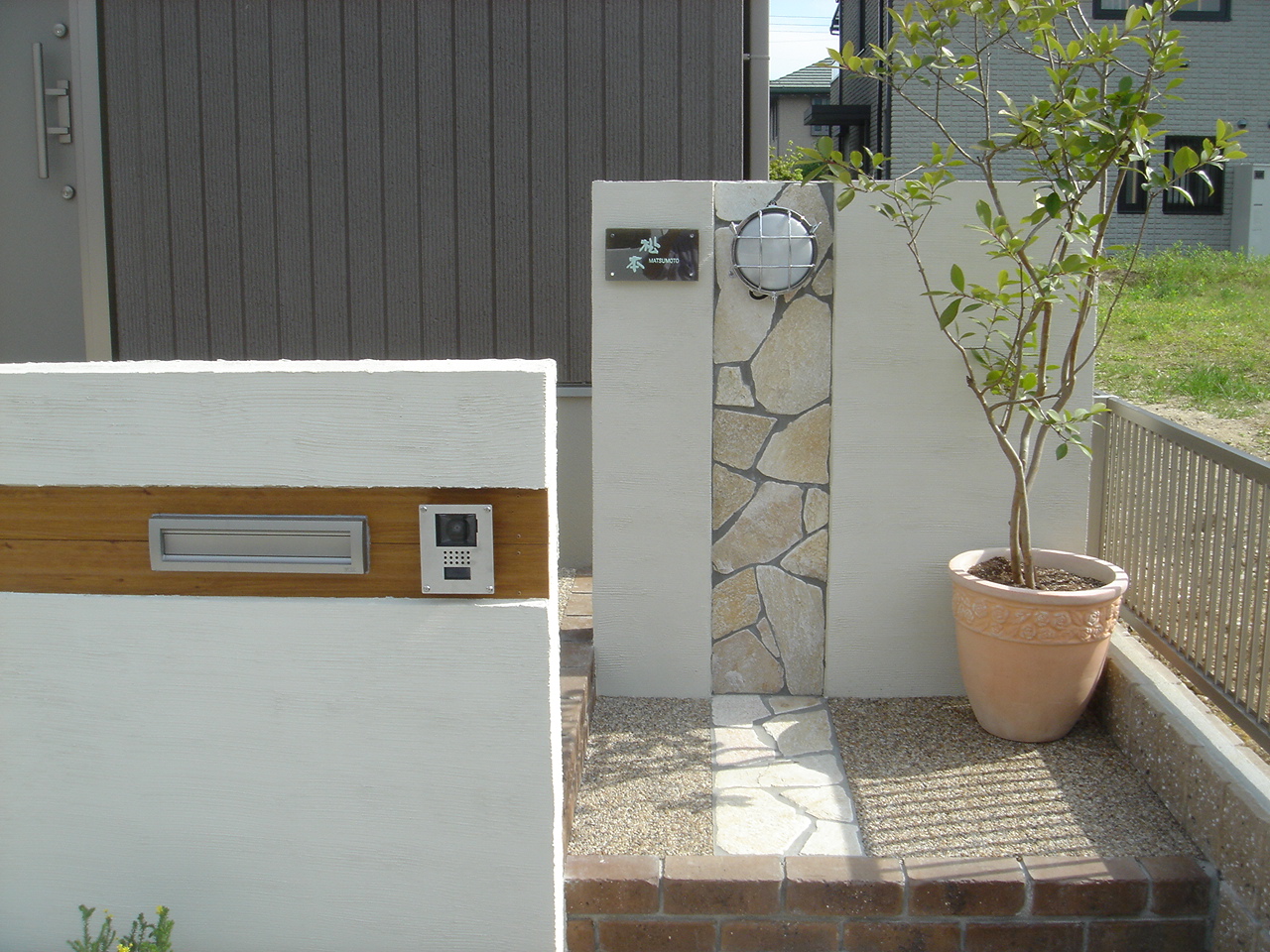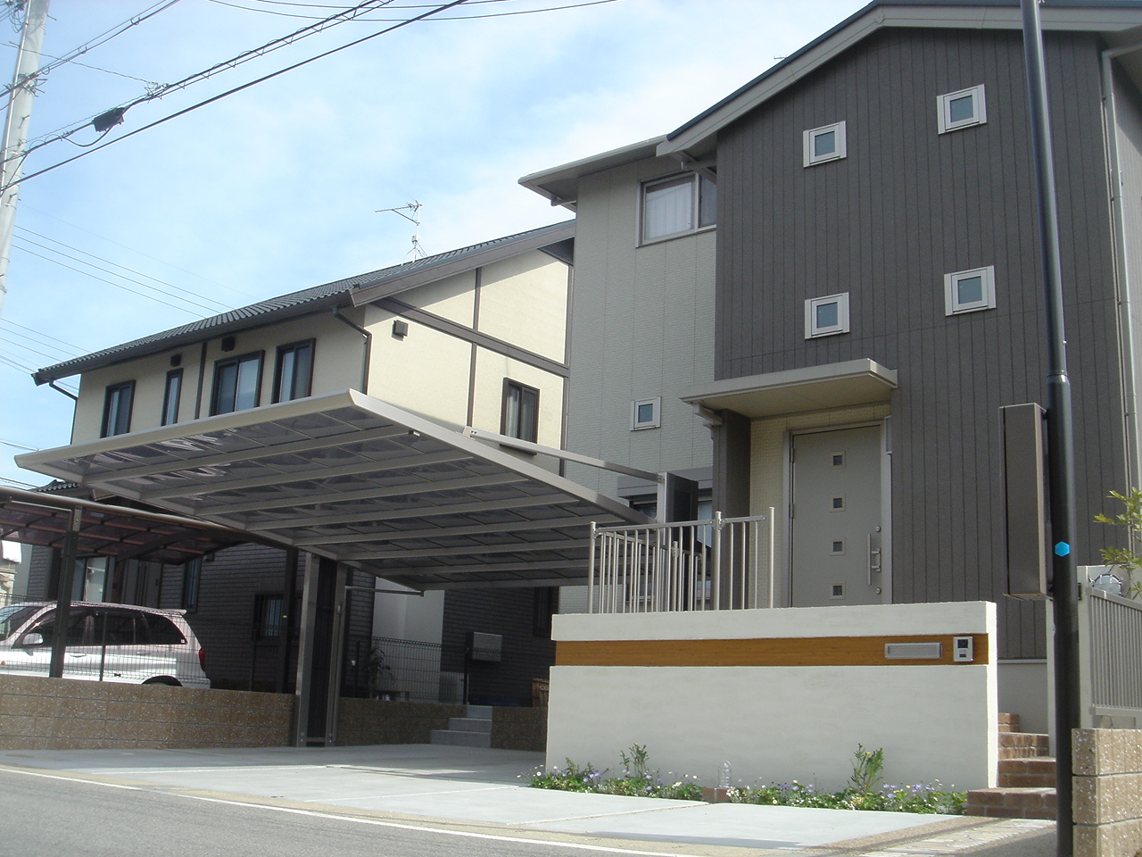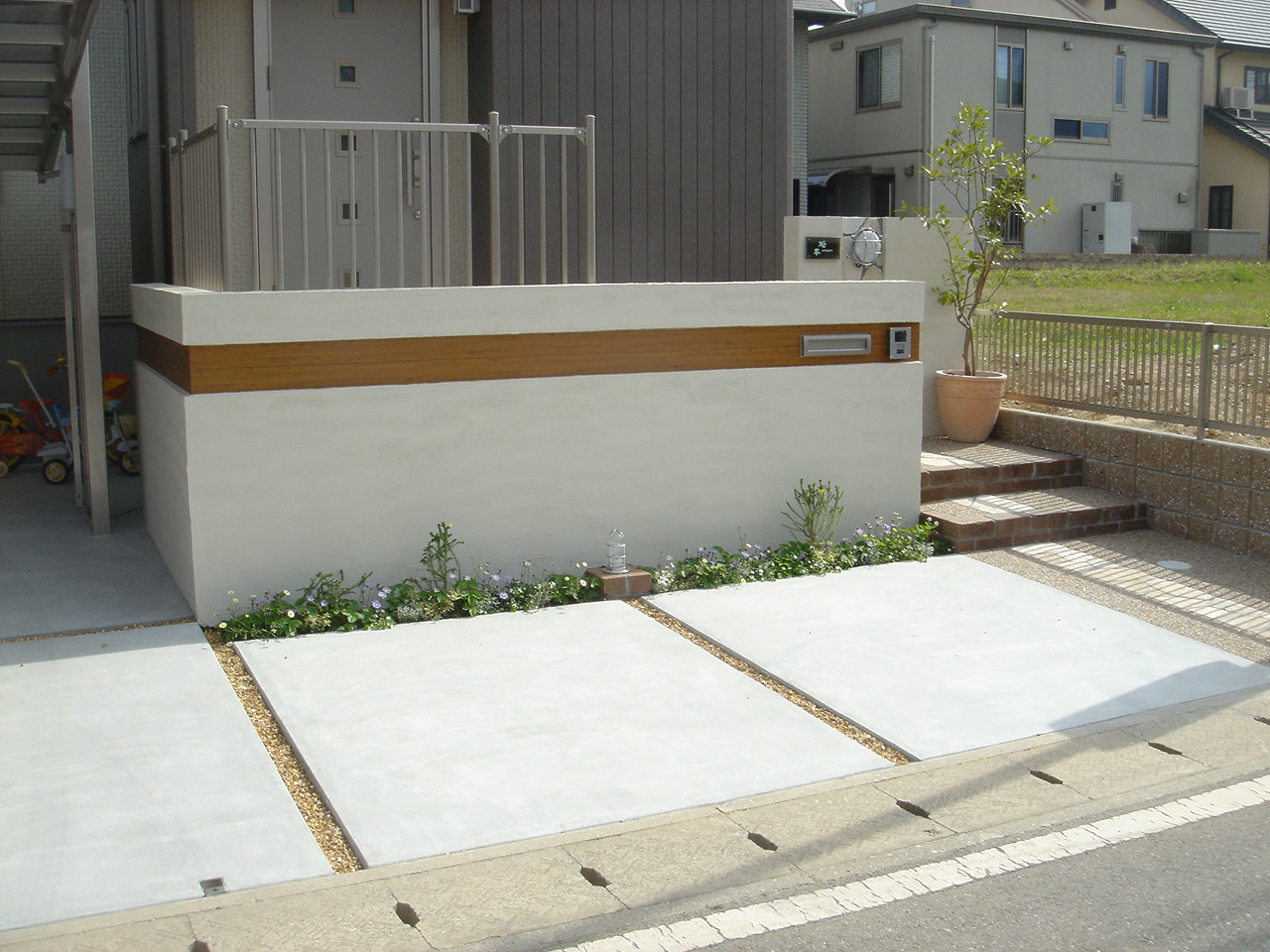 施工実績 ウッドナチュラルラインのエクステリア たつの市新築外構 水平ラインのウッドポイントにしたベーシックデザインエクステリア。サブスペースをセンス良く確保するため四国化成マイポートを使用したカーポート施工例です。 べージュ系のウォール前にグリーンのスペースを確保。 自然石乱貼りで縦のラインをデザイン。 全景エクステリア。