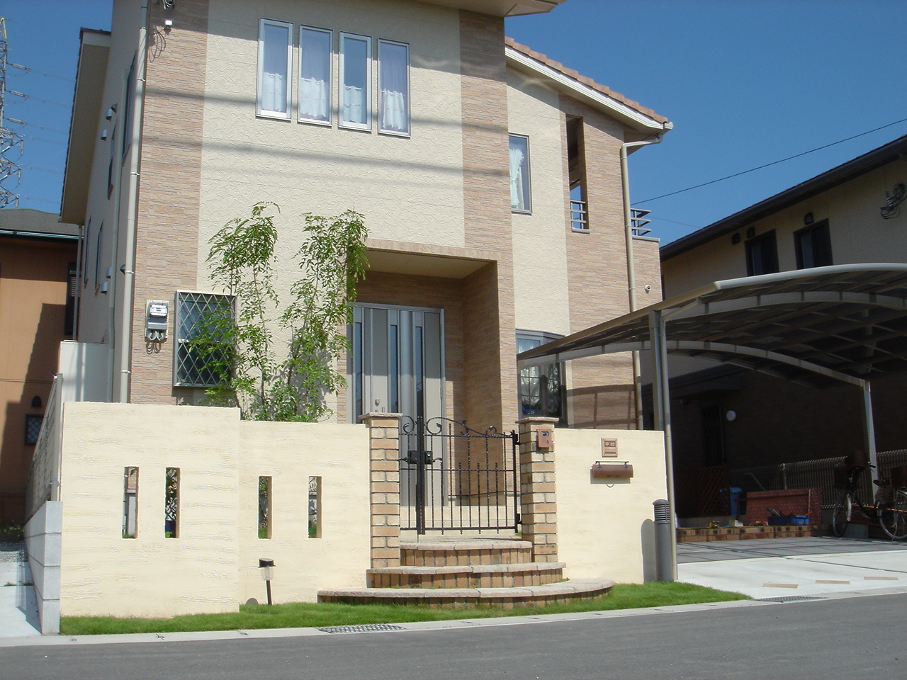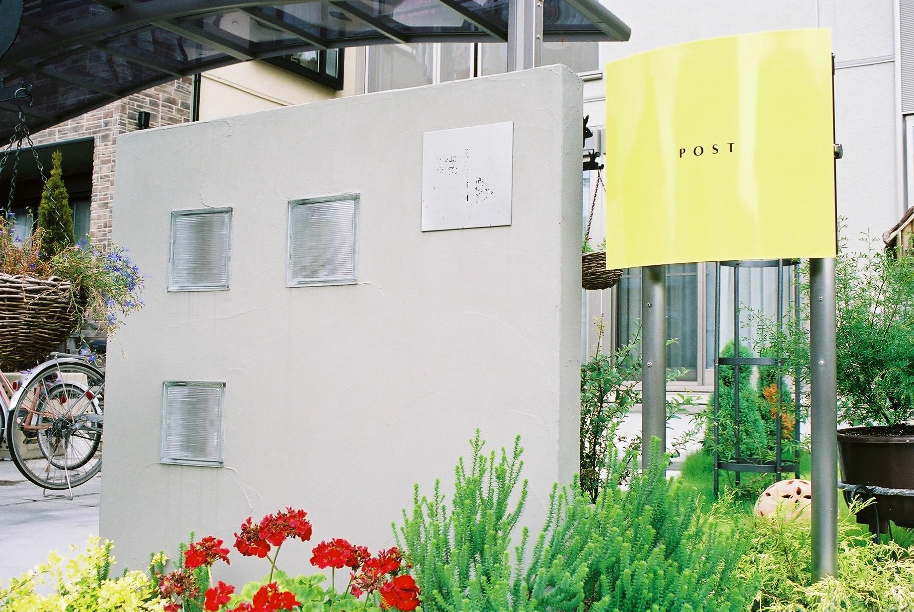 施工実績 落ち着いたグレーにイエローのドイツポスト スタイリッシュな建物のたつの市F様邸。グレーの落ち着いた塗壁にポイントとしてイエローのドイツポストをセレクトしました。美浜のグレーの洗出しもいい感じです。