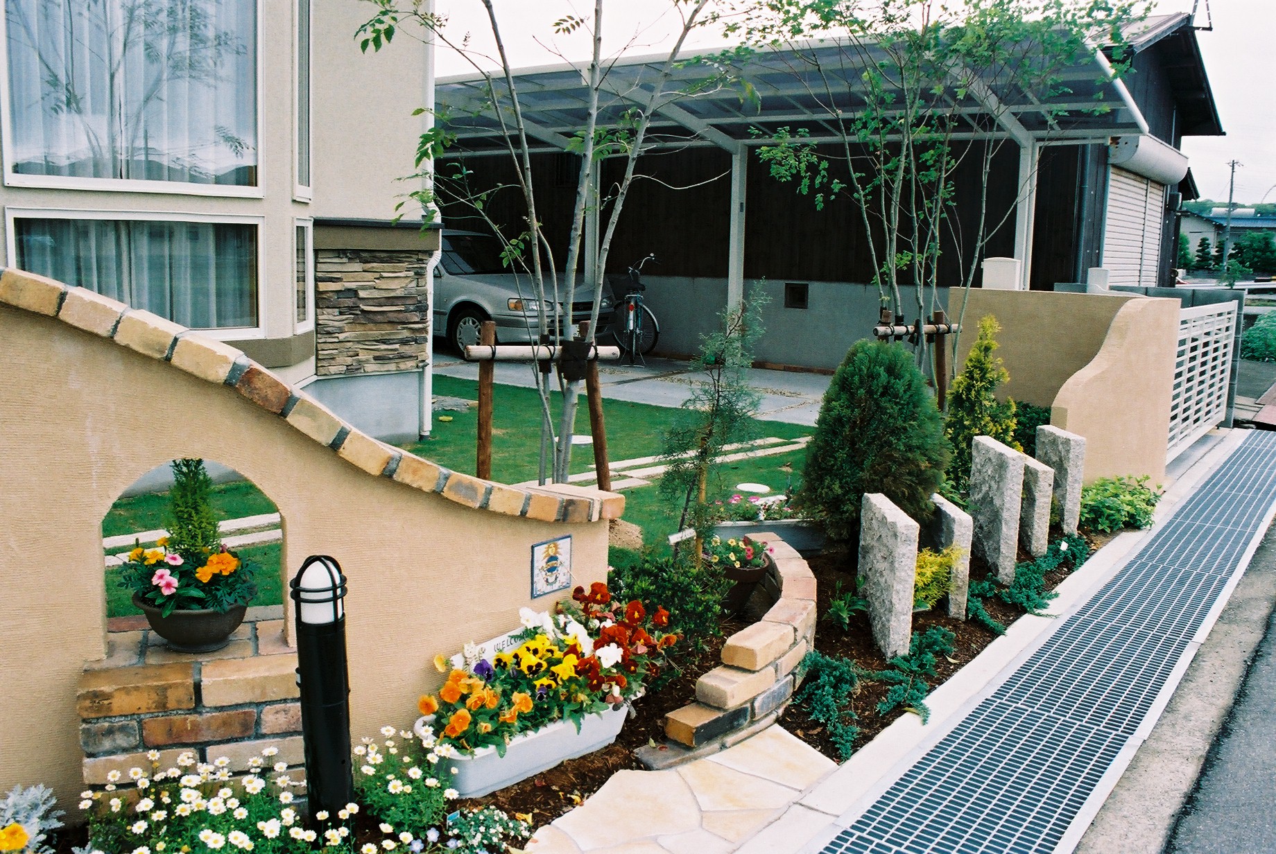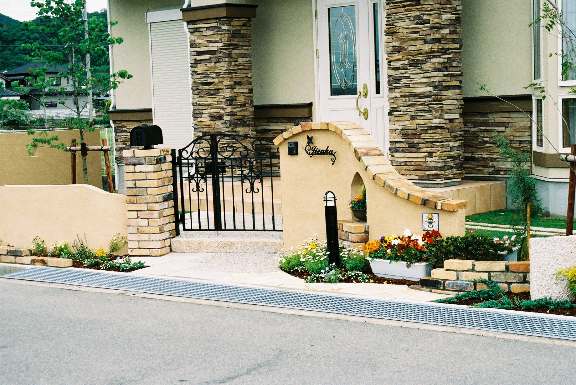 施工実績 レンガとグリーンのある暮らし コンセプトは建物を引き立てるグリーンのある暮らし。道行く人が楽しめるよう塀部はグリーンを多く取り入れました。アンティ―クレンガとソフトべージュの塗壁が印象的です。 自然石板石と立てた新しい感覚のデザイン。