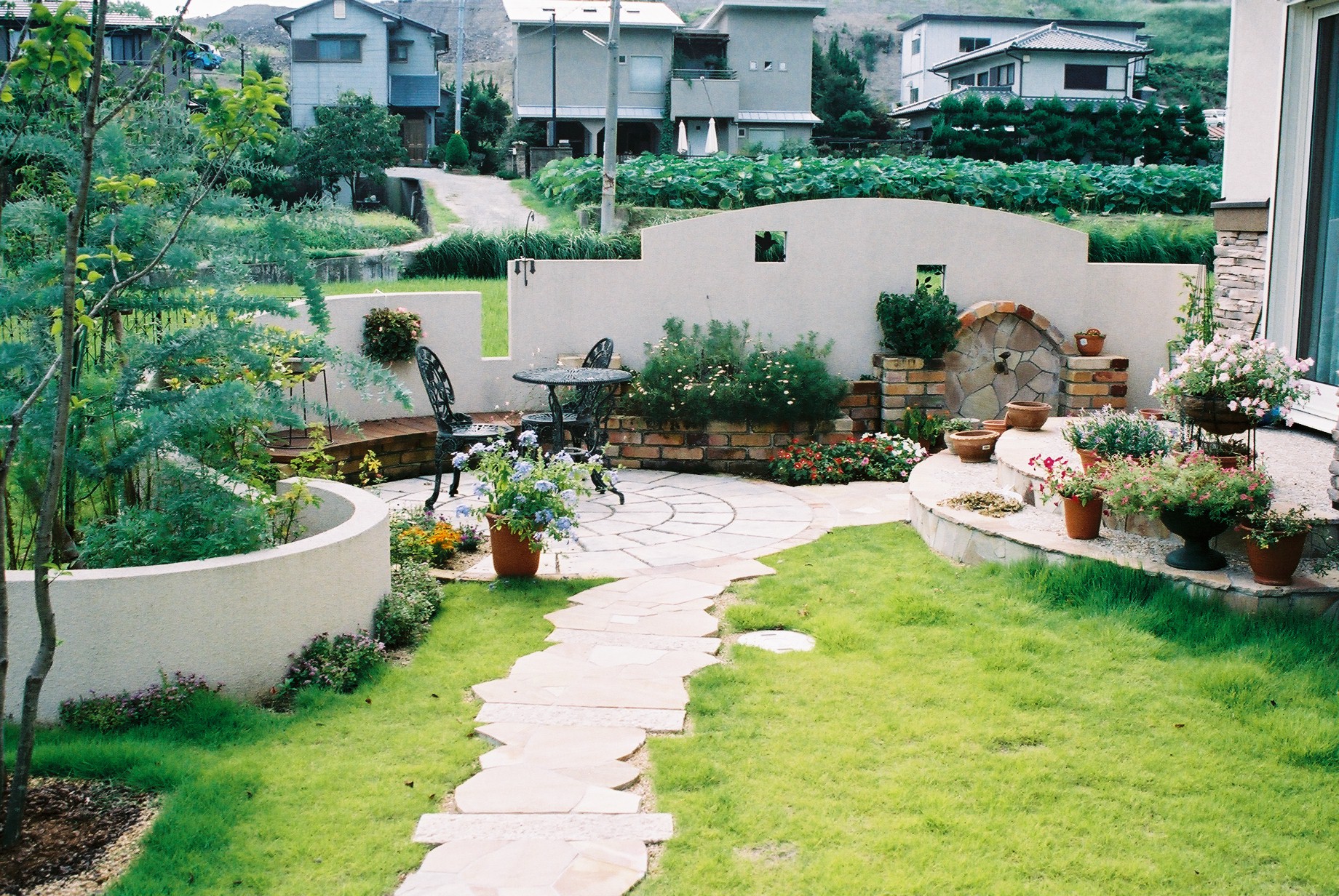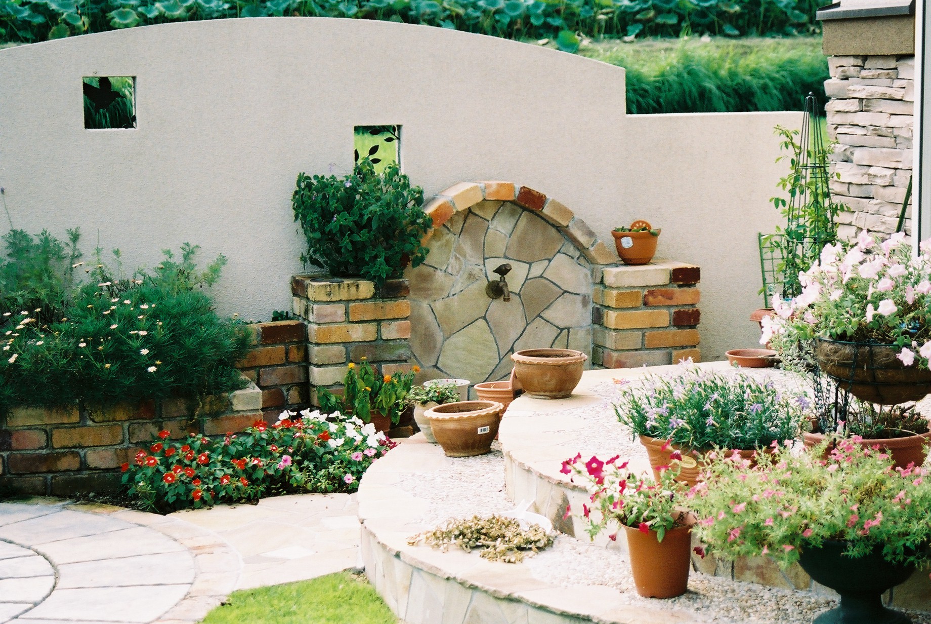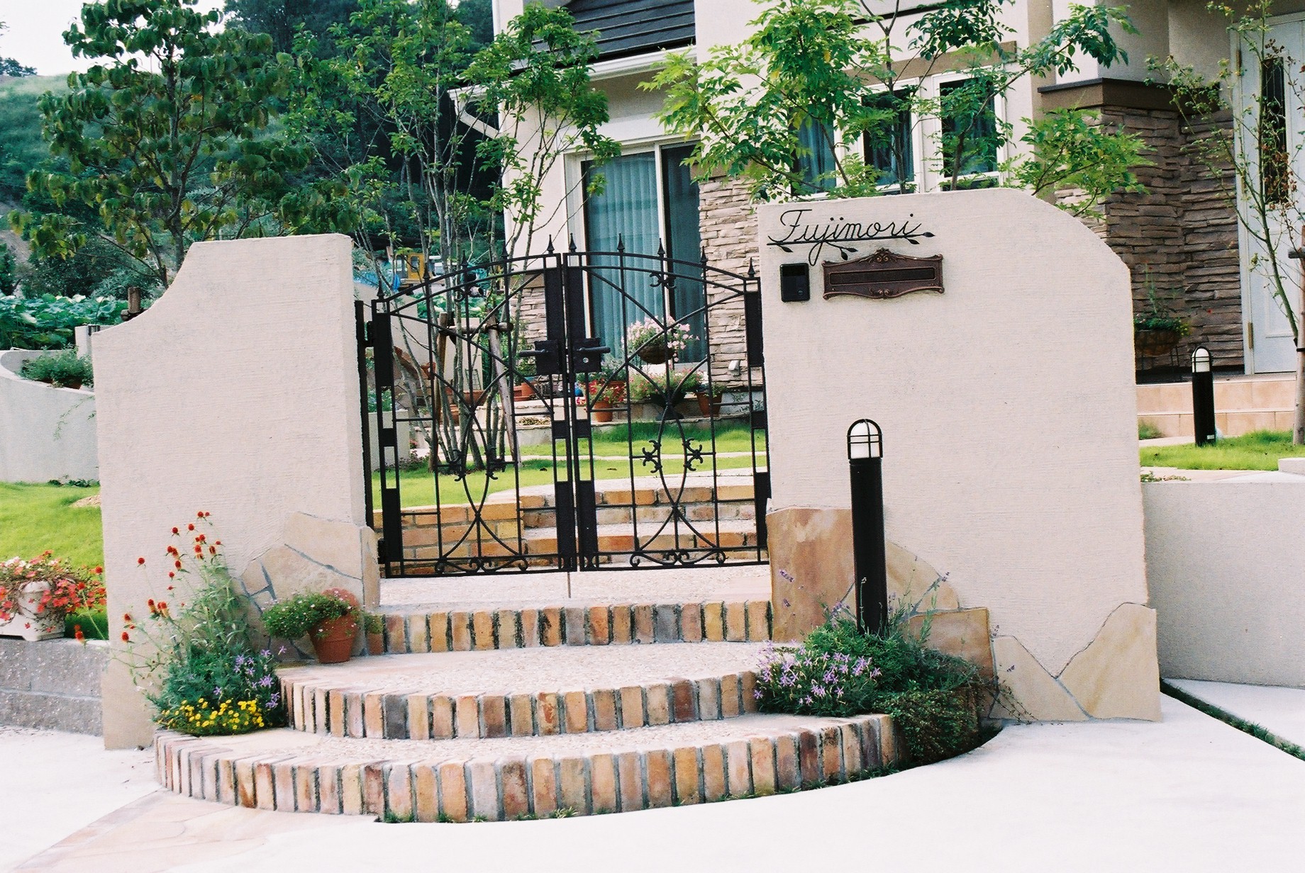 施工実績 ウエストコーストとプライベートガーデン 前面パーキングスペースの中央から入る門柱スタイルでデザインしました。古びた色合いを表現したオールドアイアン門扉が印象的です。 門まわり。オールドアイアンの門扉がオシャレですね。 オリジナルの立水栓は奥様のお気に入りです。 アプローチからのアングル。自然石の小道が庭へエスコートしてくれます。