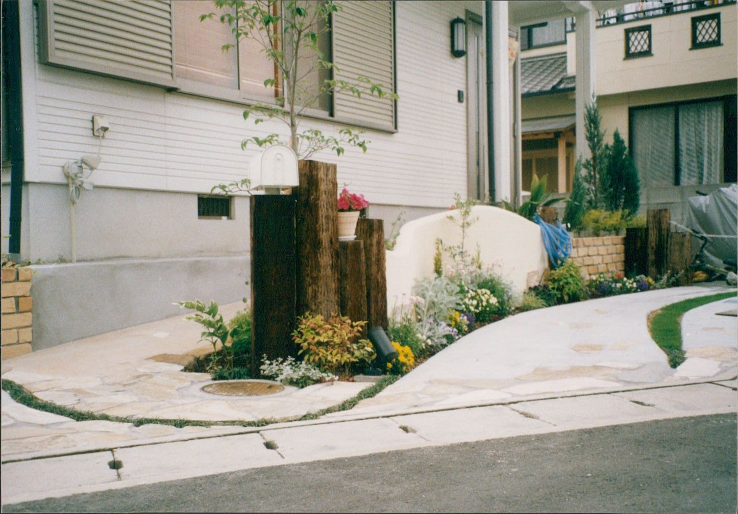 本物の枕木を使用した門柱です。月日と共に風合いが出てきます。